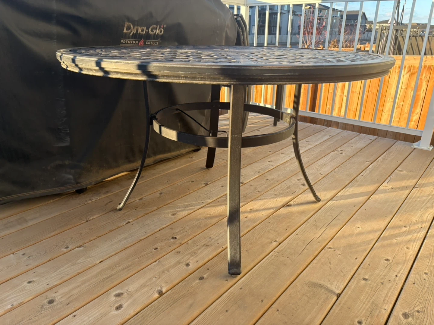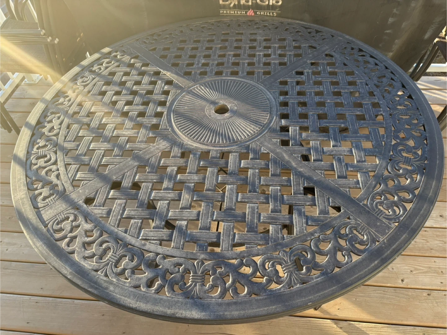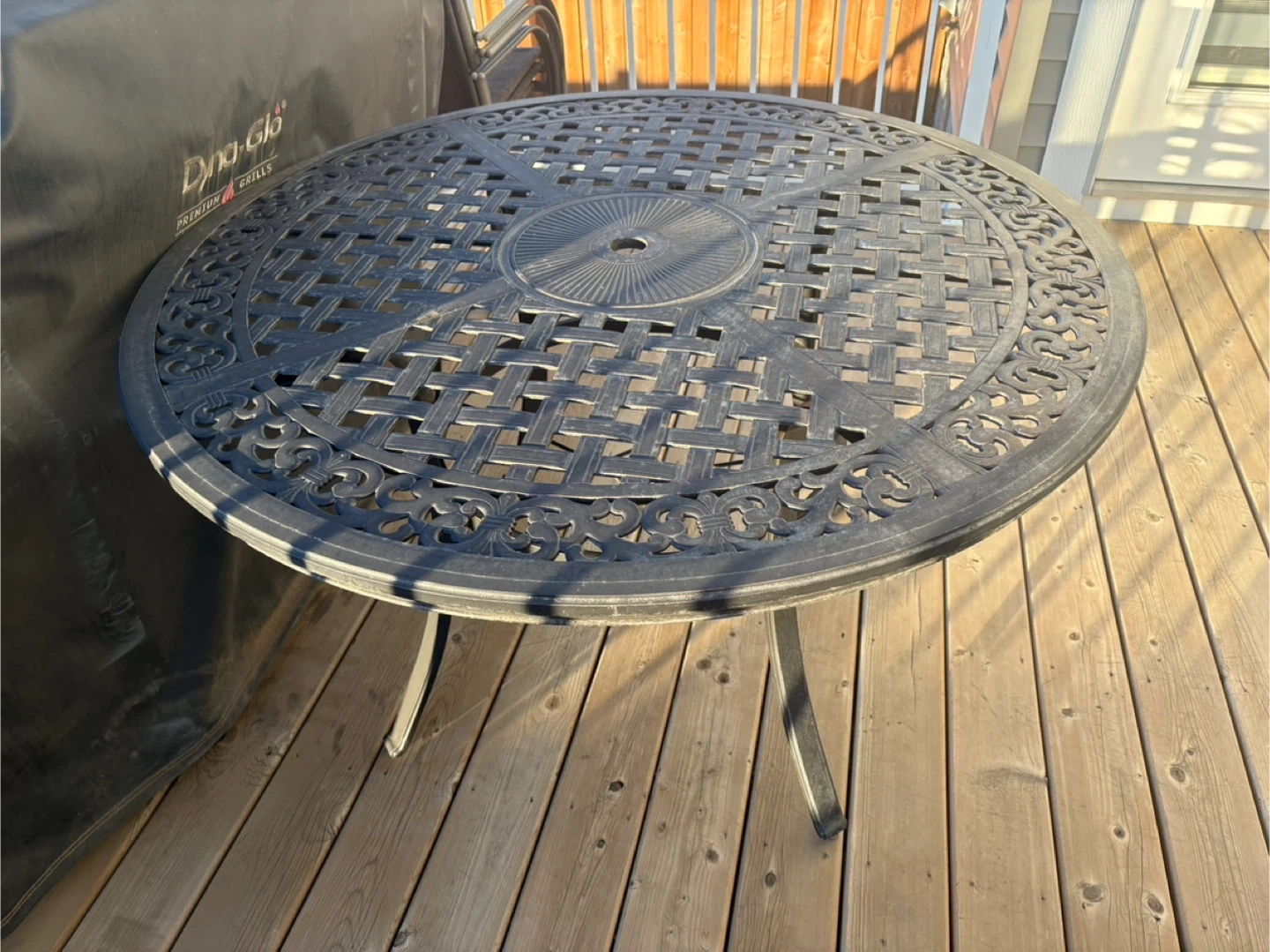 108Selling a metal patio table and 6 chairs set. The set is in good condition and perfect for enjoying the outdoors. The table has a nice woven design on top. The chairs are stackable for easy storage. Pick up only Open to offers *It also has an umbrella but the rope to crank the umbrella to open and close snapped. If you would like it anyways I can include it*