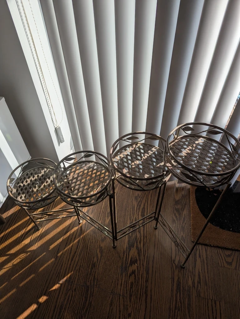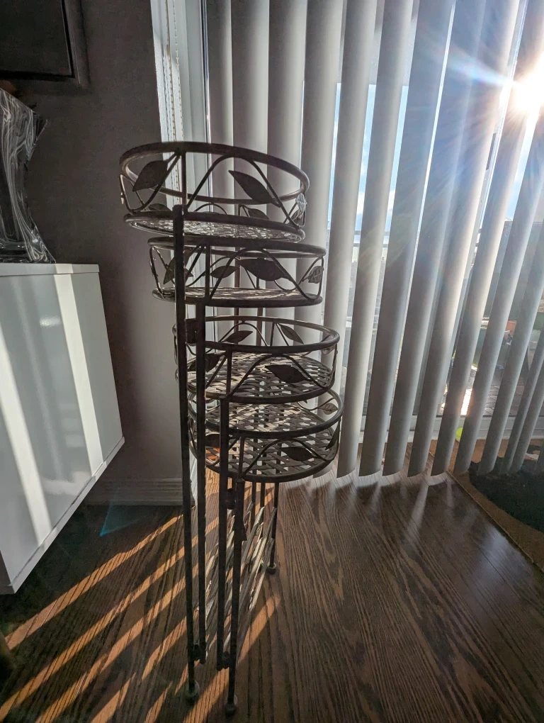 Buy & SellMetal Plant Stand with 4 Tiered ShelvesMetal Plant Stand with 4 Tiered Shelves$35Selling a metal plant stand featuring four tiered shelves. The shelves have a woven design, and the stand has decorative leaf accents. Each shelf is approximately 8 inches in diameter.ConditionLike new1 chats·3 favorites·34 viewsSELLERMariaVaughan120 reviewsWHERE TO MEETCheck Location