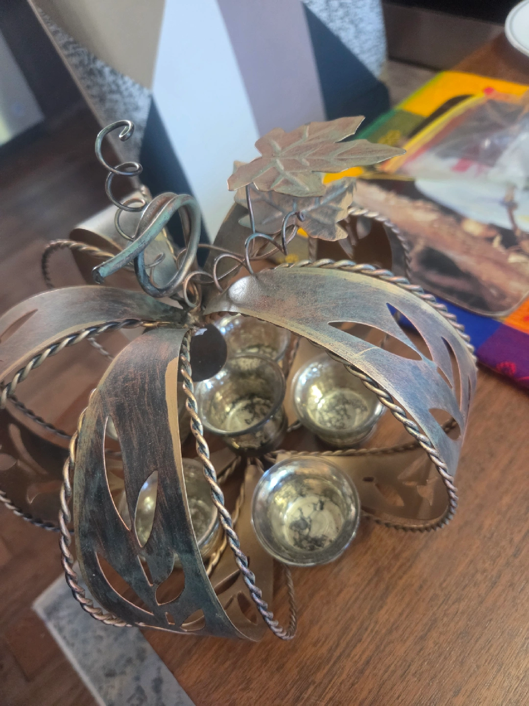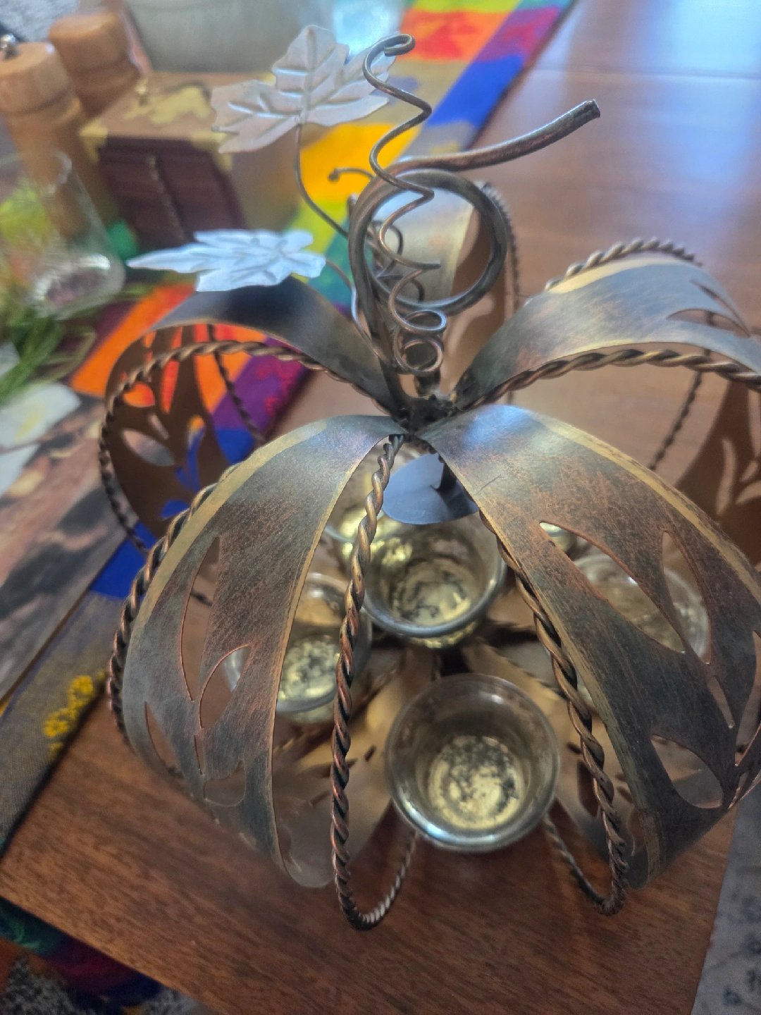 10This metal pumpkin candle holder is perfect for adding a touch of fall to your home. It has a unique design with leaf accents and holds multiple tea light candles. It's a great centrepiece for your table or mantel during the autumn season