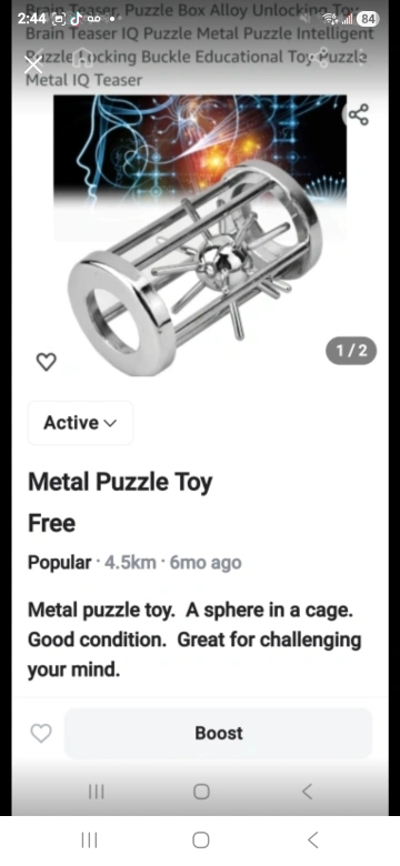 234Metal puzzle toy, described as a sphere in a cage. It's in good condition and great for challenging your mind!