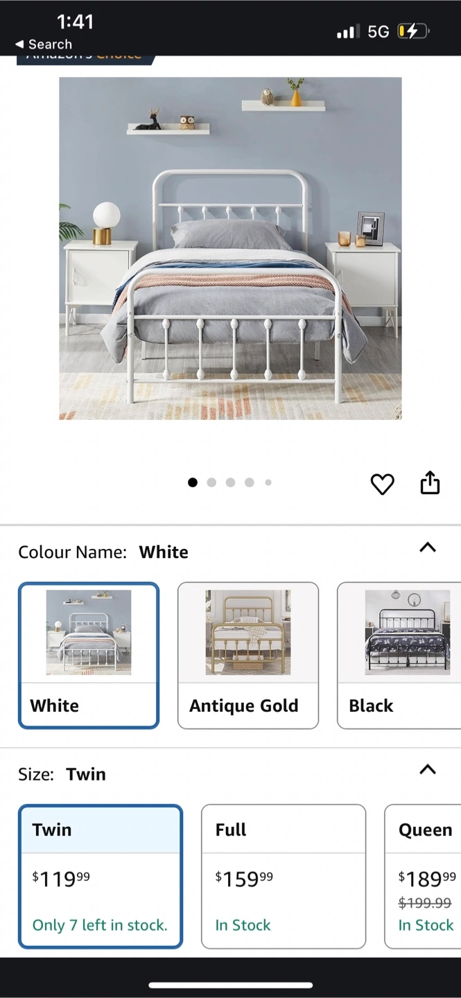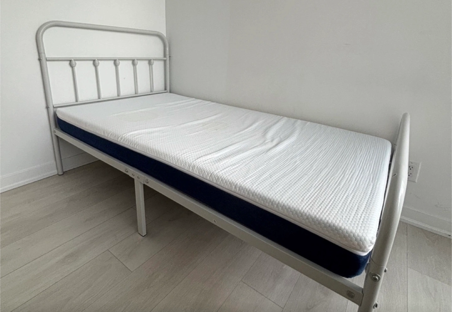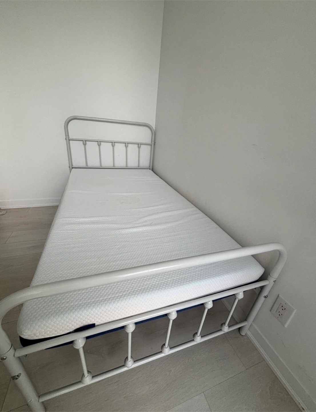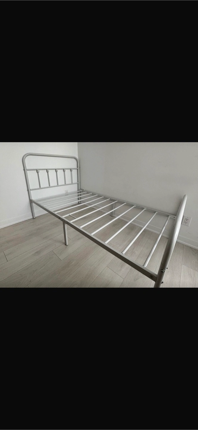 10White metal single bed frame. Minimalist design. Durable construction. Easy assembly. Good as new. Had to get a double bed frame but got a twin frame instead.