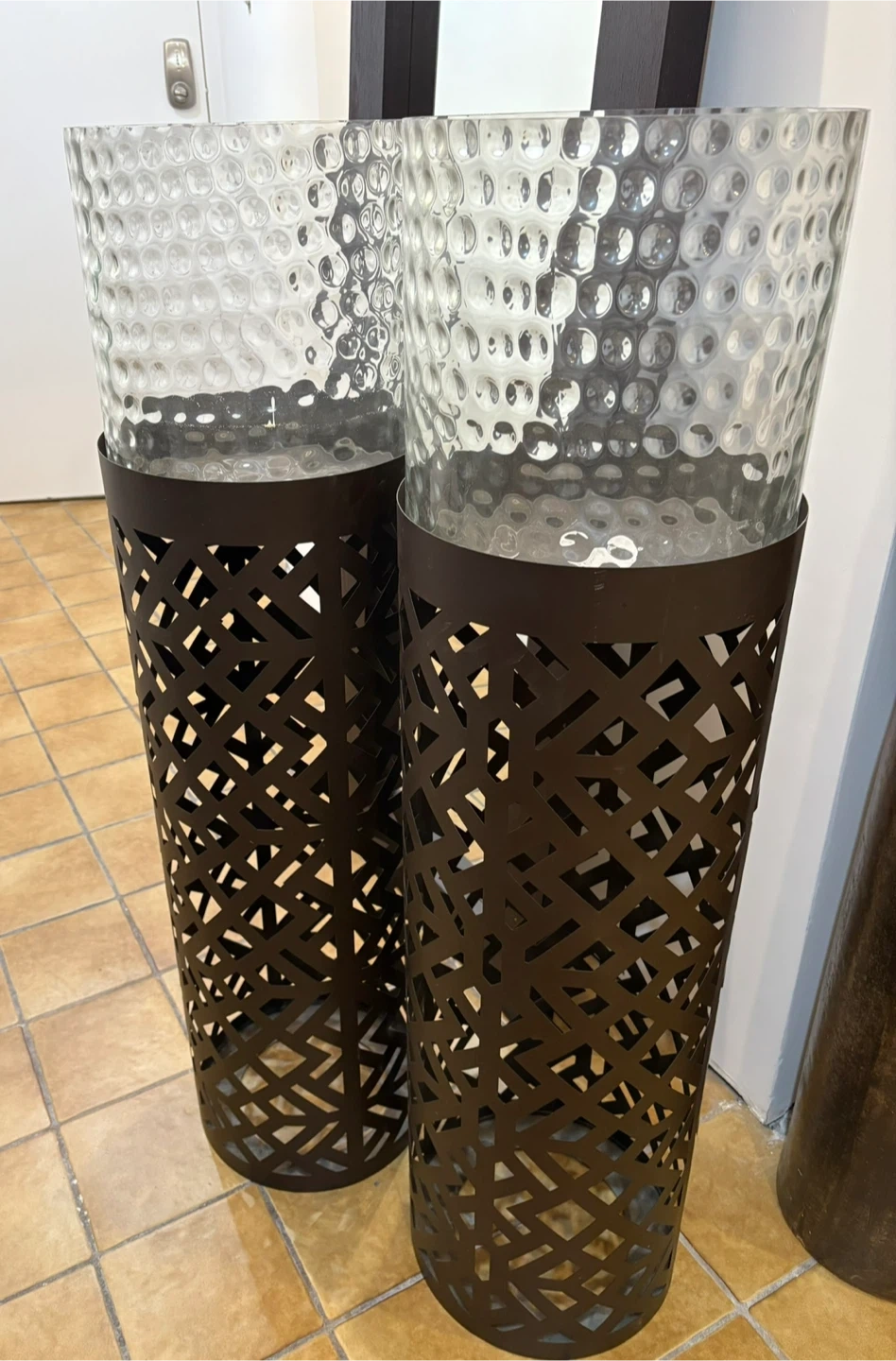 2 Large stands made out of metal and glass. Unique pieces. Glass is removable. Purchased at Pier One. I put sand in them with large candles…gorgeous! No scratches or chips. Can meet in Sarnia. Dimensions: 45 inches high, 11.5 diameter. SF home. Asking 250.00 OBO
