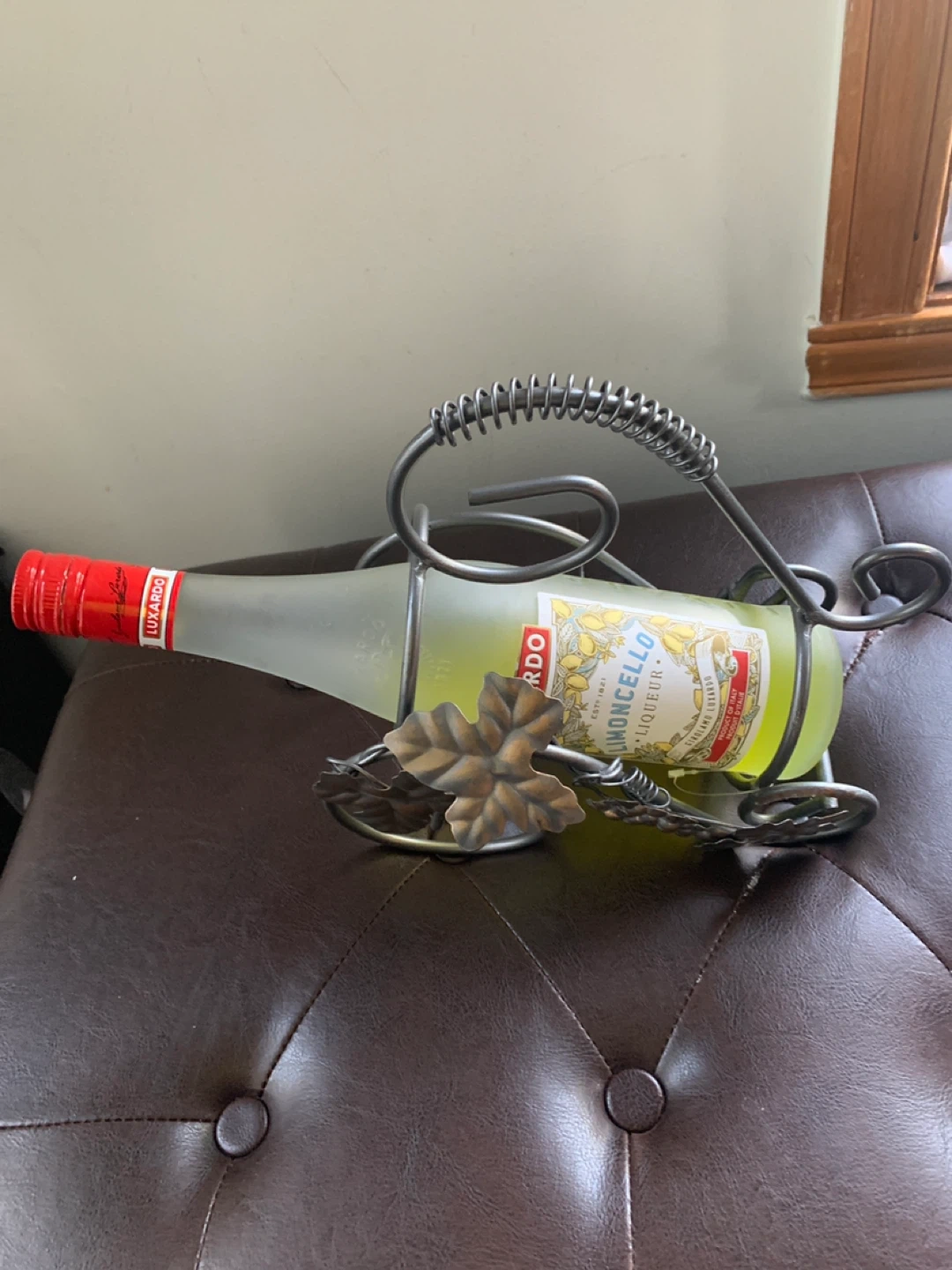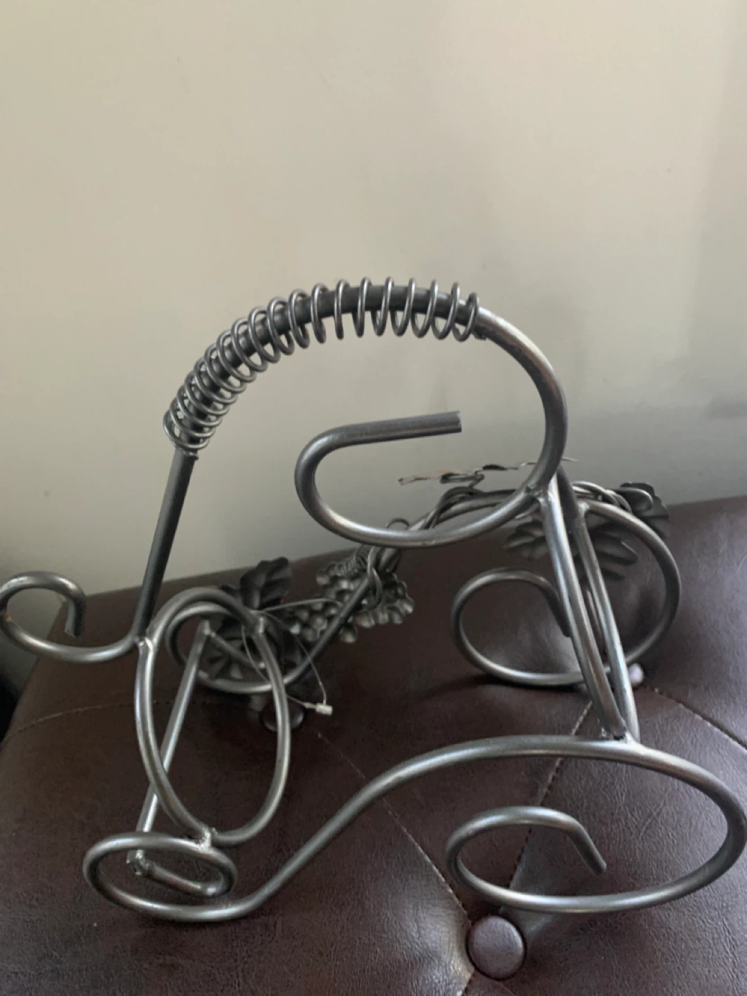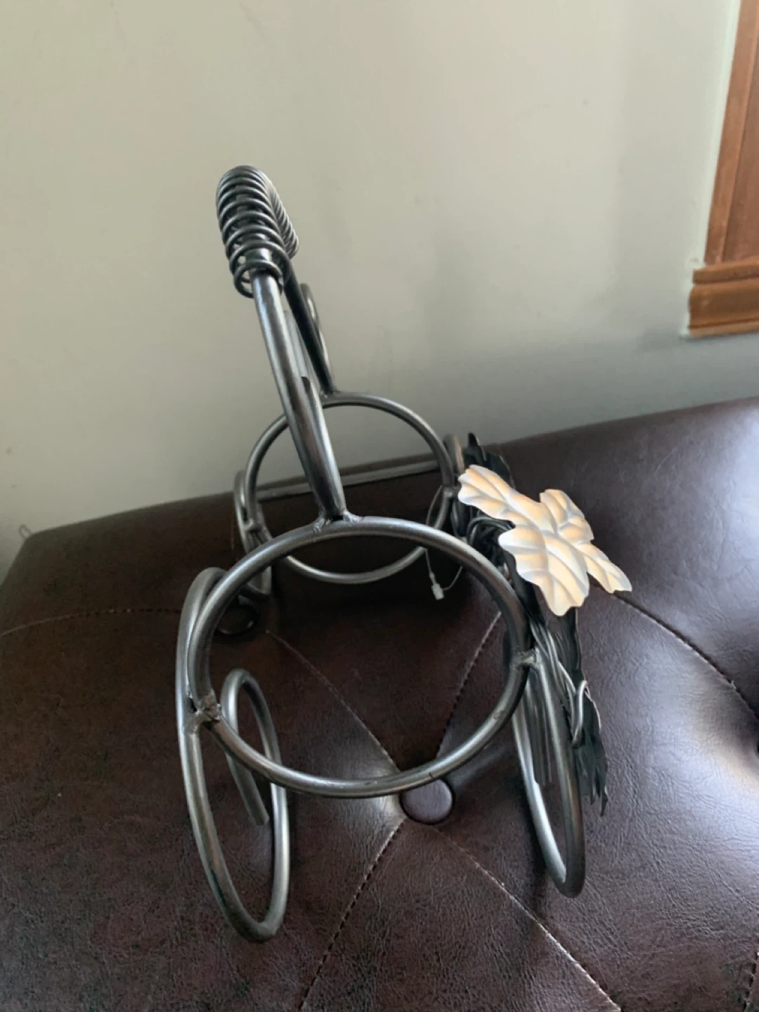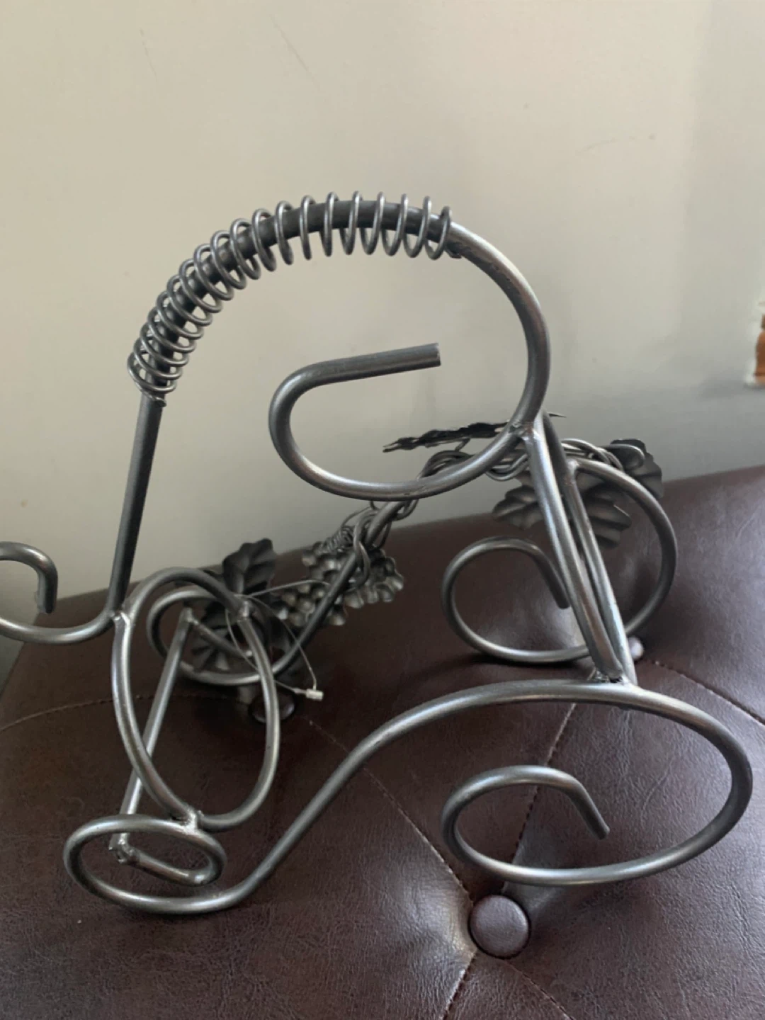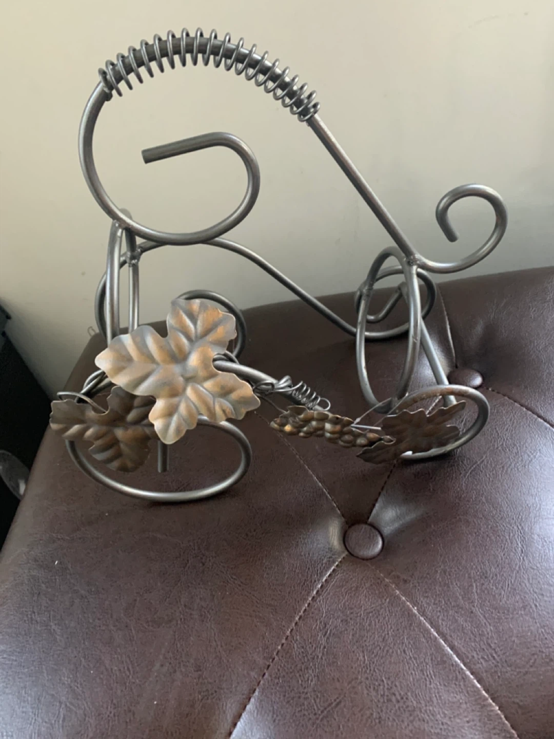 Here's a charming metal wine rack, perfect for displaying your favourite bottle! It features a unique leaf and grape design, adding a touch of elegance to any space. It's in great shape and ready to be used