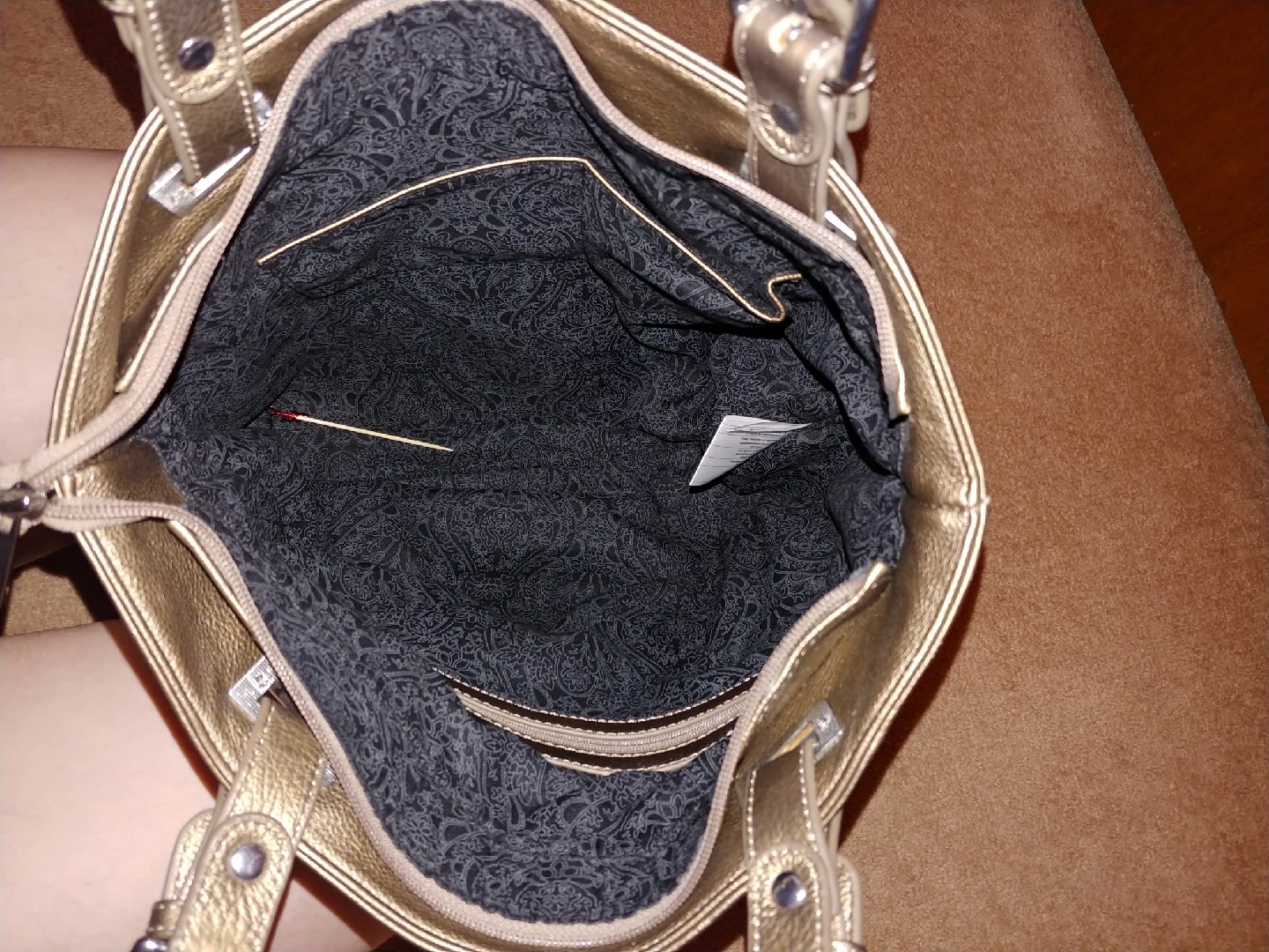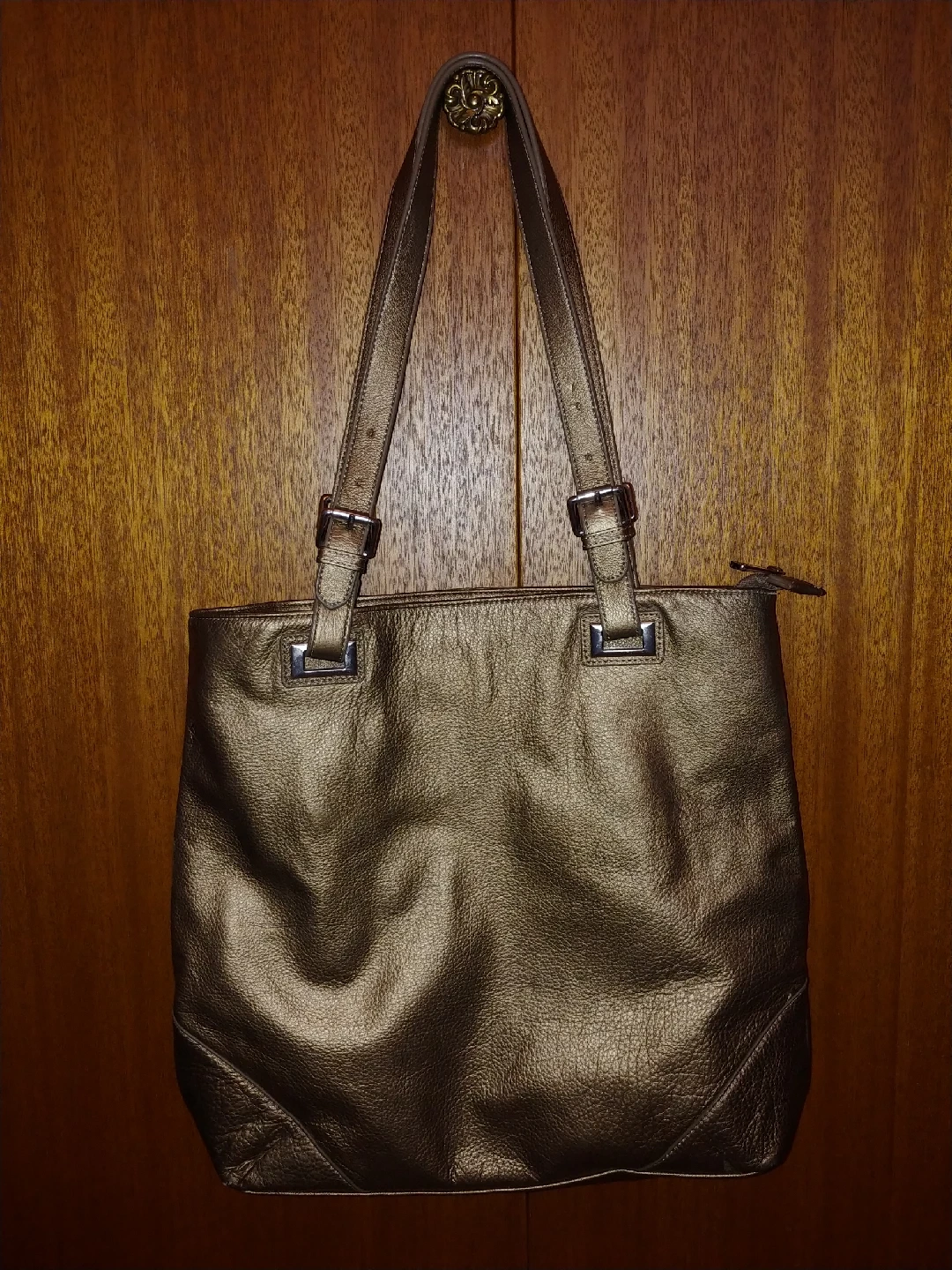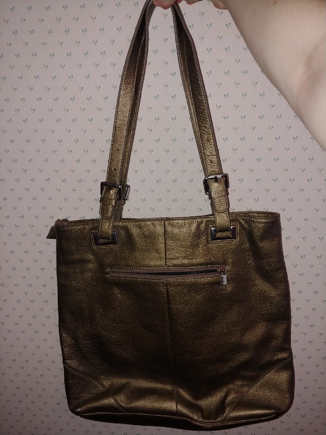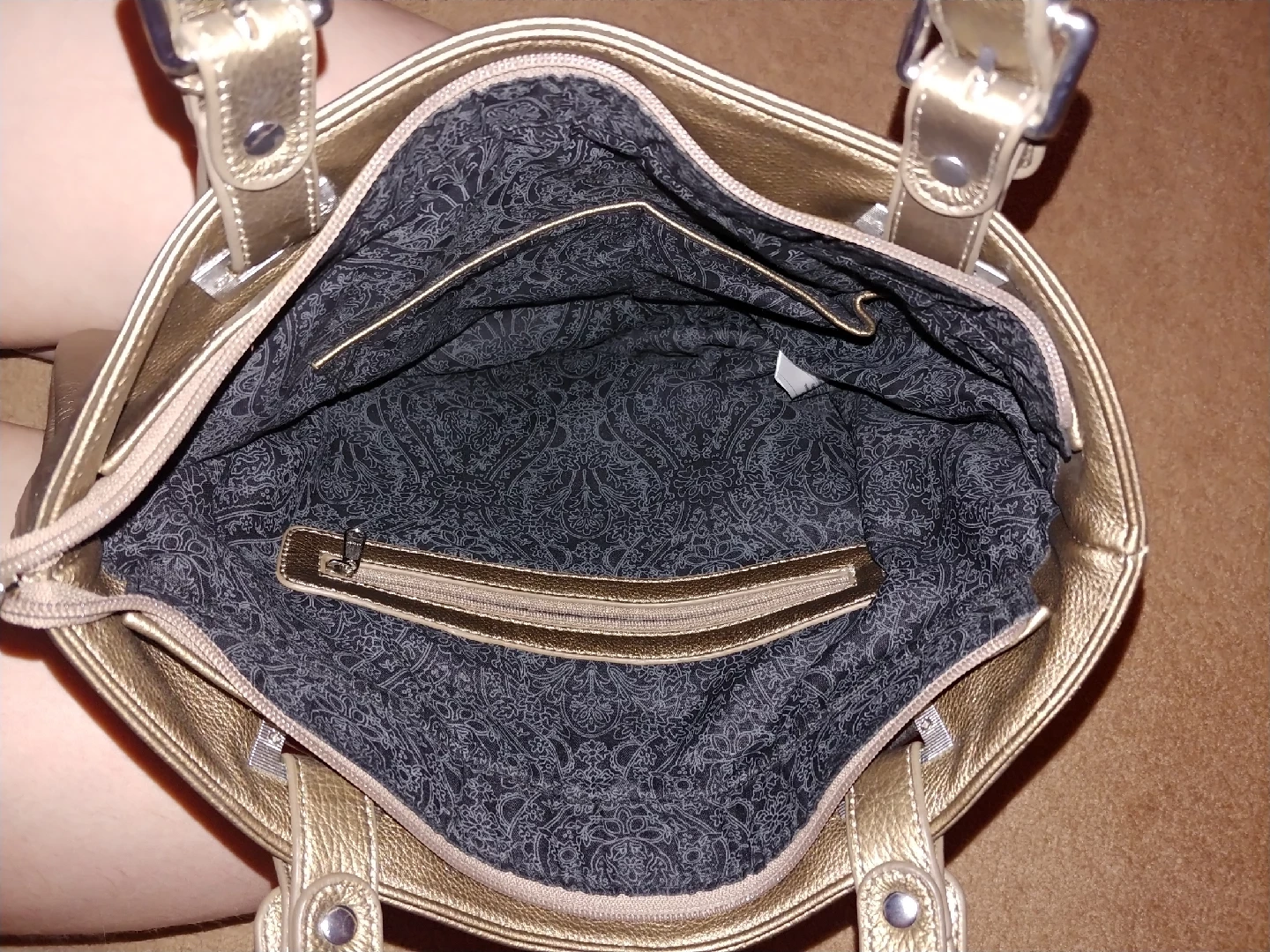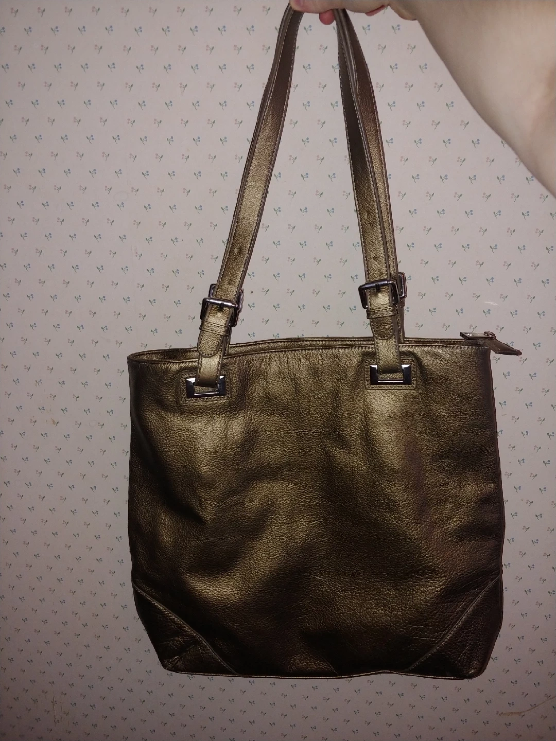 17Selling a metallic gold tote bag! It has a zipper closure and a patterned interior lining. The bag has two straps and silver hardware. Barely ever used and in fantastic condition