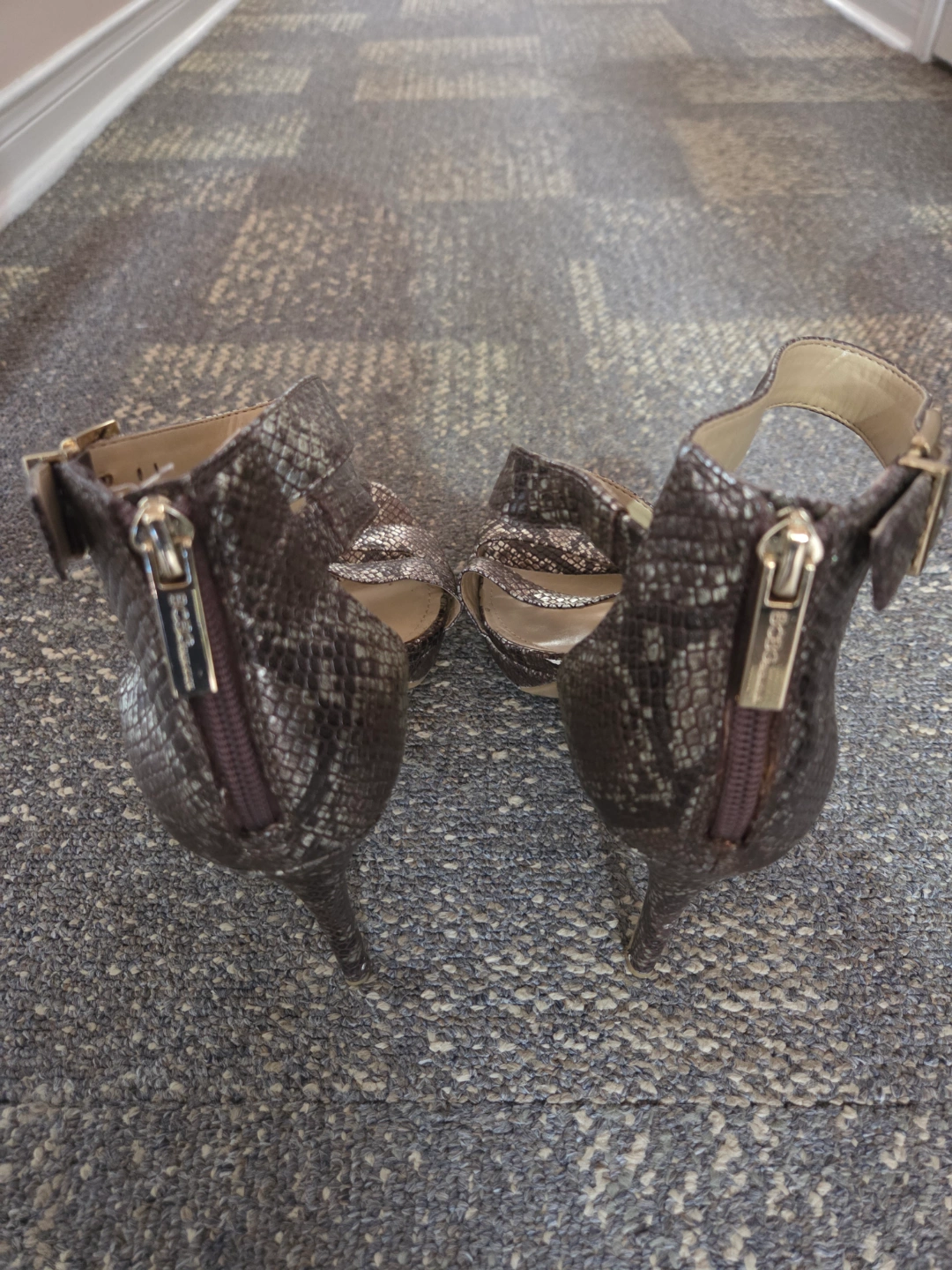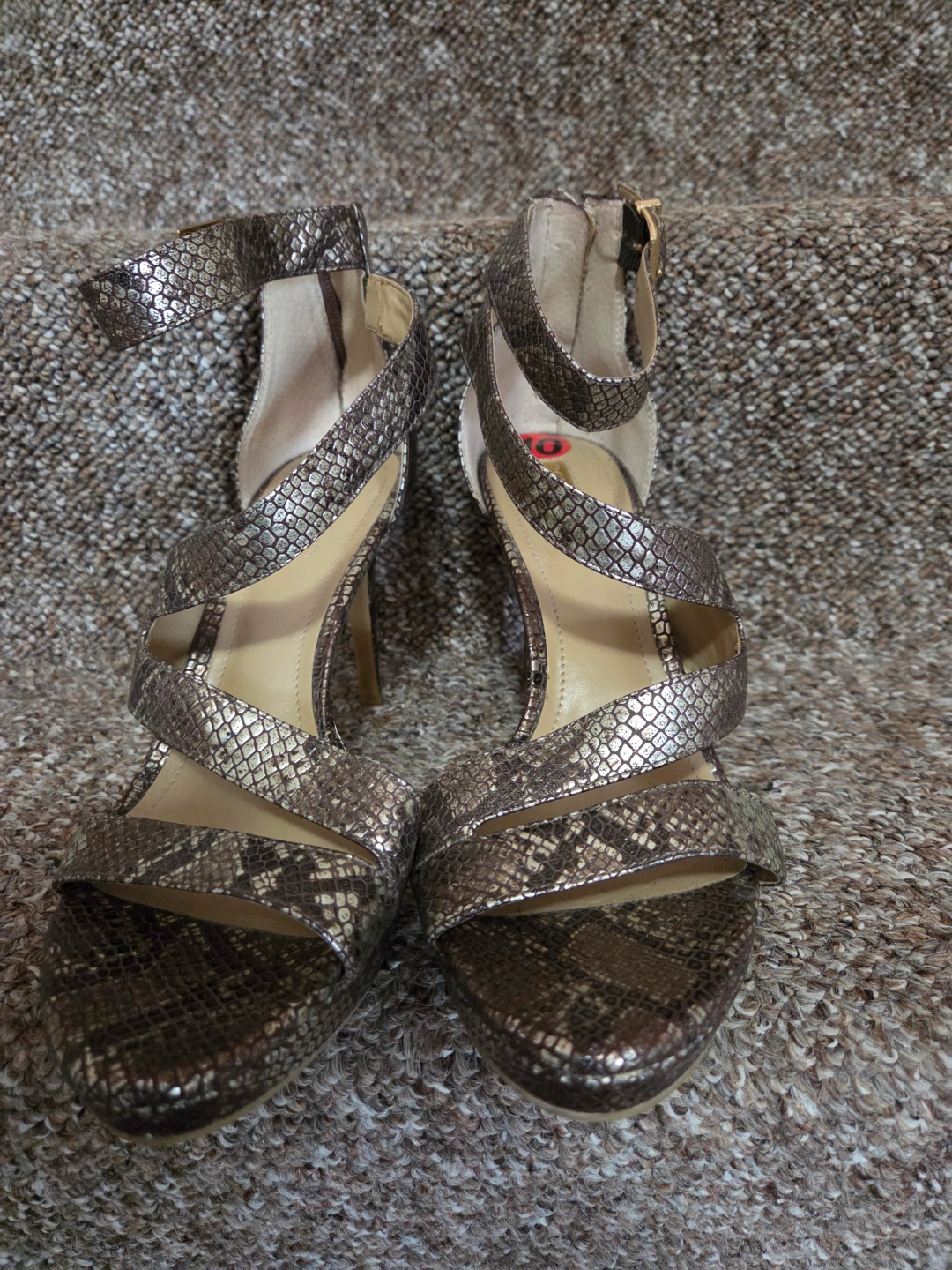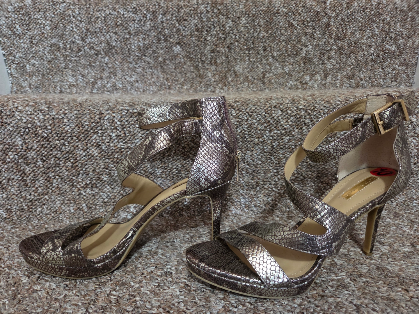 Sandals with a metallic snakeskin pattern. Ankle straps with buckles. Features a zip closure at the back. A great choice for adding some extra glamour to your outfit.