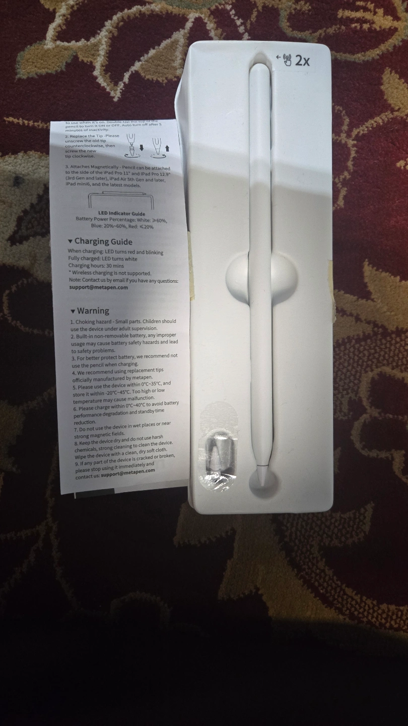 New stylus, two replacement tips included. Compatible with select iPad models. Charging instructions included.
