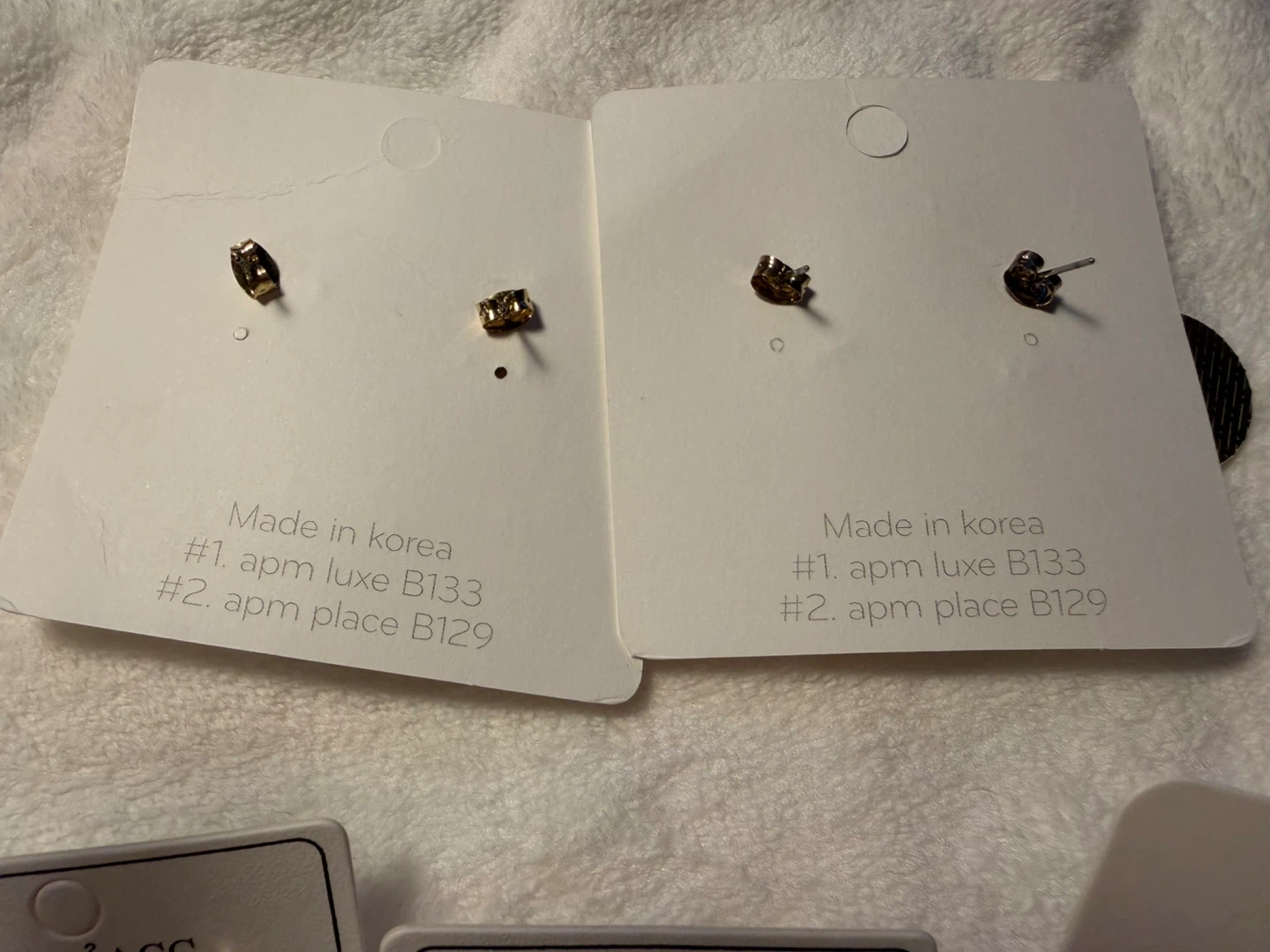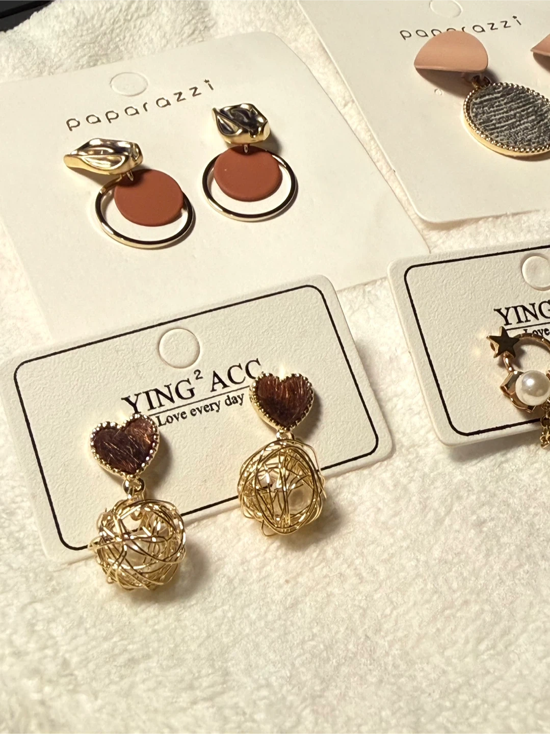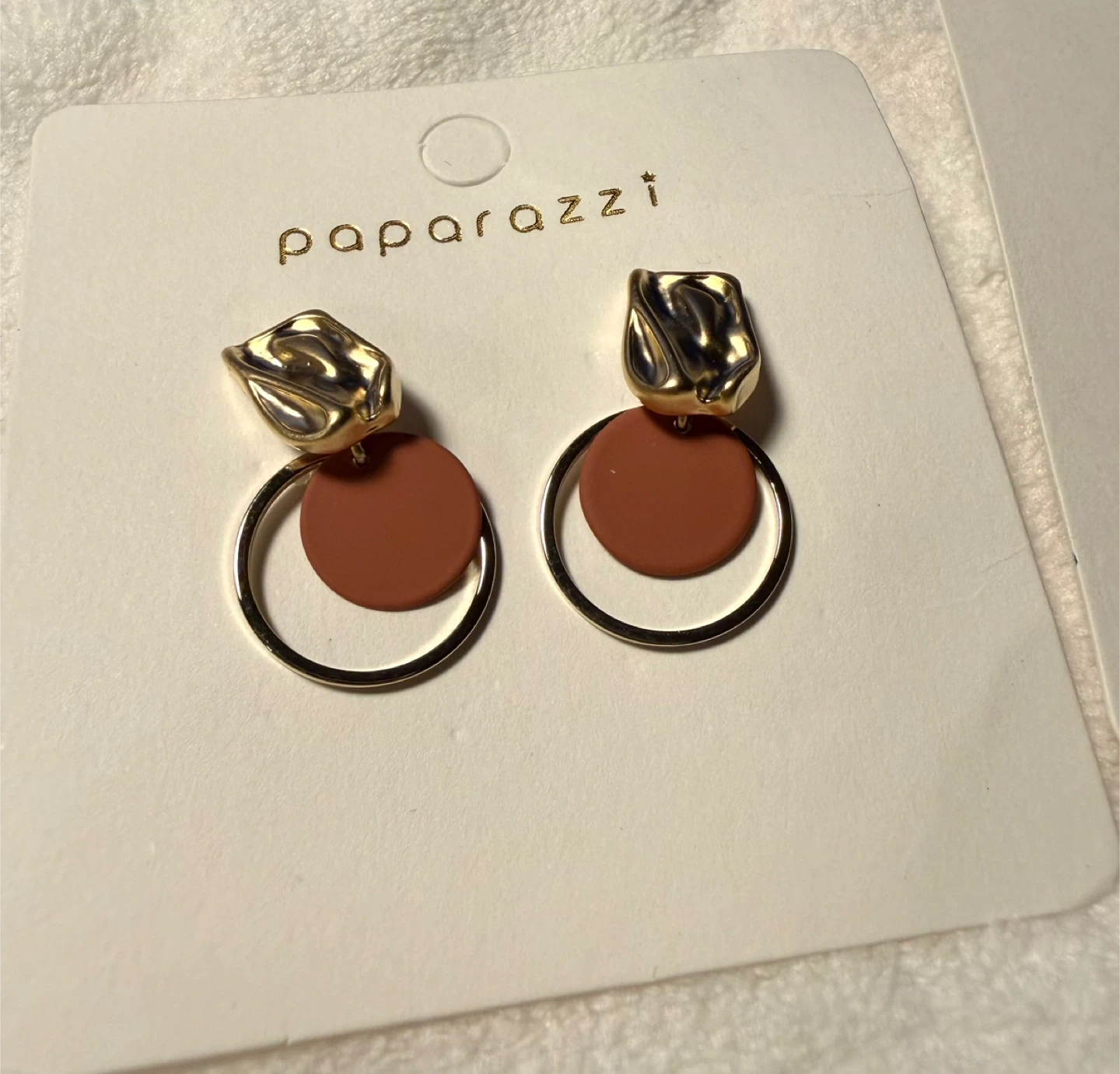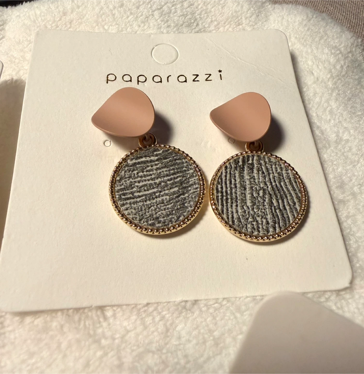 Stylish earrings featuring a pink rounded stud with a grey textured, gold-rimmed circular dangle. They're lightweight and eye-catching.