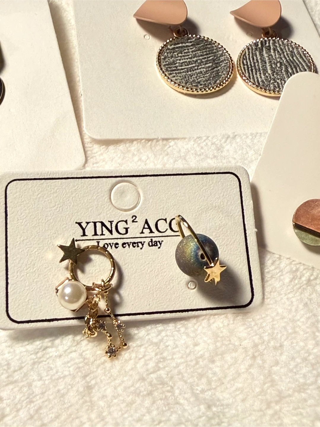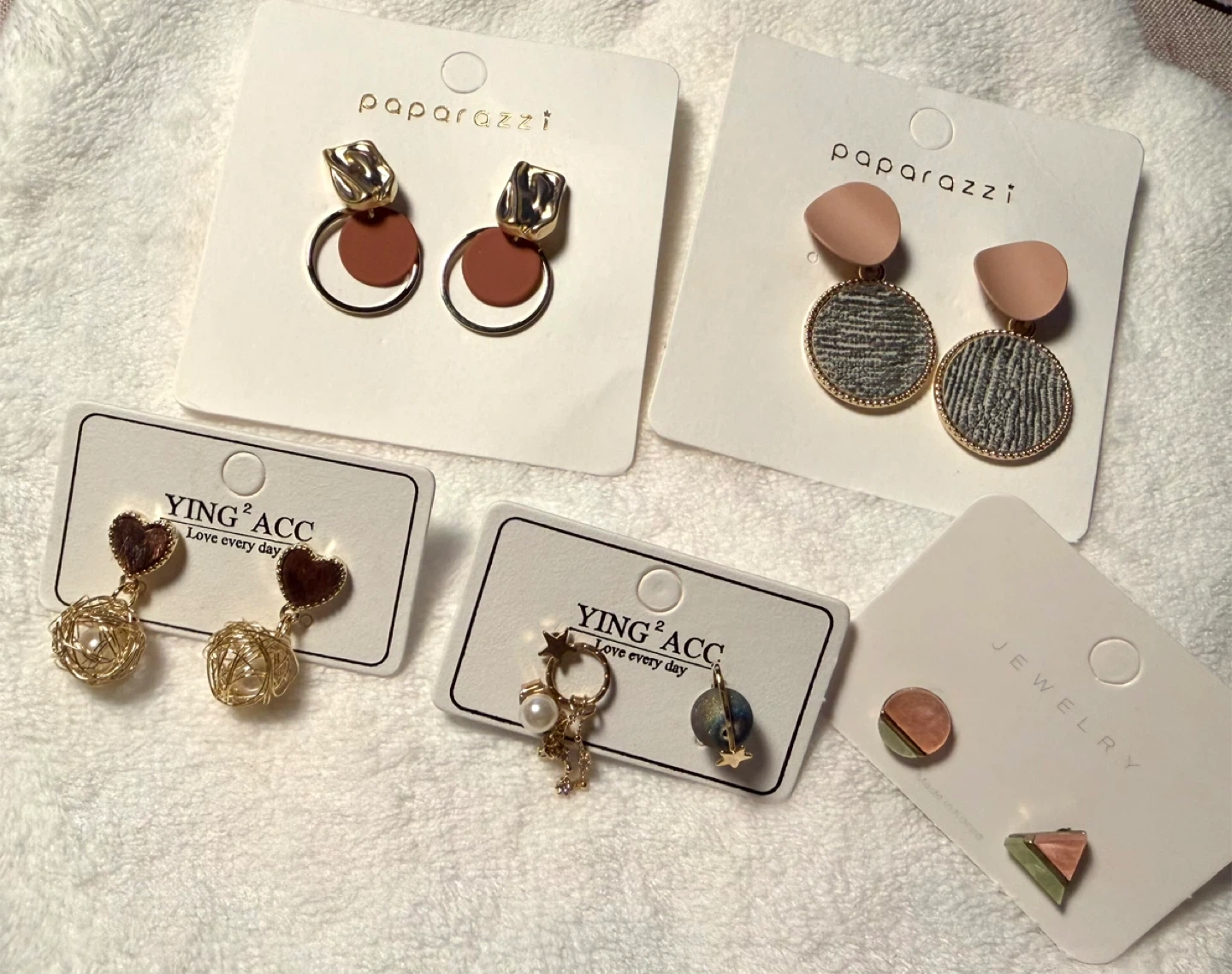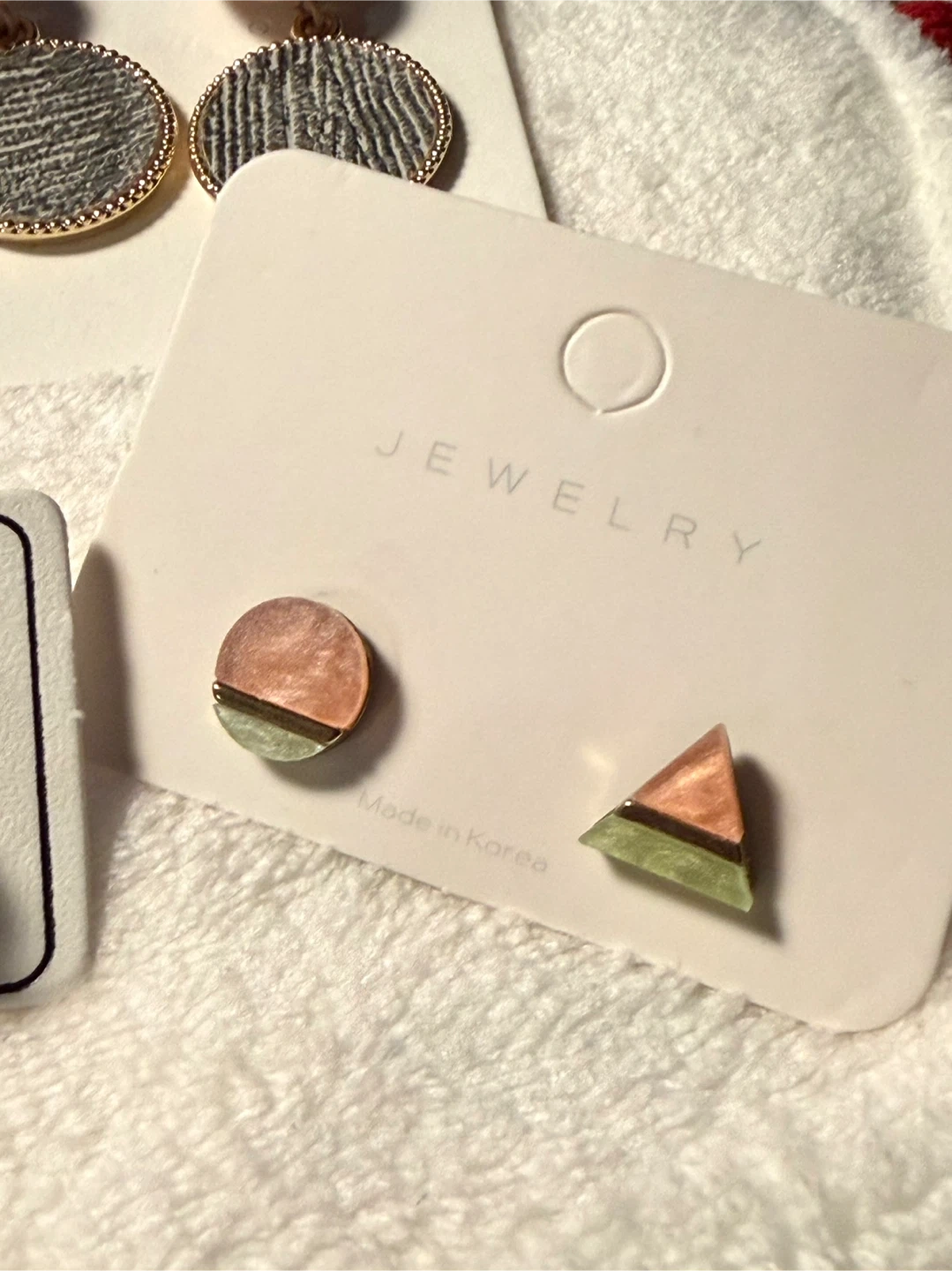 Stylish earrings featuring a pink rounded stud with a grey textured, gold-rimmed circular dangle. They're lightweight and eye-catching.