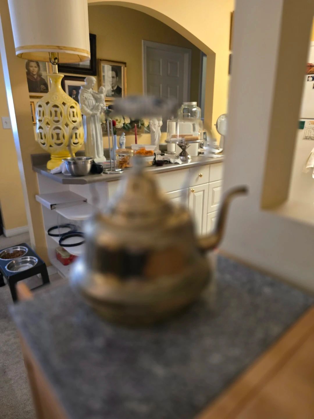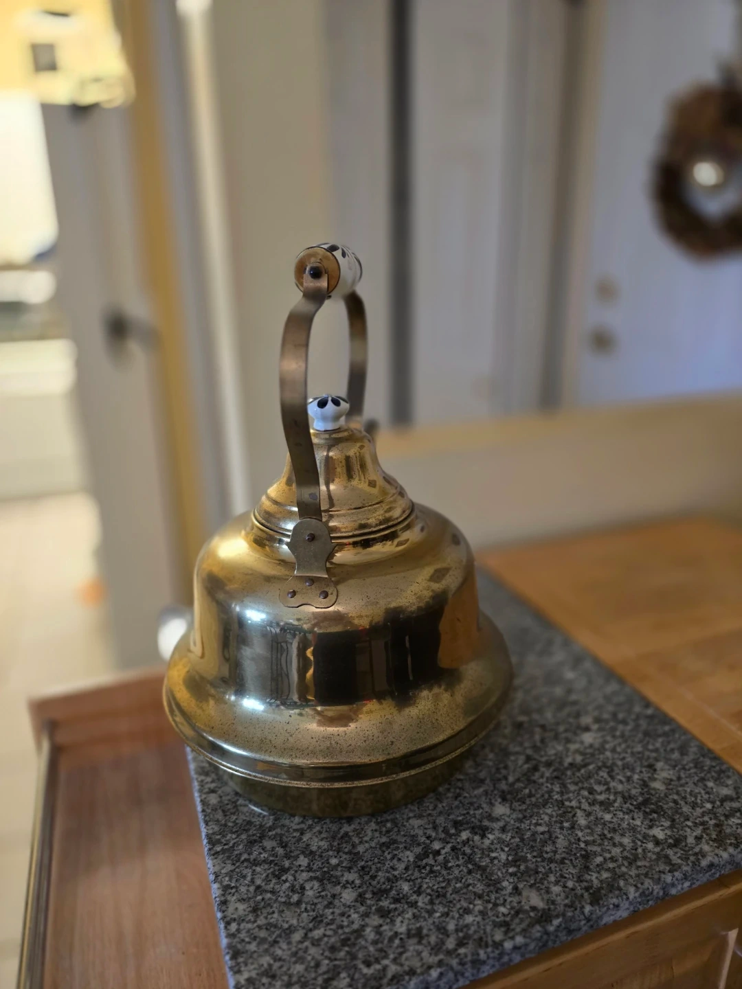 A beautiful brass kettle with a decorative ceramic handle. This kettle has a classic design and a shiny finish. It may be used for boiling water. I have used it as a decorative accent in the kitchen. It may also be used as a planter.