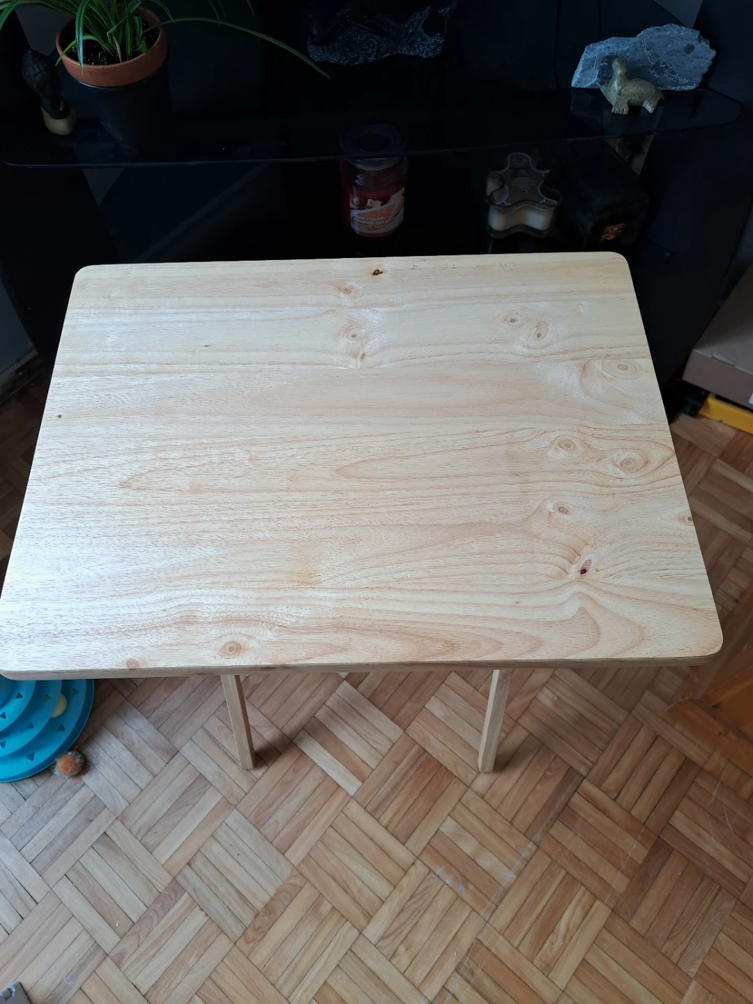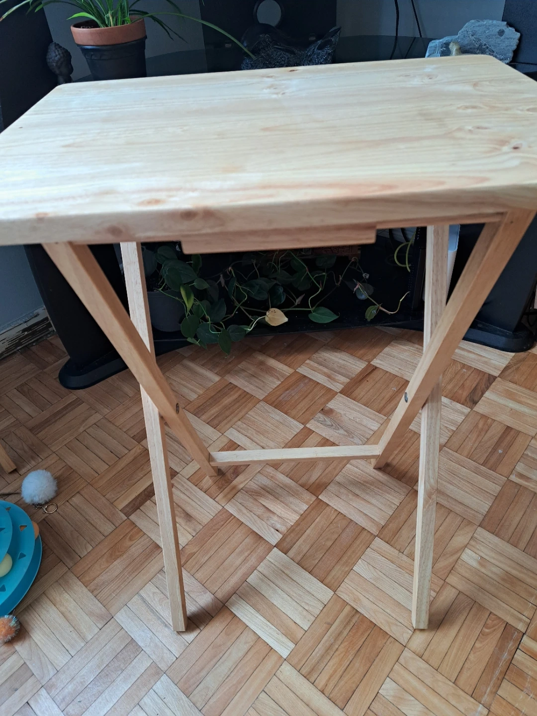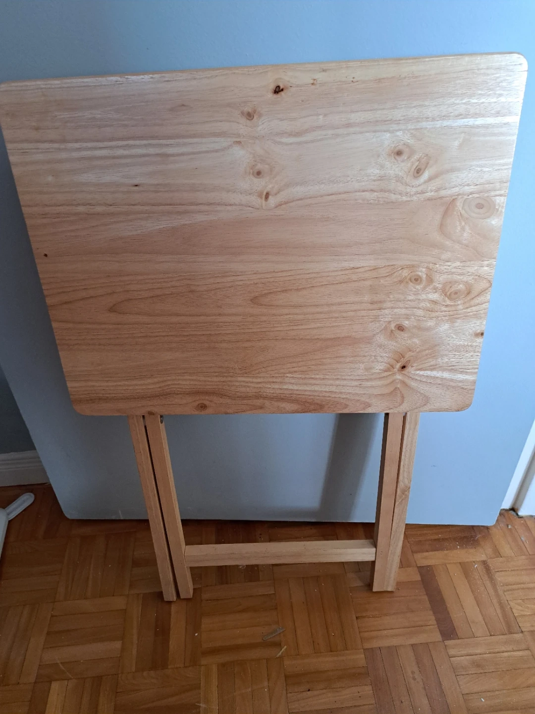 A simple folding table made of light-coloured wood. It's great for extra surface space when you need it. Made of wood. π₯