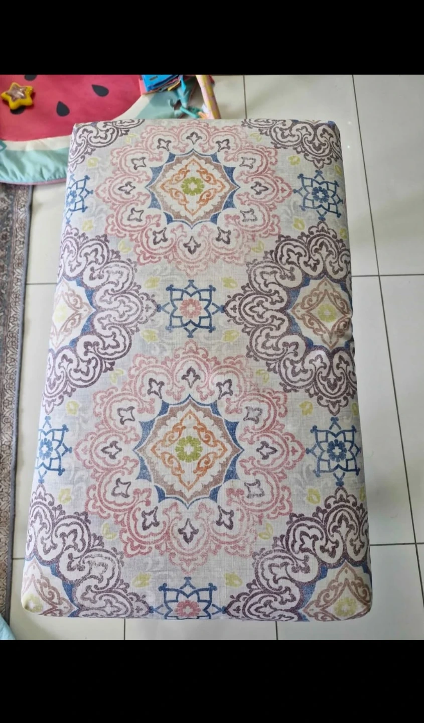 This bench features a colourful mandala-style fabric pattern. It has four wooden legs providing sturdy support. It's a great accent piece for your entry way or living room or bedroom.