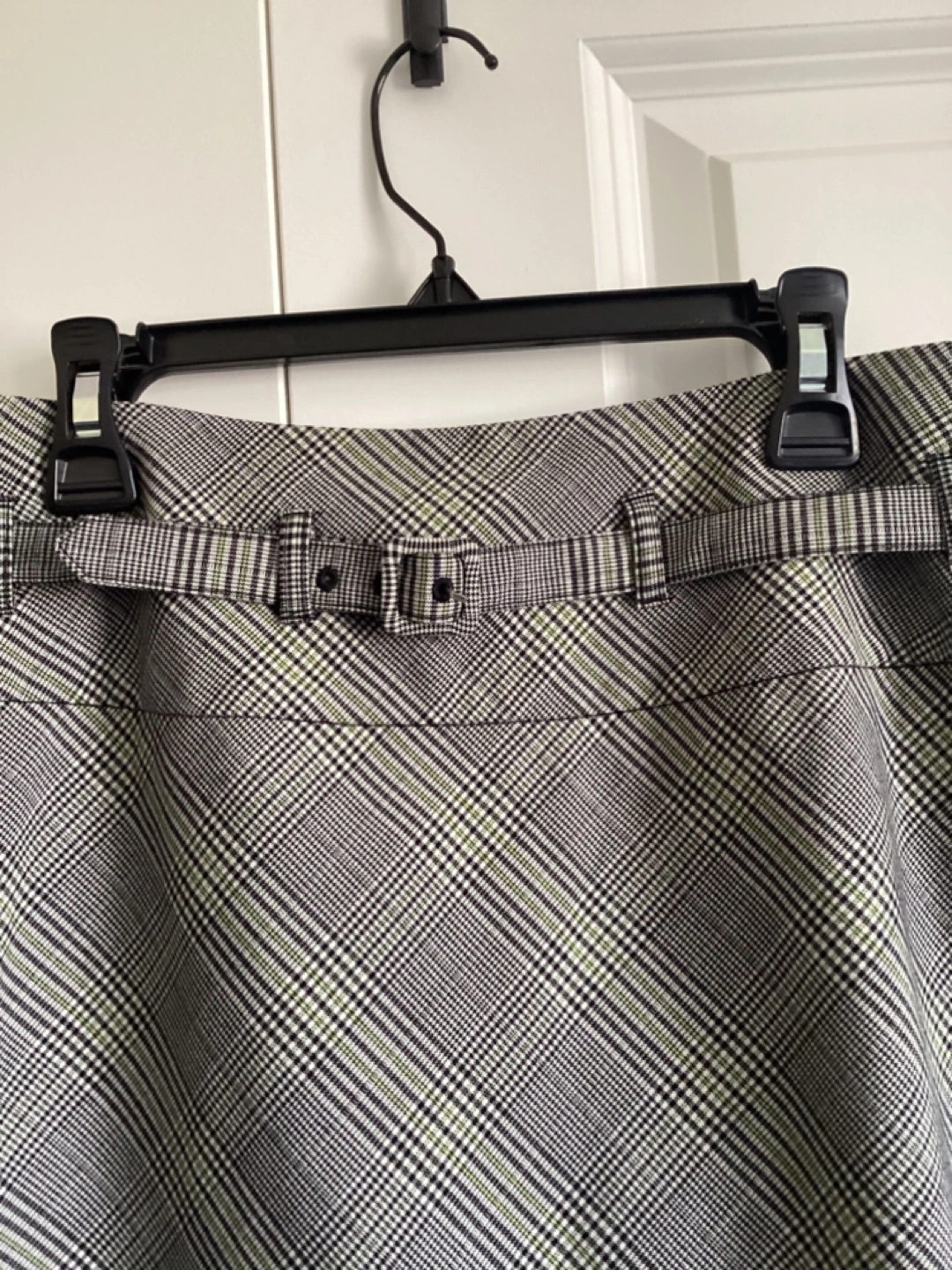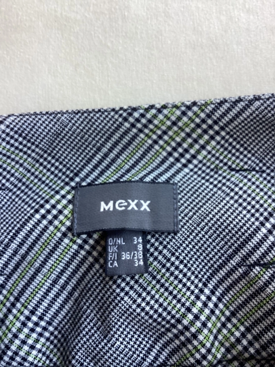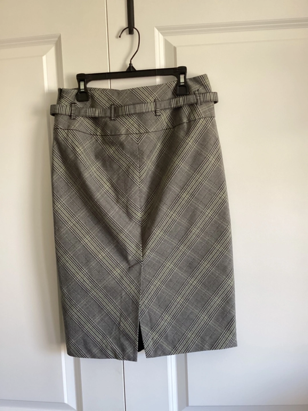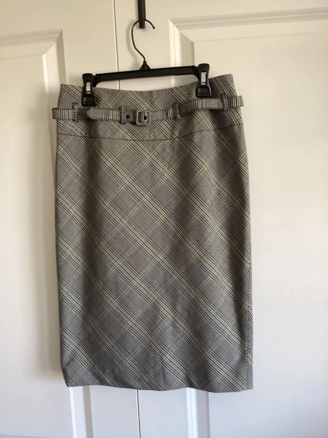 Mexx Plaid Pencil Skirt, self belt, side invisible zipper, lined, centre back kick pleat, this is a UK Size 8 which is US size 6, 61% Polyester 37% Viscose 2% Elastane, Size 6, $8. Waist 28” Hips 35” Centre back length 24 1/4”