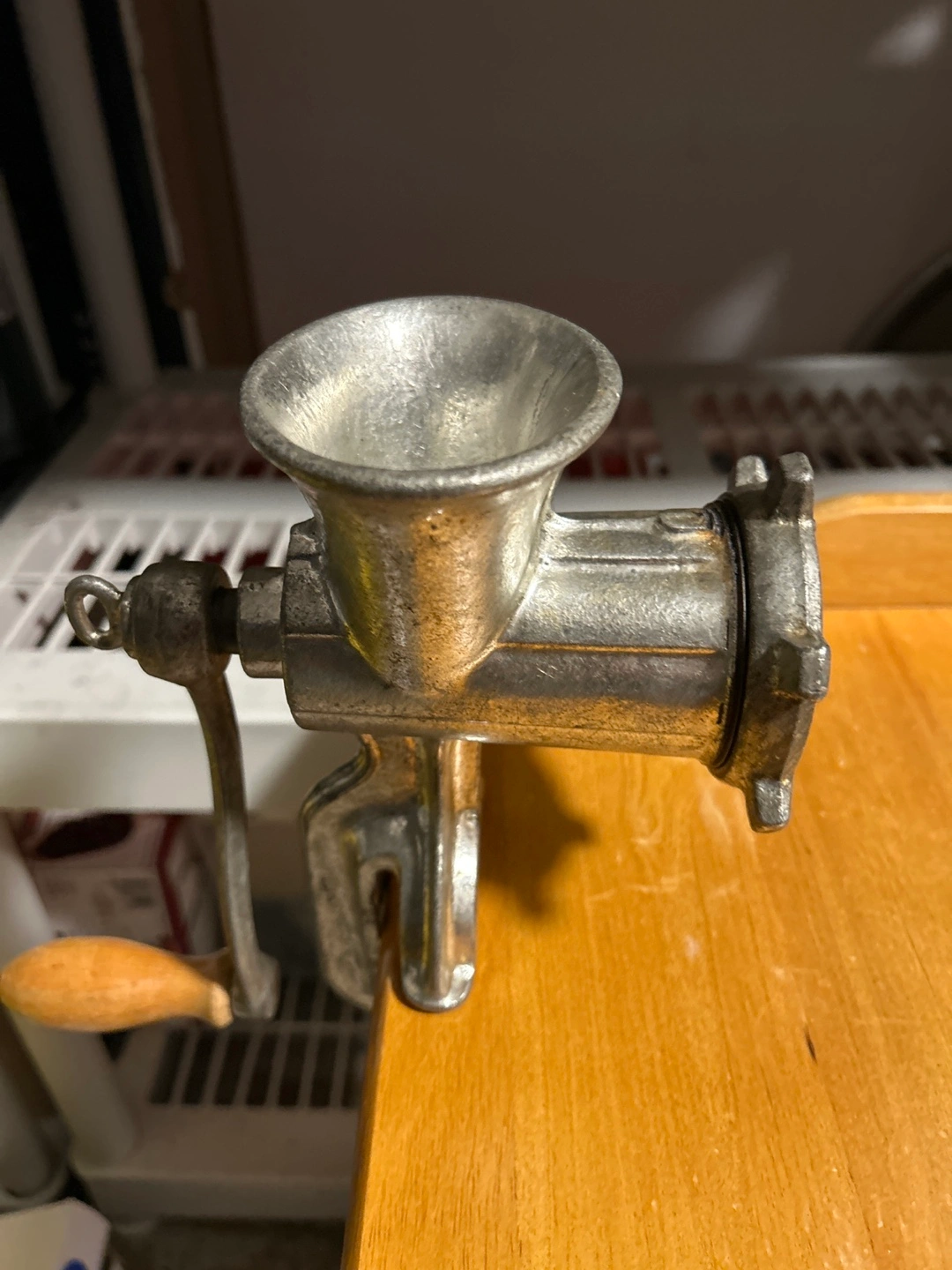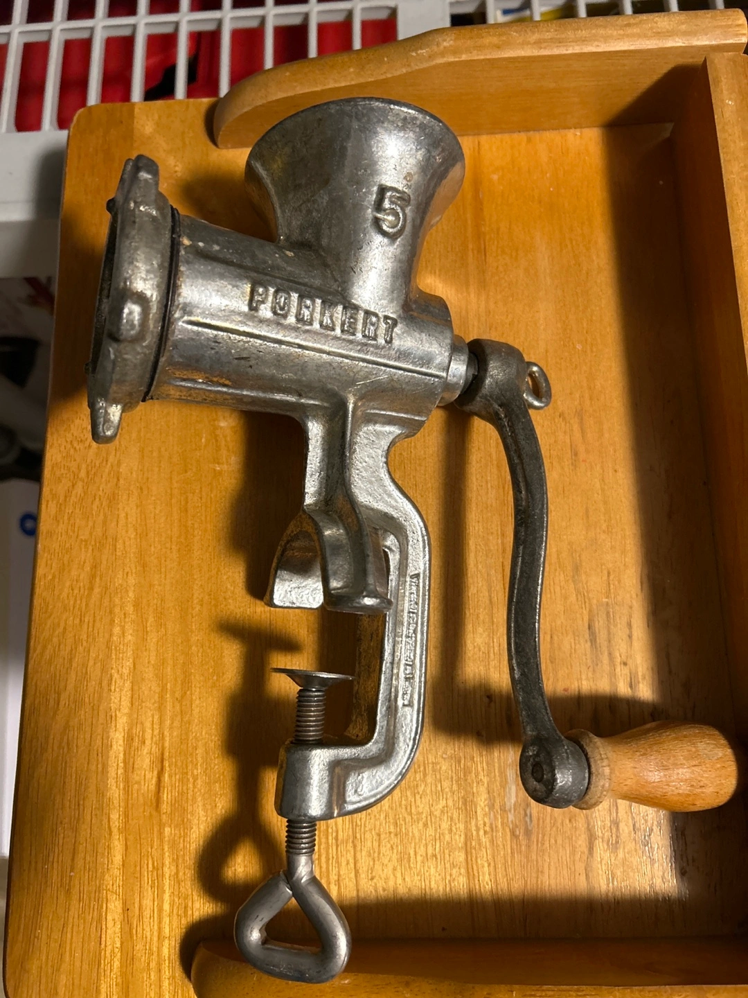 This is a vintage hand crank meat grinder made of metal. It has a wooden handle and clamps securely to a tabletop. It's a durable kitchen tool for grinding meats or making sausages.