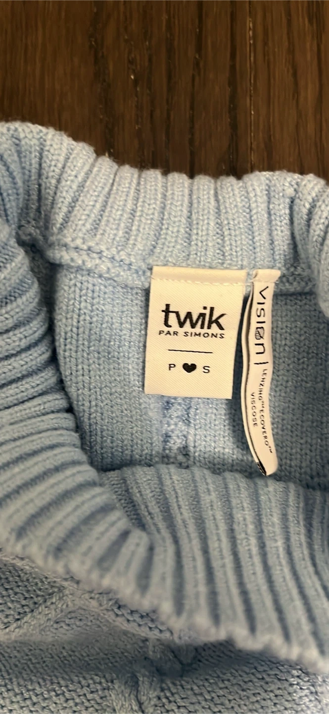 A light blue cable knit sweater from Twik Par Simons. It's a size small with a mock neck and diamond knit pattern. Made with a blend of acrylic, nylon, and spandex.