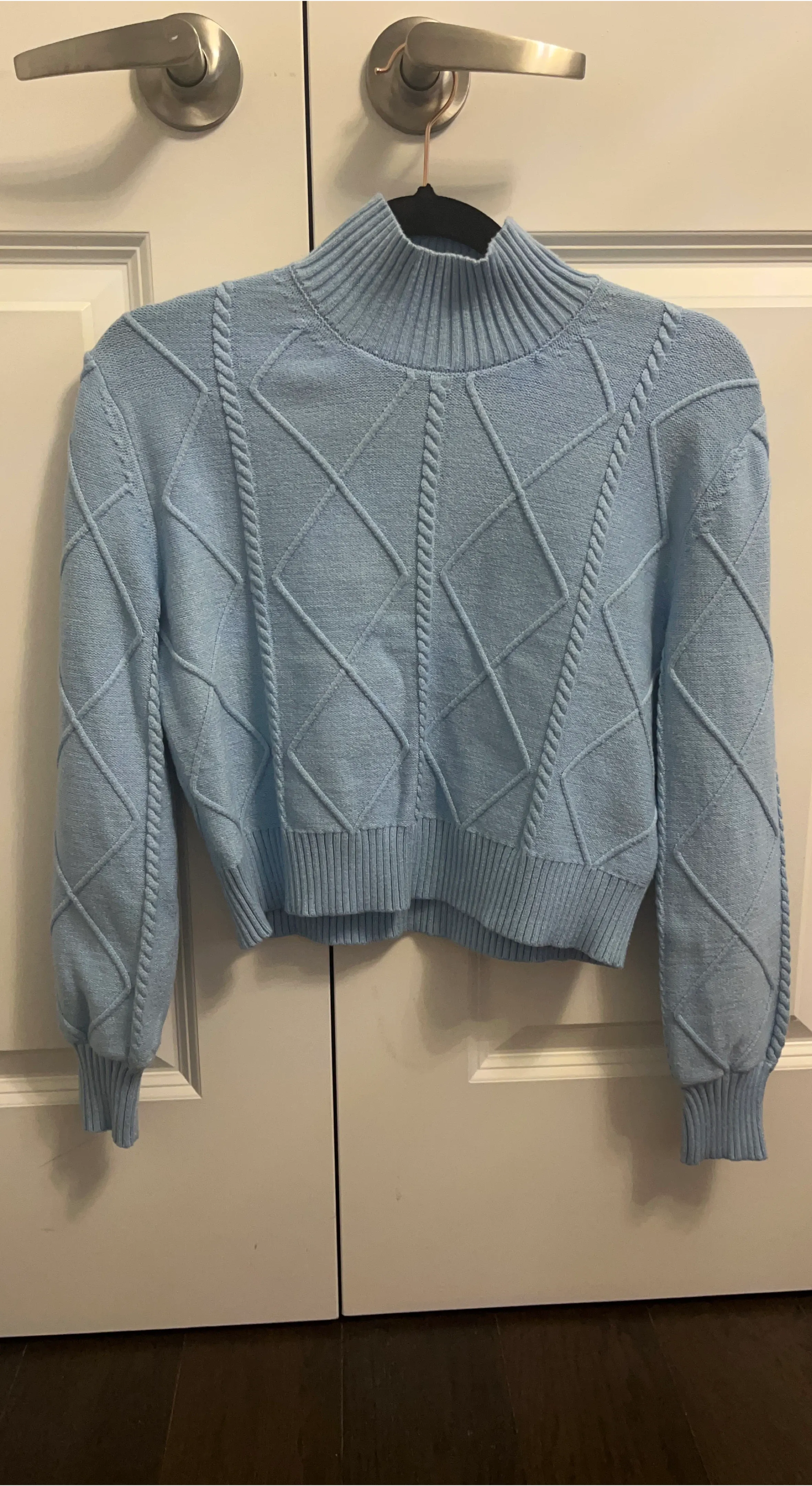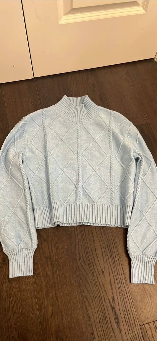 A light blue cable knit sweater from Twik Par Simons. It's a size small with a mock neck and diamond knit pattern. Made with a blend of acrylic, nylon, and spandex.