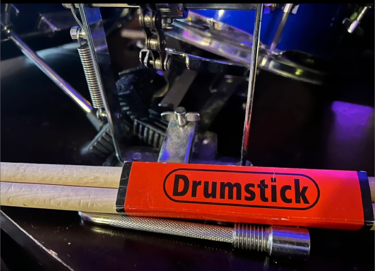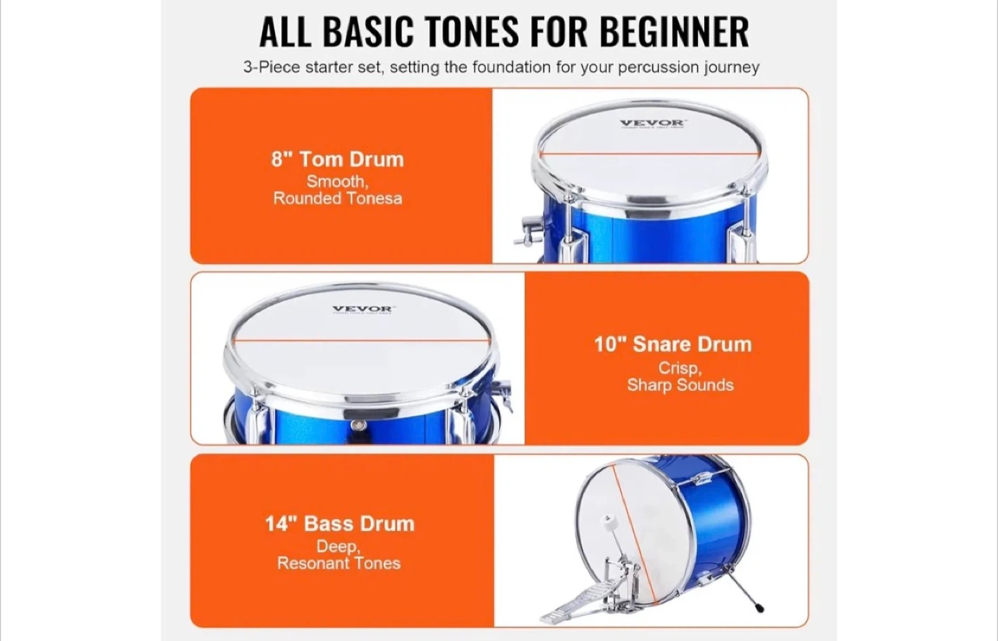This 3-piece drum set includes an 8" tom, a 10" snare, and a 14" bass drum. It's a starter set designed for beginners. Drumsticks are also included.