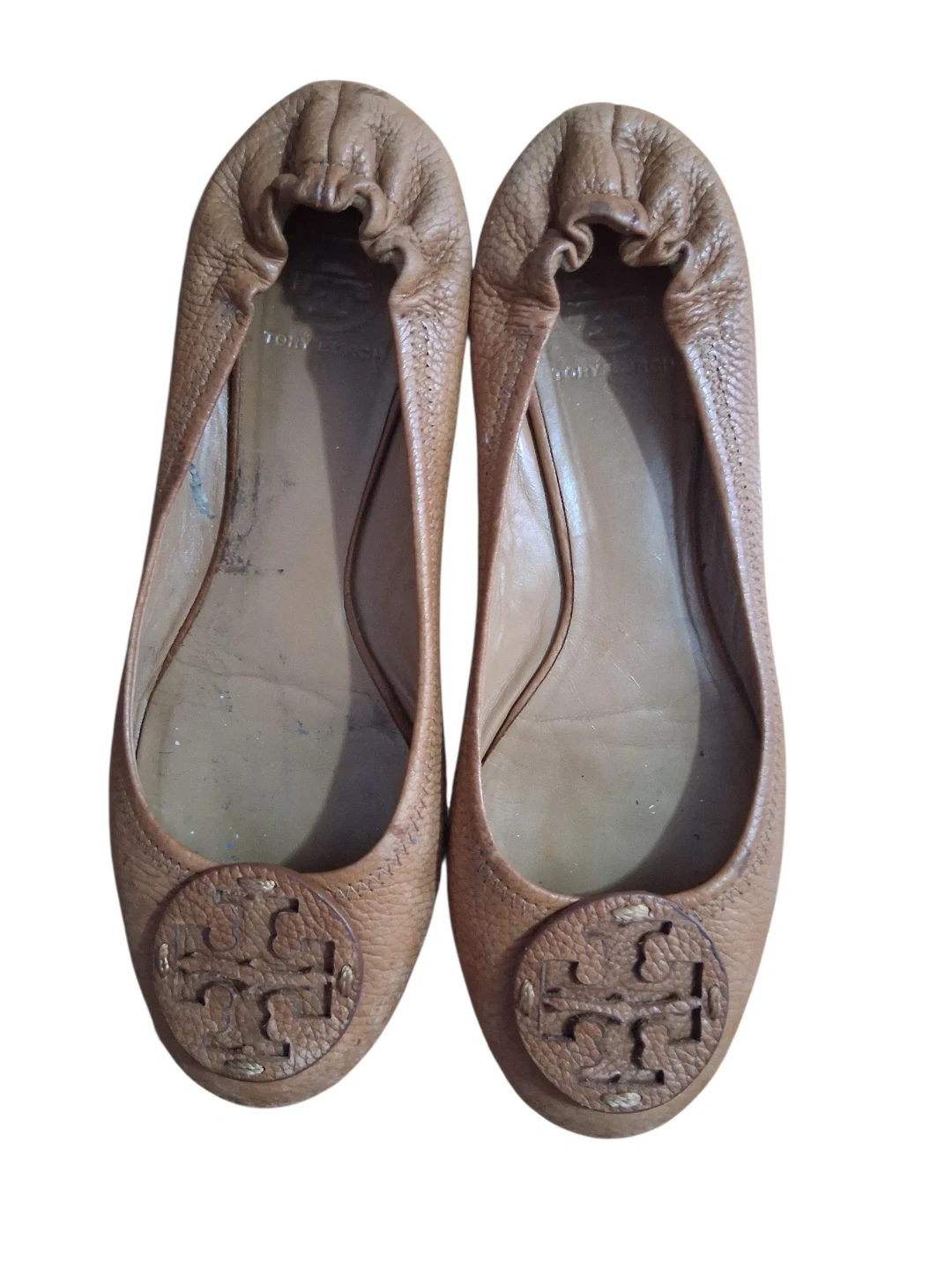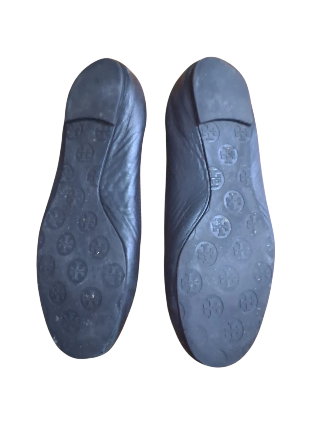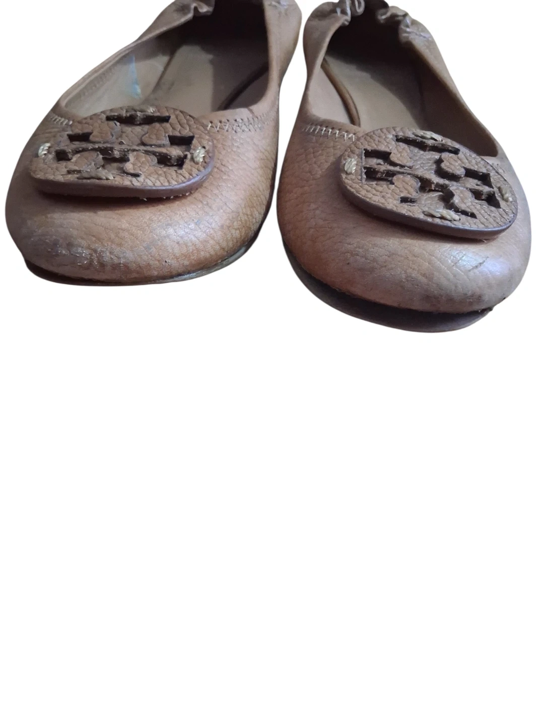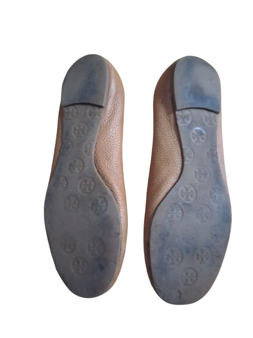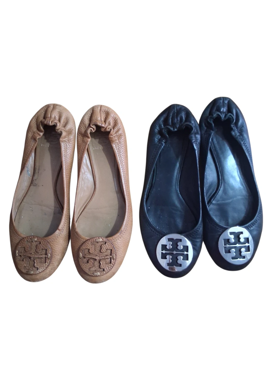 A pair of black and a pair of tan leather Tory Burch ballet flats. Sold together. Features the signature Tory Burch logo. Leather upper and lining. Slip-on style.