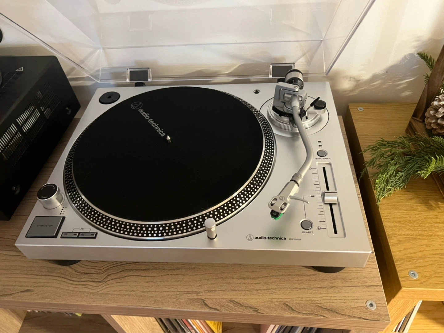 Silver Audio-Technica AT-LP120XUSB direct-drive turntable. Features adjustable dynamic anti-skate control, variable pitch control with quartz speed lock, and a USB output. Includes dust cover.