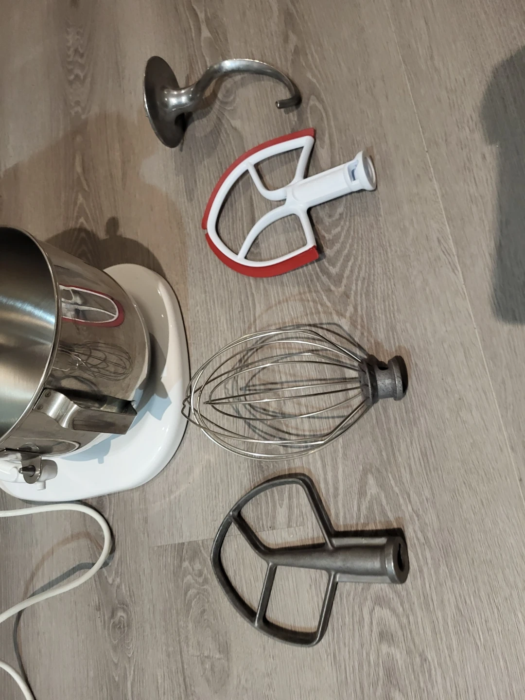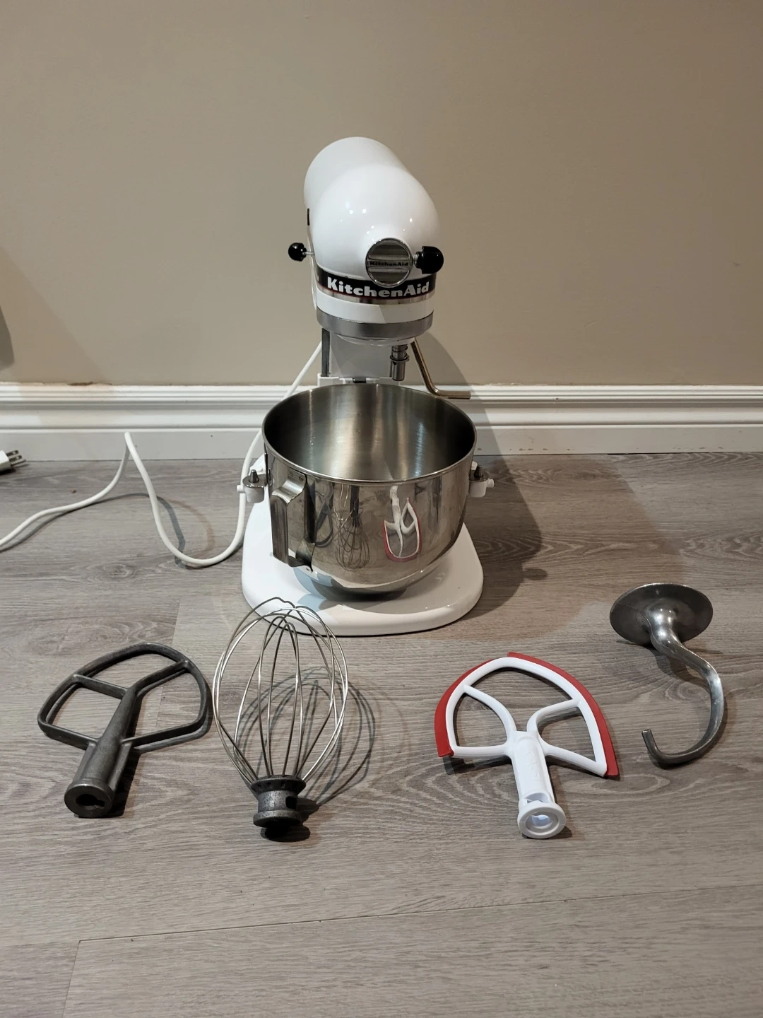 White KitchenAid Professional stand mixer. Includes dough hook, wire whisk, and flat beater attachments. Max watts 350.Perfect for baking and kitchen. Could not find size of bowl but I think at least 4 or 5 Oz.