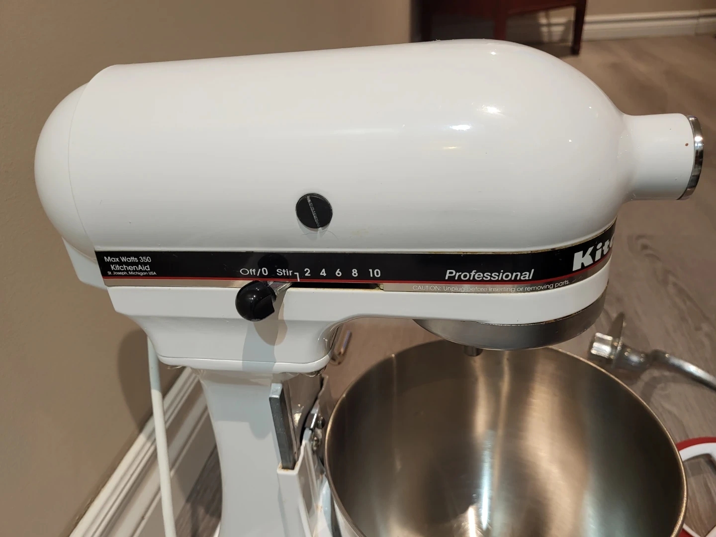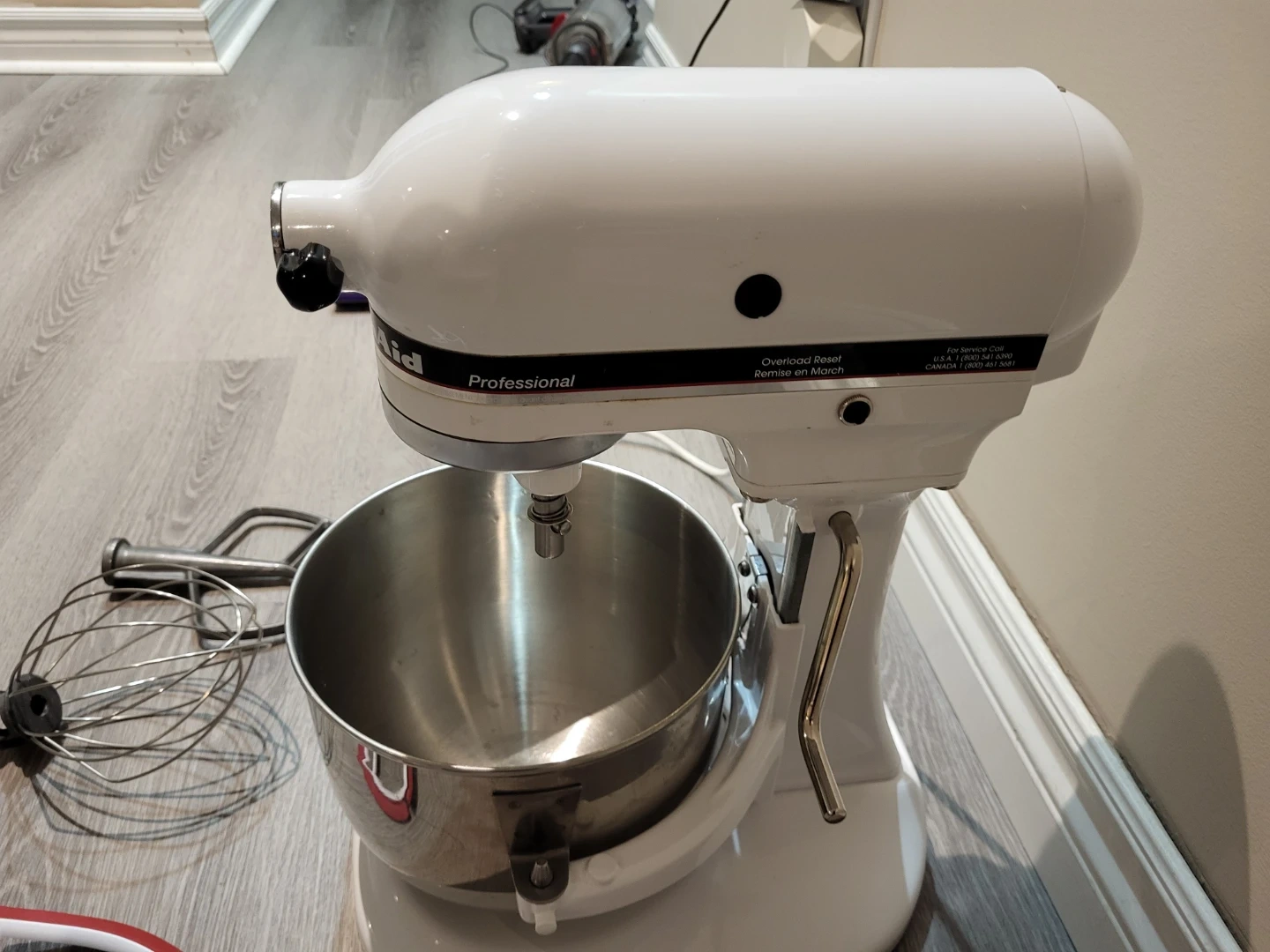 White KitchenAid Professional stand mixer. Includes dough hook, wire whisk, and flat beater attachments. Max watts 350.Perfect for baking and kitchen. Could not find size of bowl but I think at least 4 or 5 Oz.
