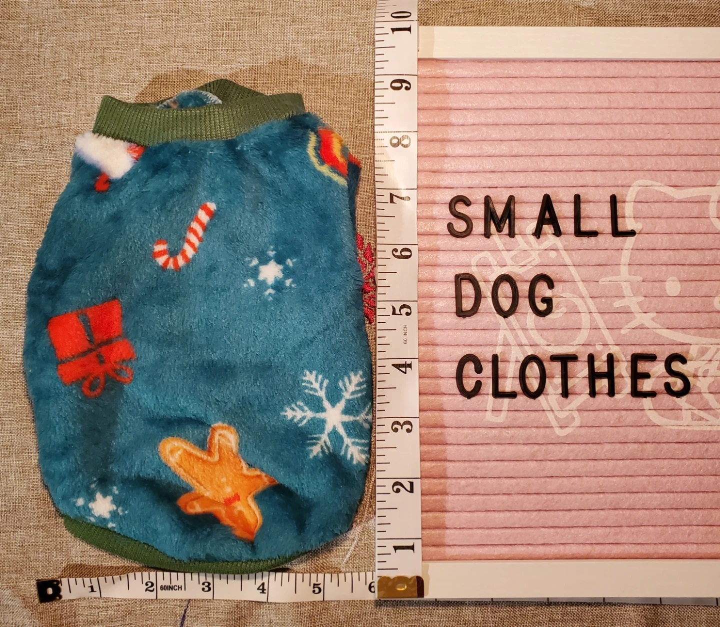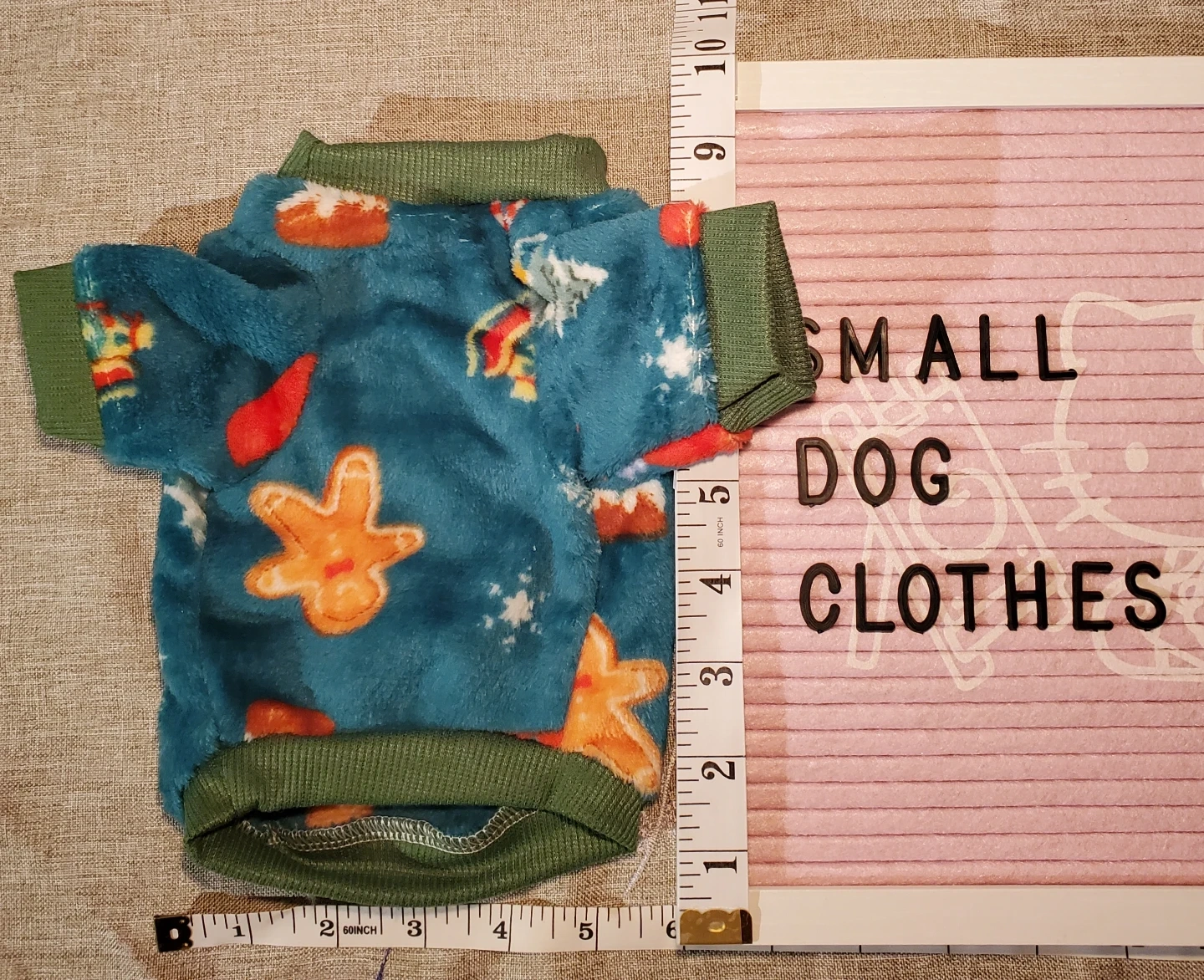 Cozy teal dog sweater with a festive holiday print featuring gingerbread men, candy canes, and gifts. Ribbed green trim on the collar, sleeves, and hem. Perfect for keeping your small dog warm and stylish.