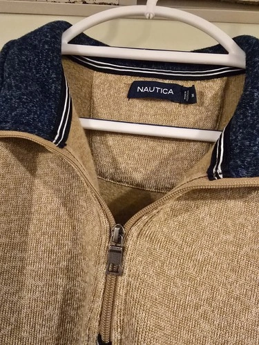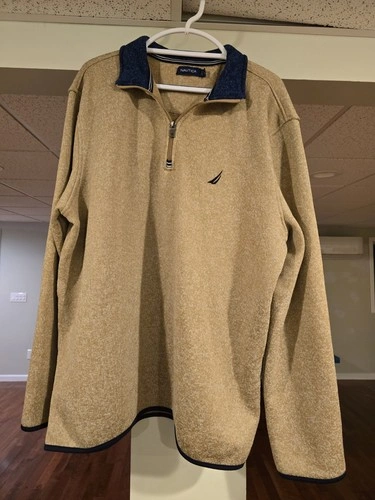 Men's Nautica Quarter Zip Sweater in tan navy color, size XXL. Pullover style, made in Indonesia. A stylish and comfortable option for staying warm during the colder months.