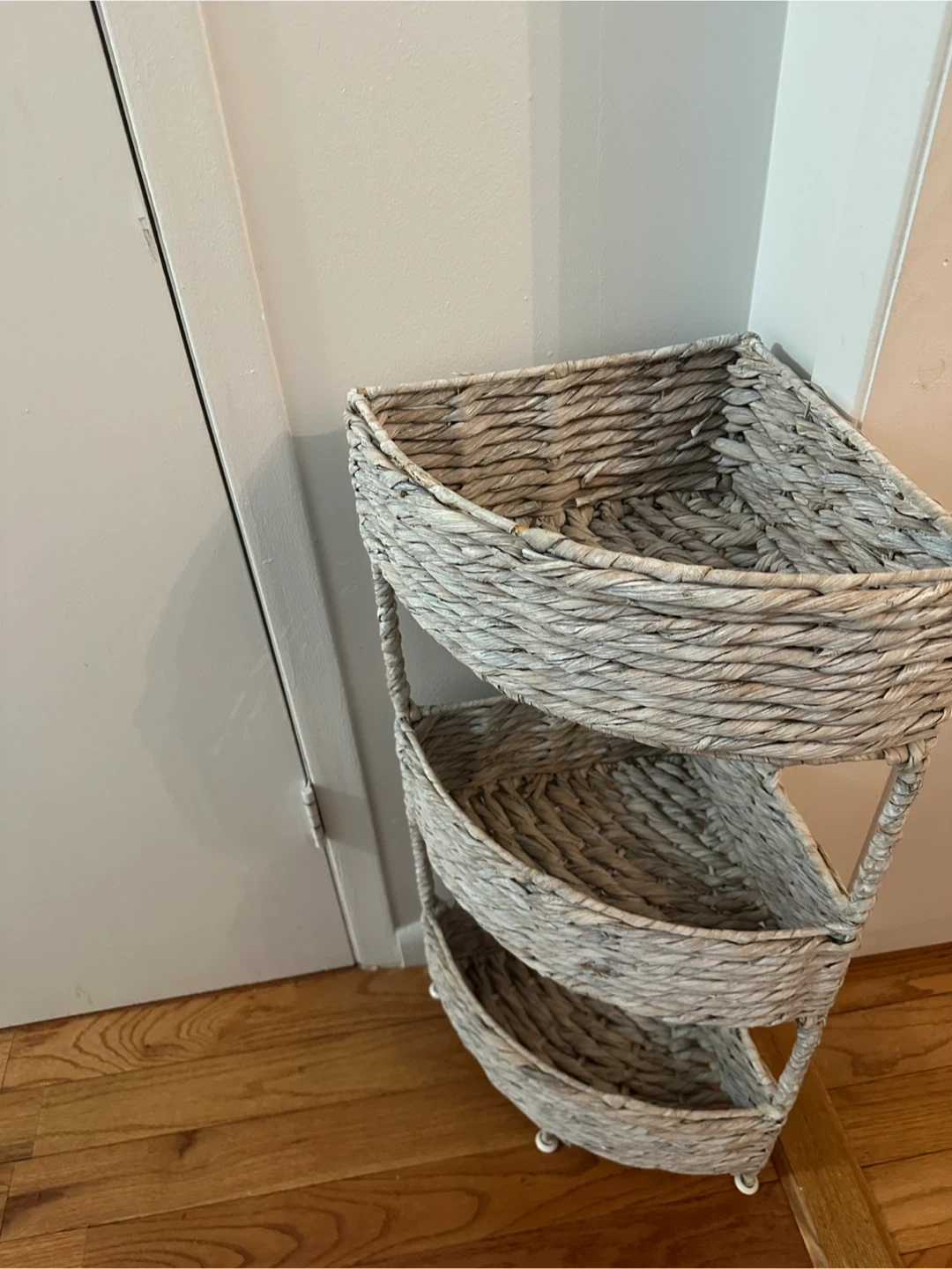 This 3-tier corner shelf is crafted from woven wicker. It's great for organizing items in small spaces. The tiered design makes it useful for bathrooms, bedrooms, or living areas.