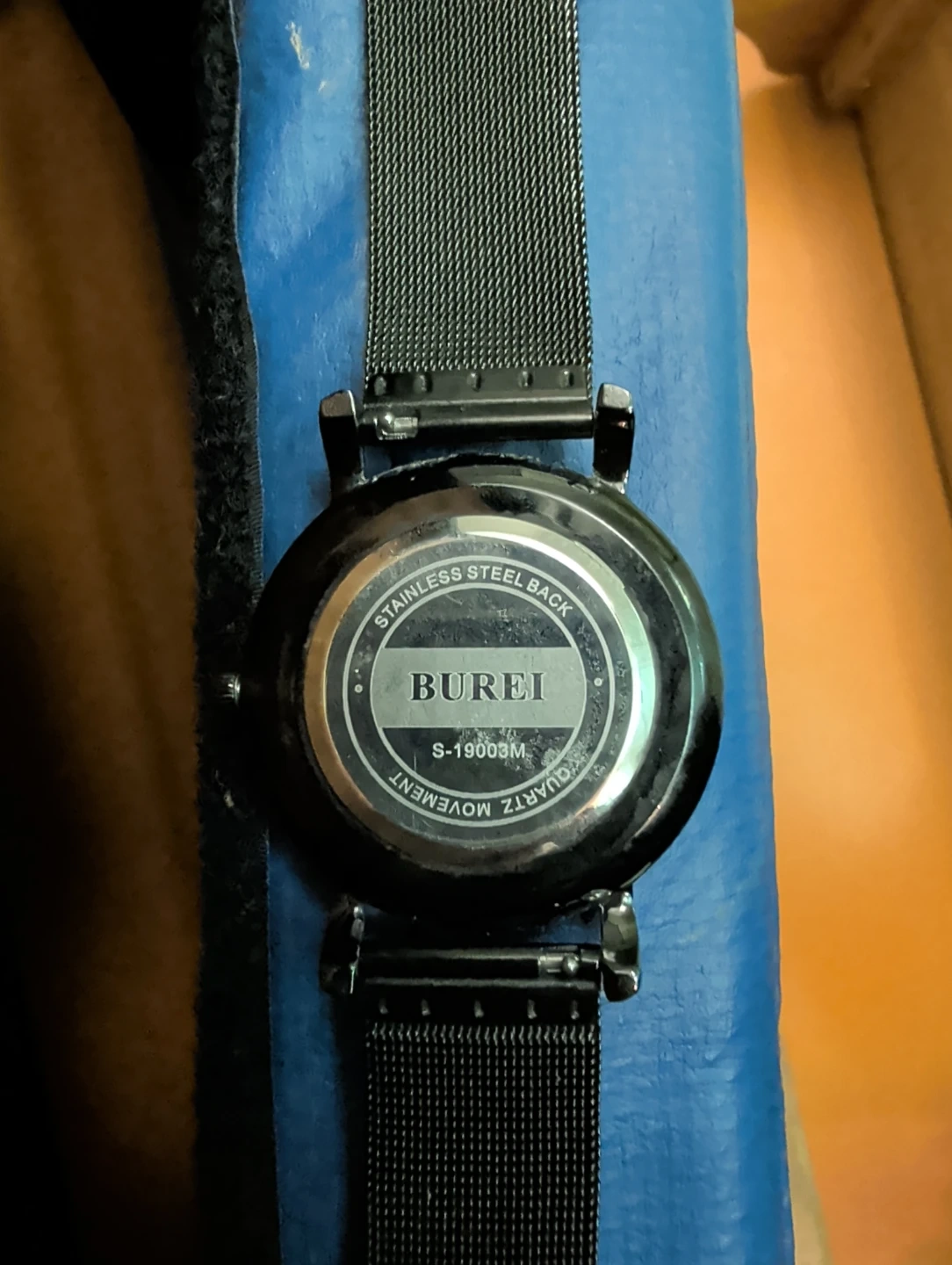 This is a BUREI watch with a sleek black mesh band. It features a simple dial with hour markers and a convenient date window. Stainless steel back, quartz movement.