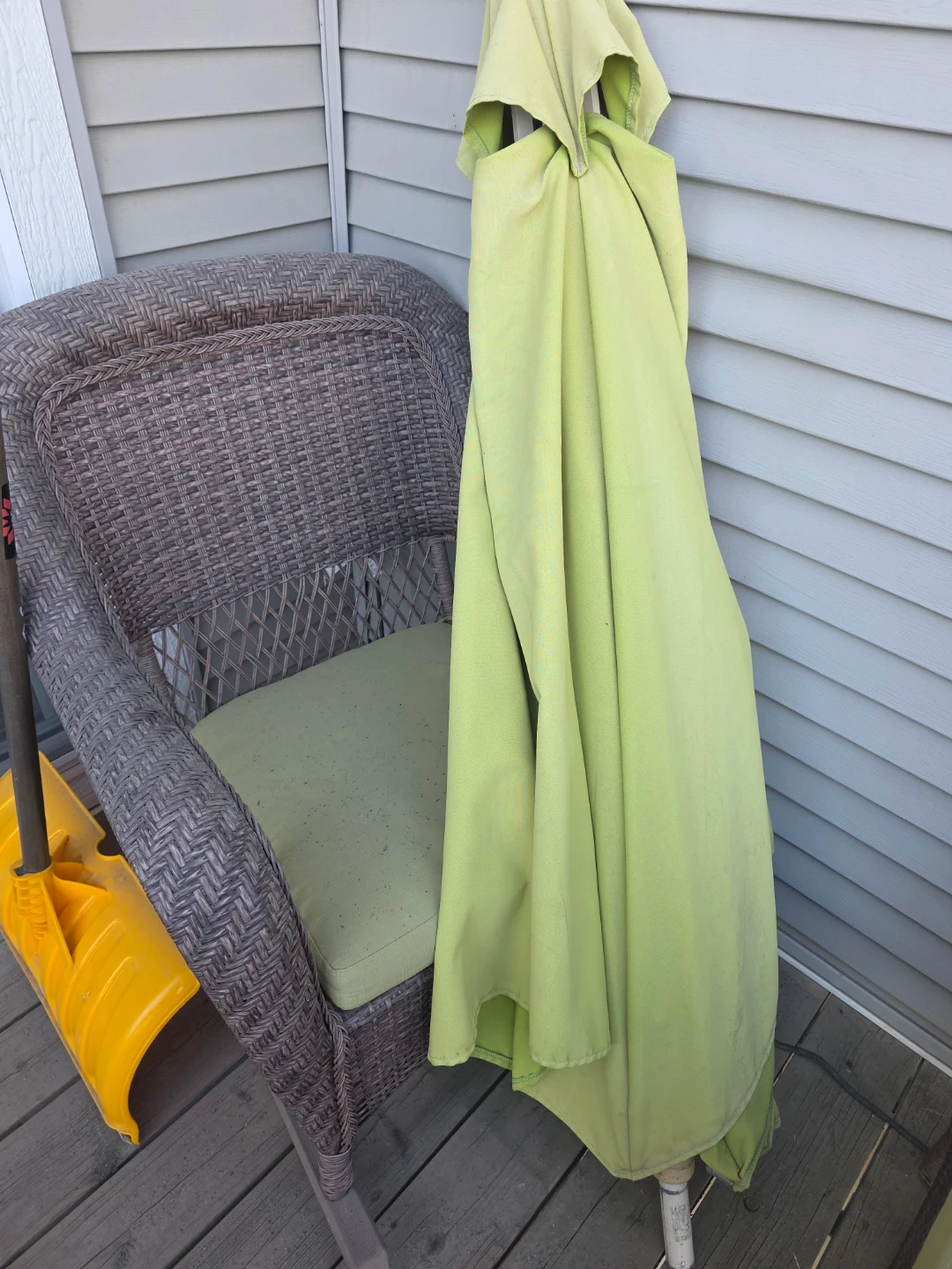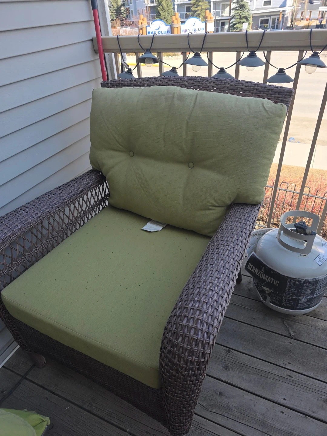 This set includes a wicker armchair with a light green cushion and a matching glass-top side table. The armchair's wicker is a deep brown, and it comes with a separate back cushion. The side table features a shelf beneath the glass top, perfect for outdoor relaxation.
