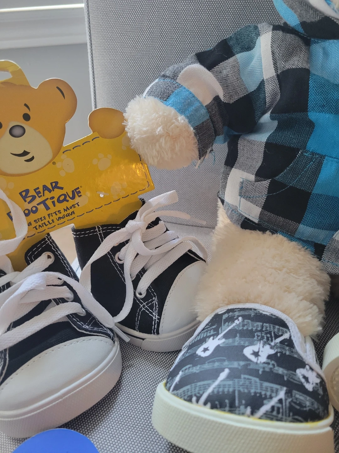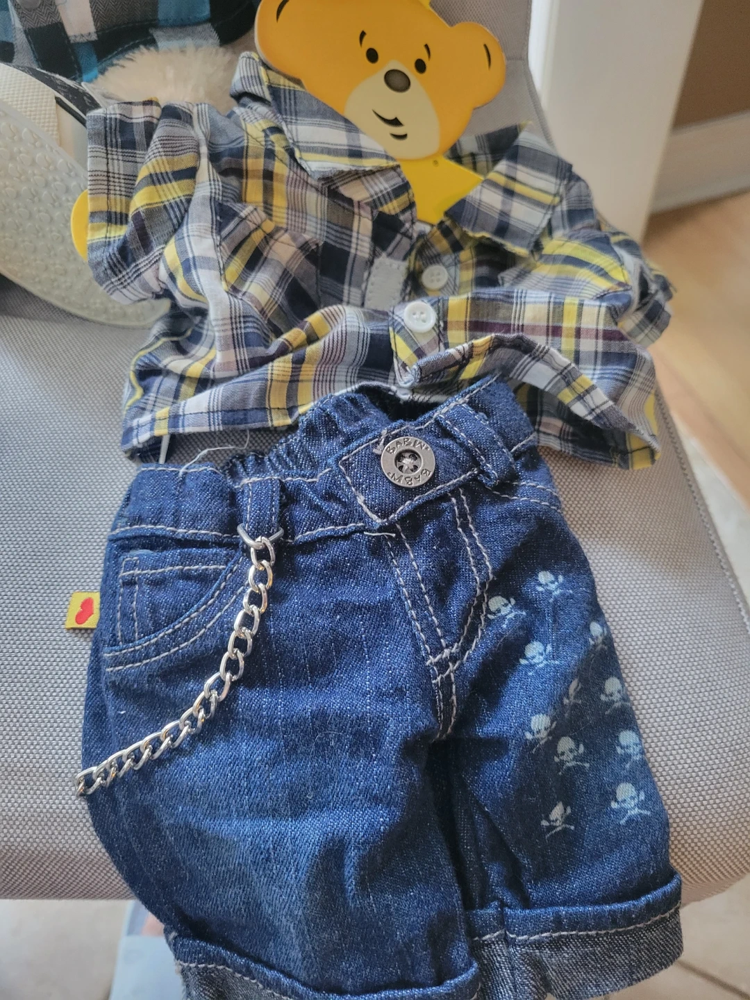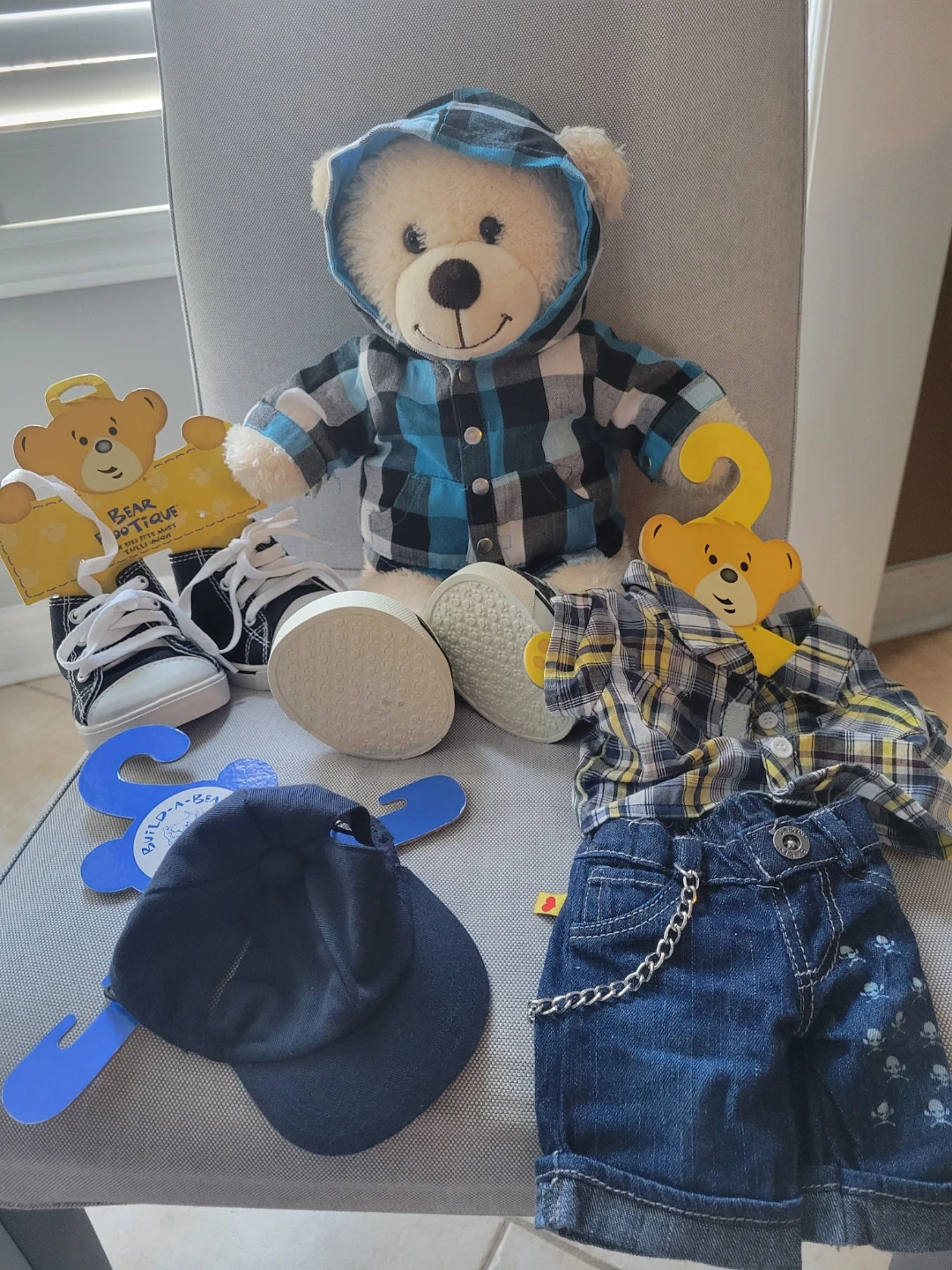 This is a lot of Build-A-Bear clothing and accessories. It includes a plaid shirt, jeans with a chain and skull details, a blue baseball cap, and black sneakers. There's also a hooded jacket with a blue and black plaid pattern. Perfect for dressing up your favourite furry friend!