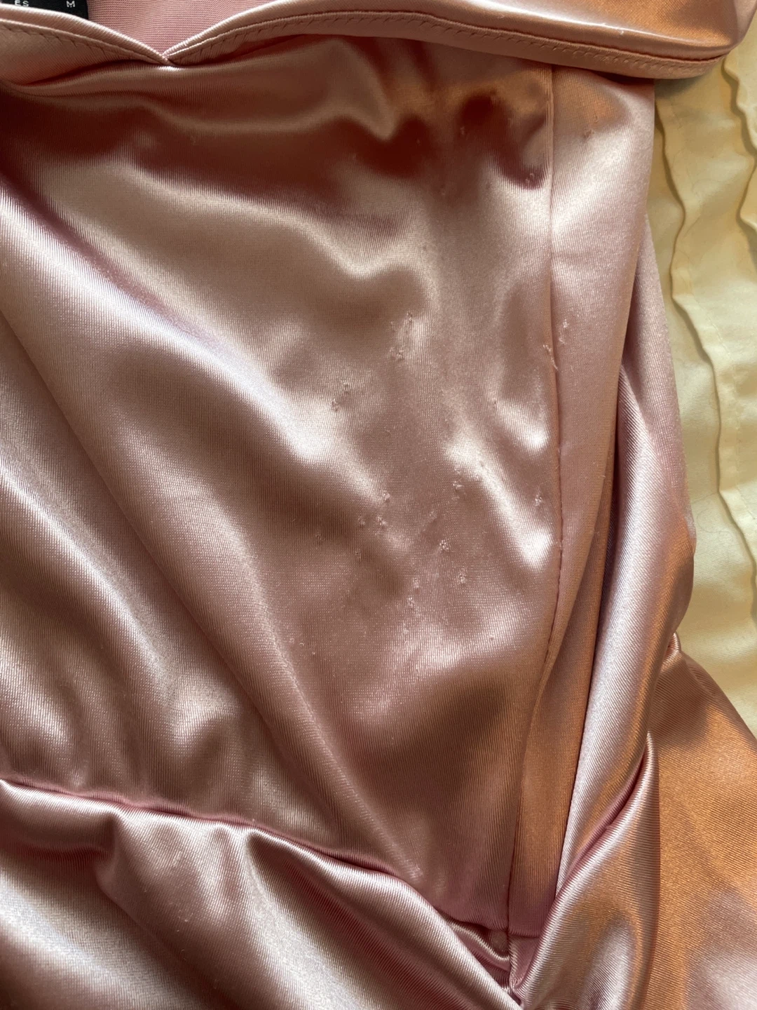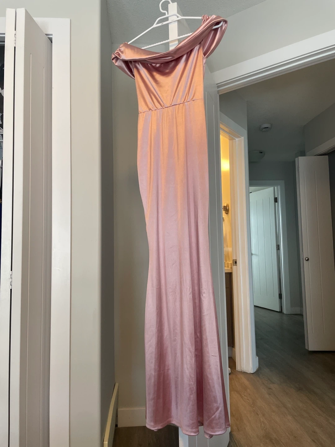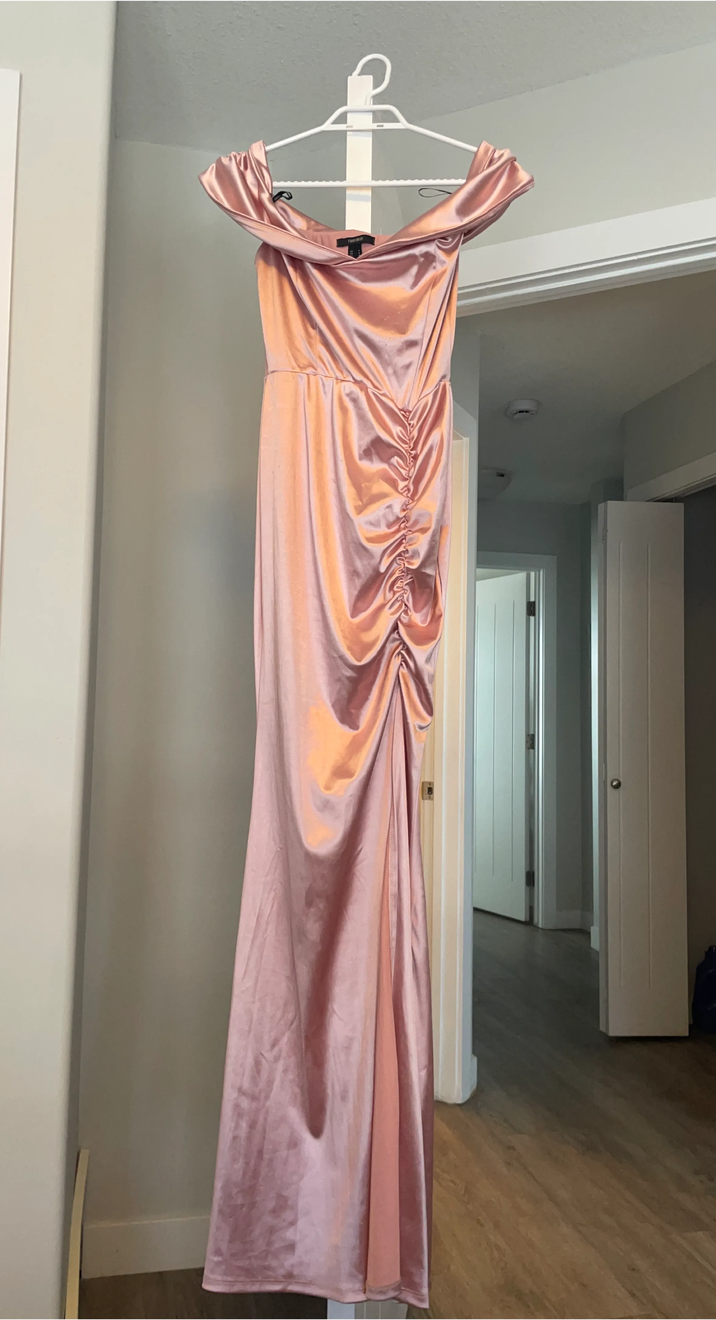 Pink satin maxi dress with an off-the-shoulder neckline and ruched detailing on the side. Size medium. There’s a scratches on the front due to flower bouquet. Wear once on my best friend wedding…