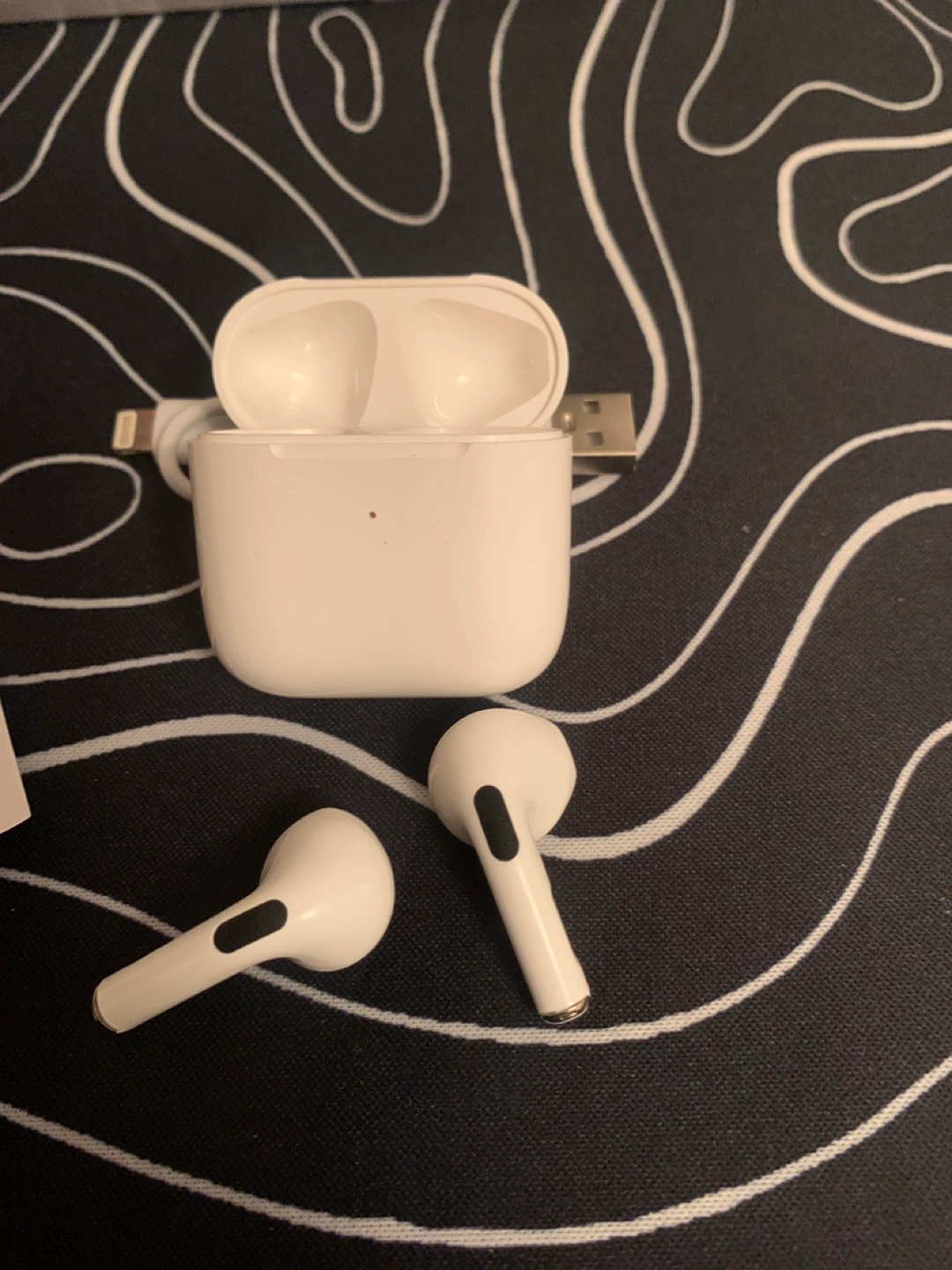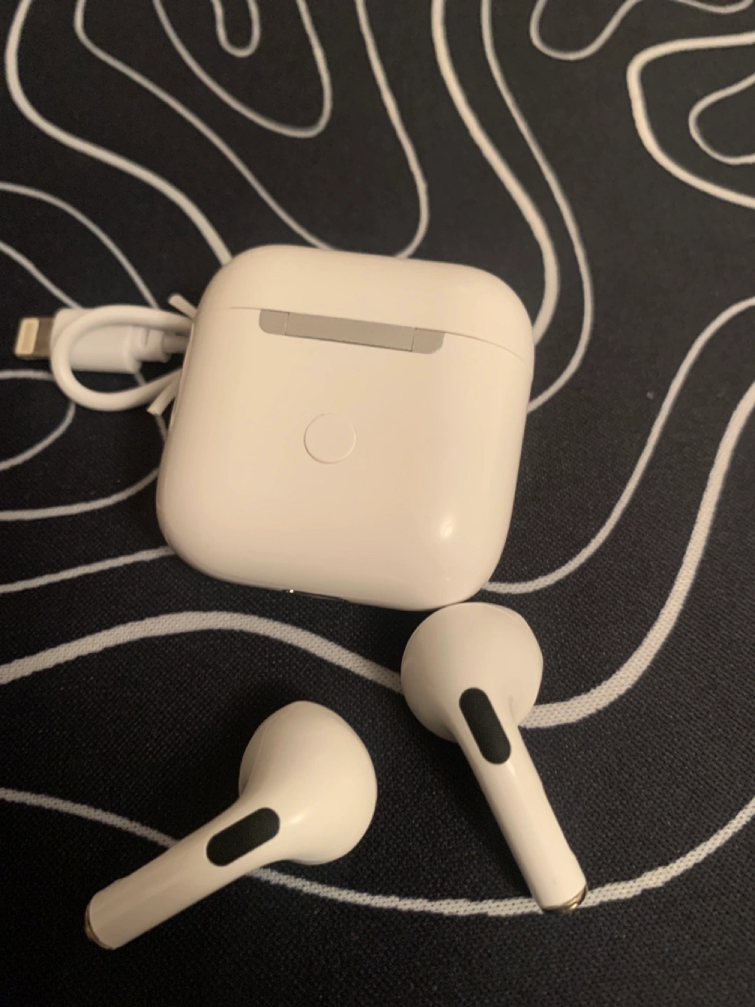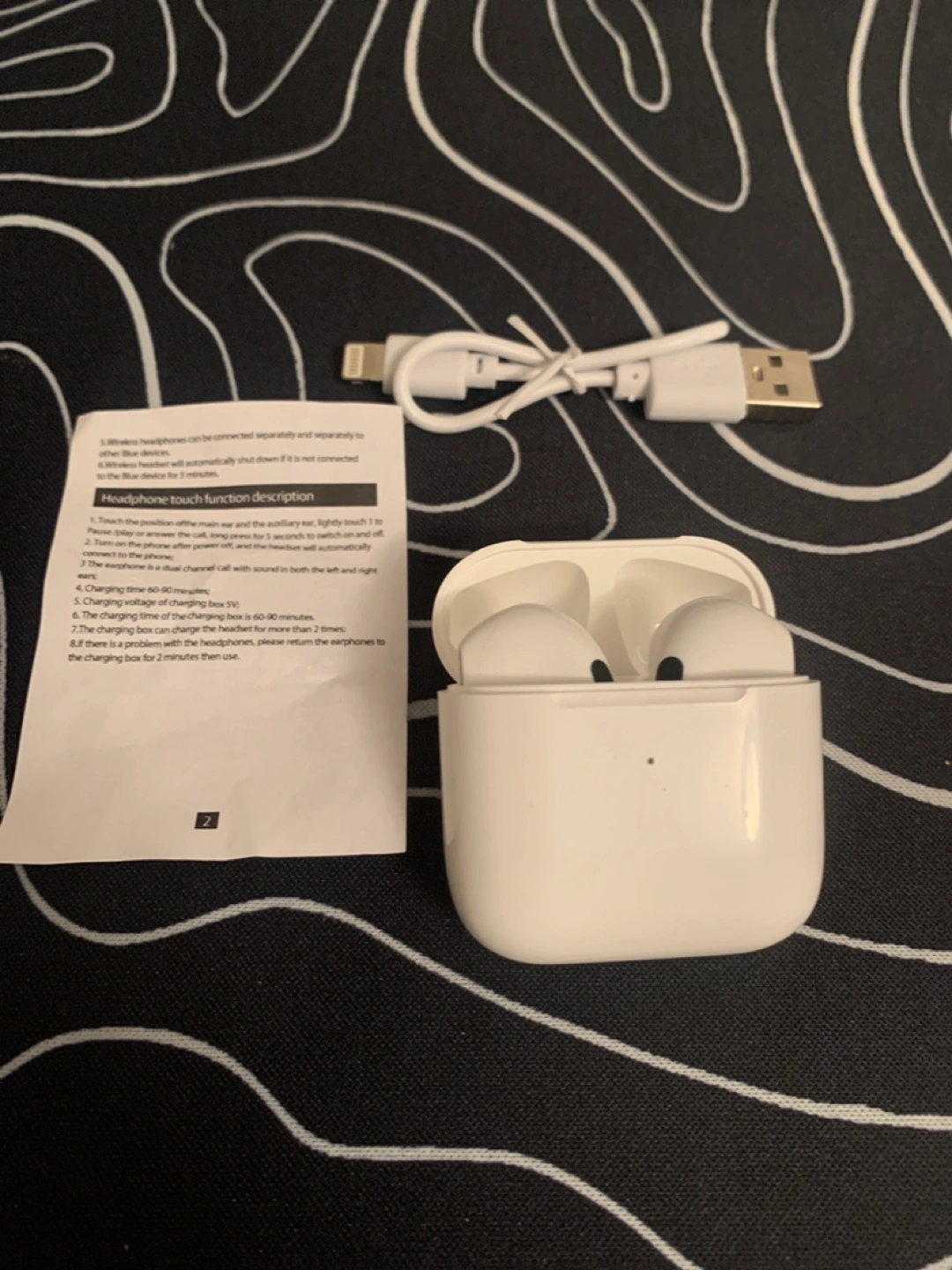 White wireless earbuds. Includes charging case and USB charging cable. Instructions included. brand new