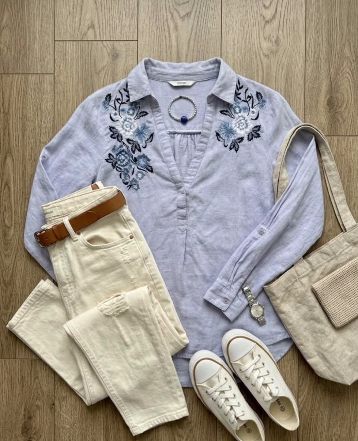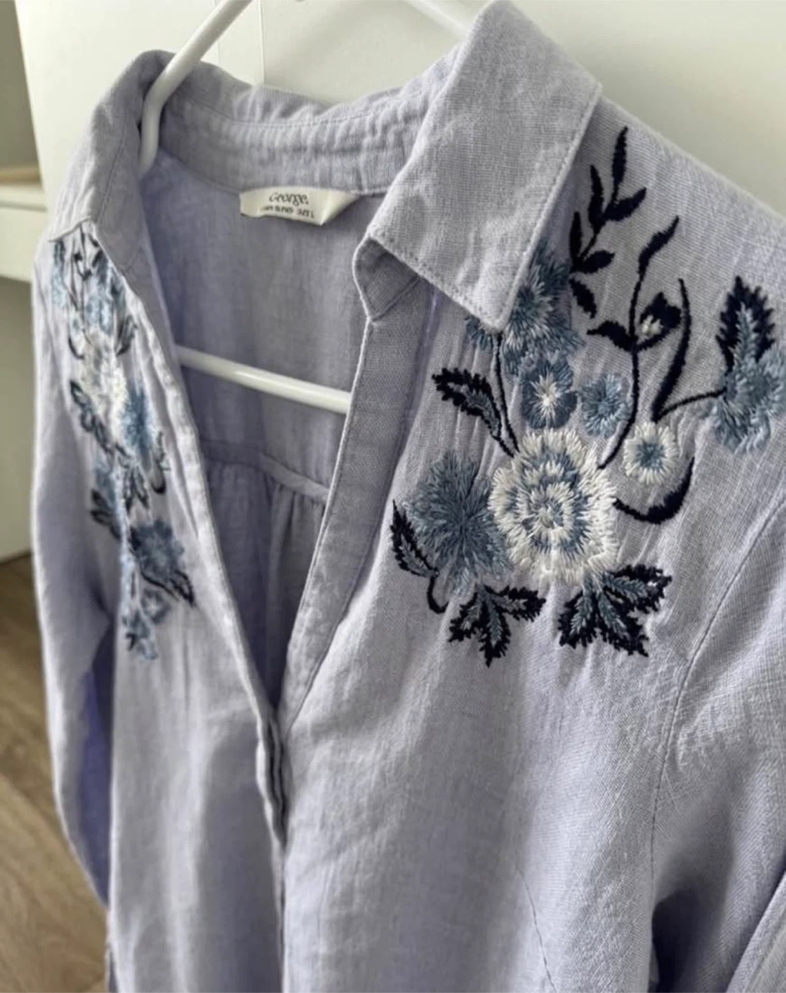 -Exquisite Detail: Features beautiful floral embroidery in shades of indigo and white across the shoulders.