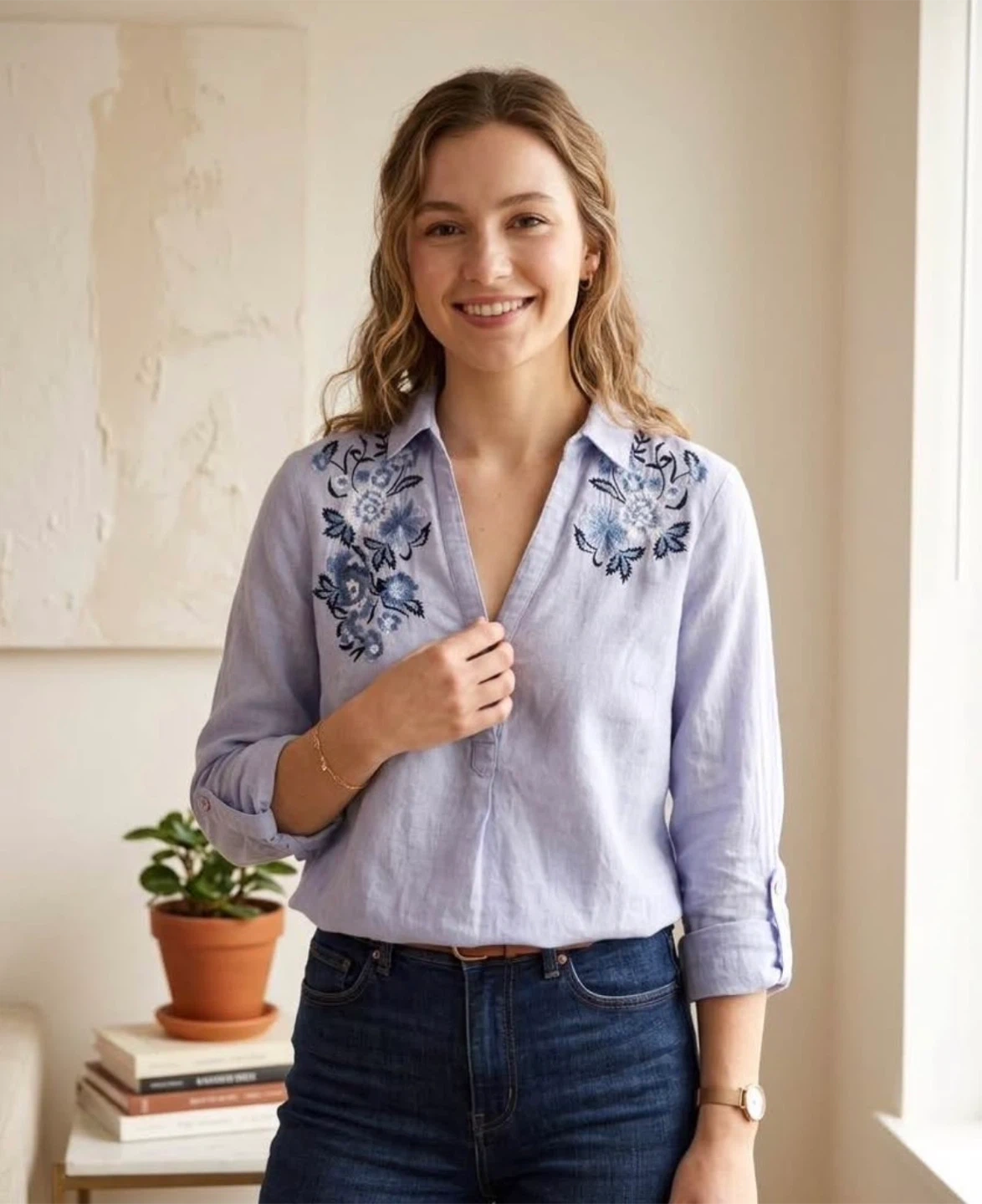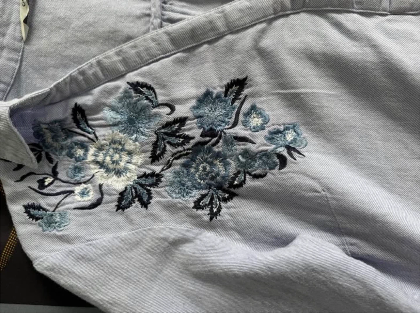 -Exquisite Detail: Features beautiful floral embroidery in shades of indigo and white across the shoulders.