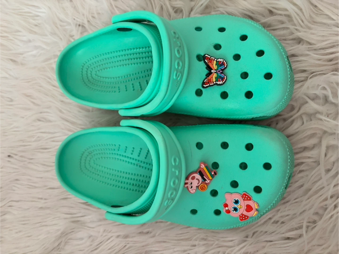 Kids' turquoise Crocs clogs decorated with fun Jibbitz charms including a butterfly and an owl. These shoes are made from Croslite material for comfort and easy cleaning. They're perfect for active kids who love to play outdoors! they are size 4 in mens, 6 in womens