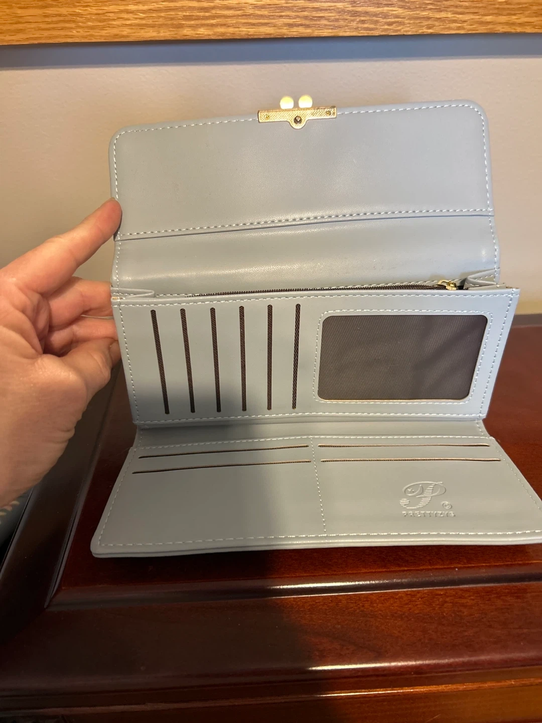 This PRETTYINS LUCKY wallet has a floral design on the top flap and a grey faux leather exterior. It features multiple card slots and a zippered coin pocket. It's a stylish accessory for everyday use!