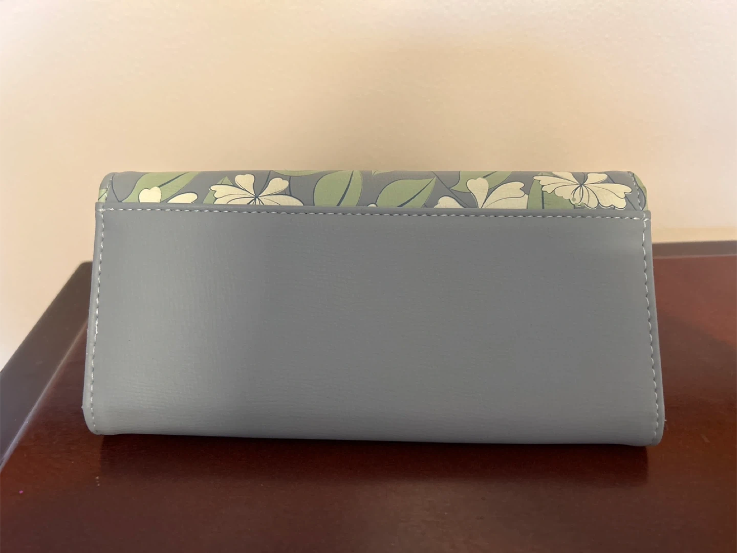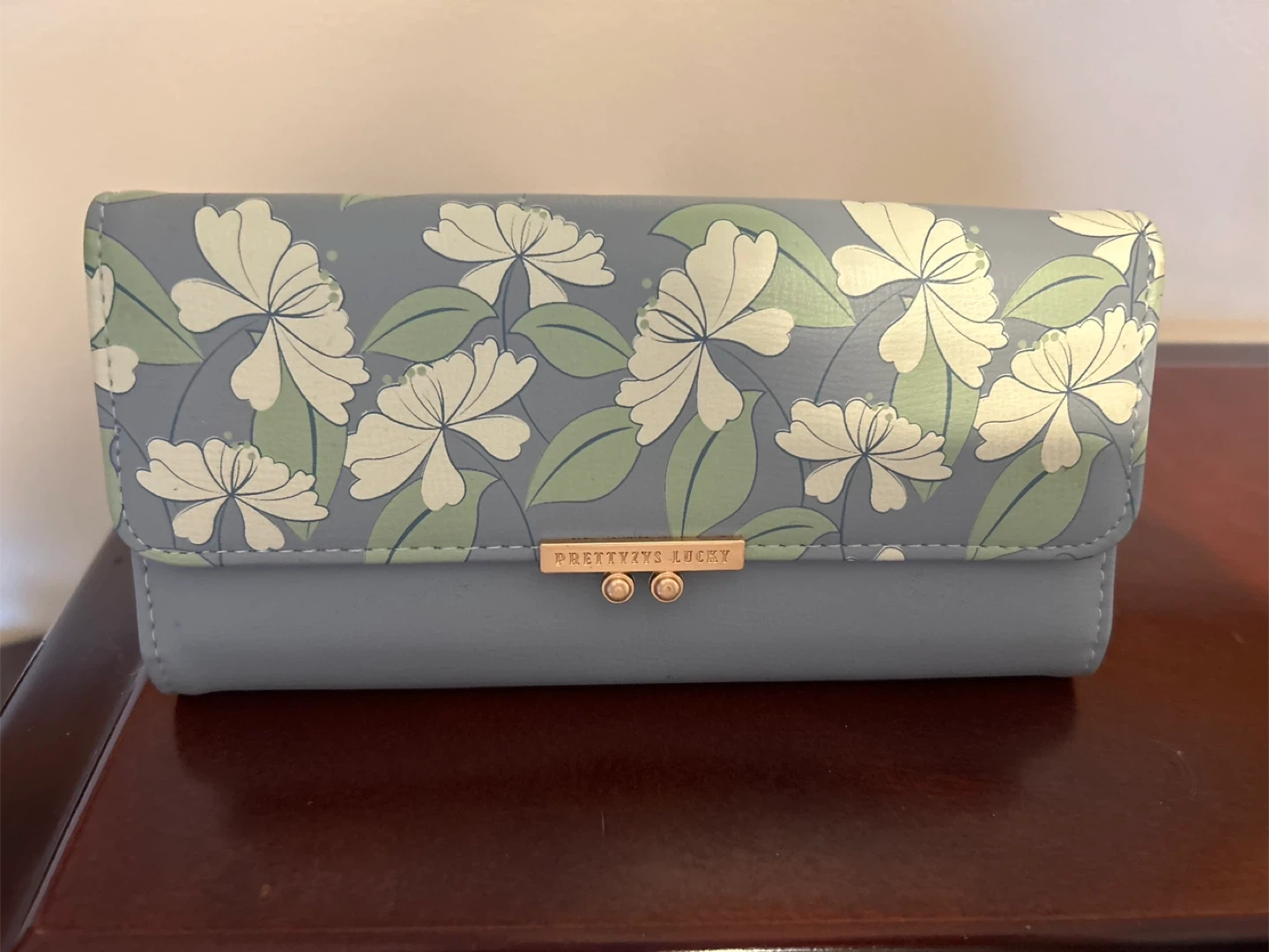 This PRETTYINS LUCKY wallet has a floral design on the top flap and a grey faux leather exterior. It features multiple card slots and a zippered coin pocket. It's a stylish accessory for everyday use!