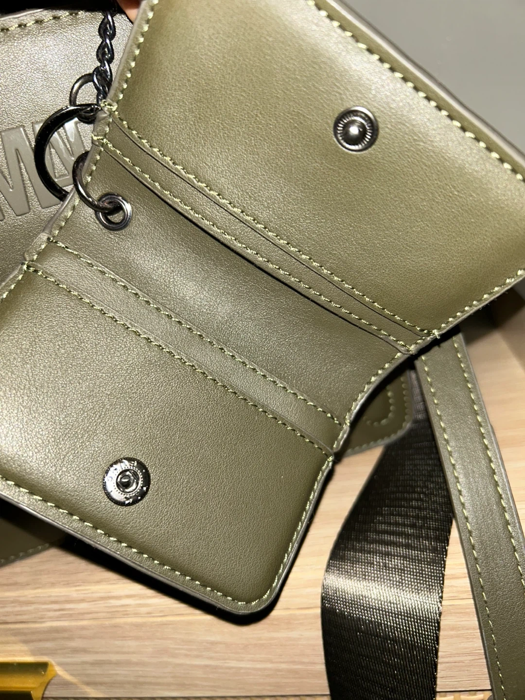 This Steve Madden crossbody bag is in great condition and ready for a new owner! It's a stylish olive green color, perfect for everyday use. The bag features a detachable card holder and adjustable straps. It has both a zipper and a snap closure. i only take out the price