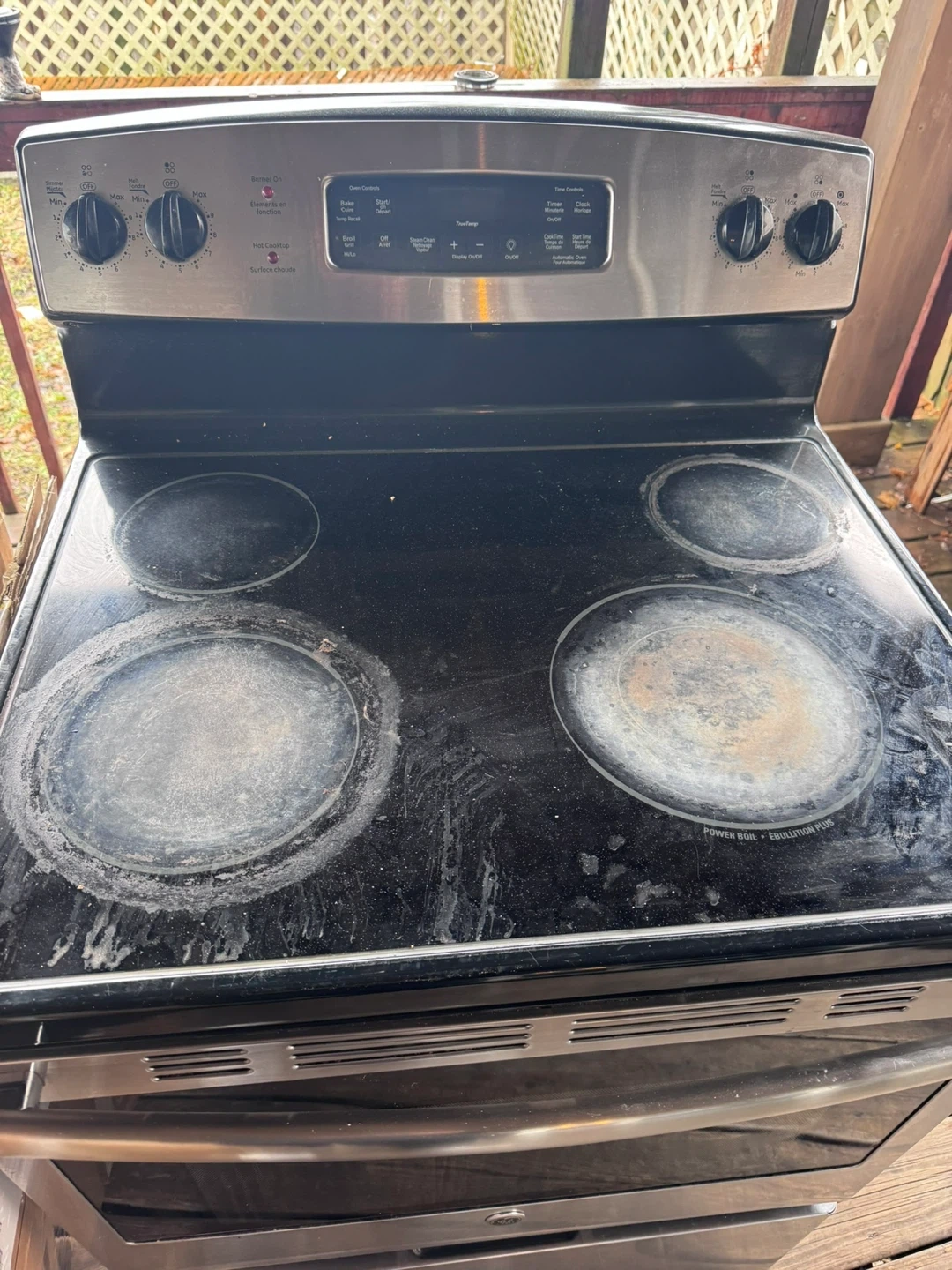 Black electric range with four coil burners one needs replacing. Features a glass cooktop and an oven. Ideal for everyday cooking needs. $50