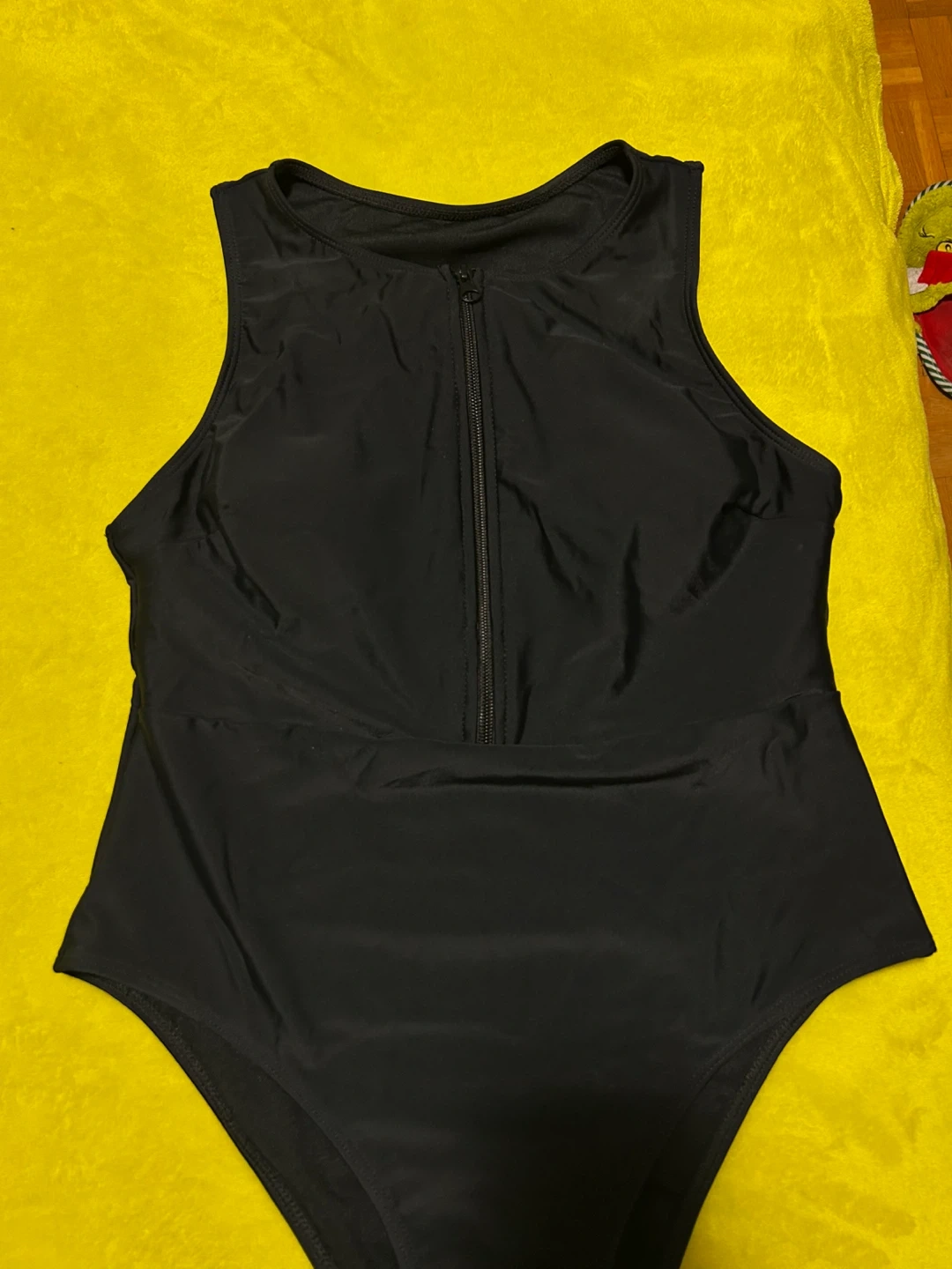 This black one-piece swimsuit features a front zipper closure and a racerback design. It's made of a stretchy material for a comfortable fit. Perfect for swimming or lounging by the pool!
