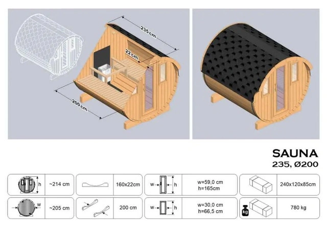 Manufactured sauna kits use 42mm (1-7/8″) logs for the barrel walls & 28mm (1-1/8″ logs for the end walls. This model is available in a rough or optional oval design. Produced of Baltic Spruce, an ideal material for sauna’s. This model comes in a flat pack for easy transport and includes the following features: Heating room benches: Thermal wood Pine; Change room benches: Spruce; Door: Full glass tempered with hardware, door frame Alder, adjustable straps; Roofing: Black asphalt shingles; Stove Guard: Thermal wood Pine; Heater Area: Insulated protector for the floor & wall; Cradles: Spruce; Assembly: Can be assembled by 2 people in 1 day; Heater: Vevor wall mount 6KW stove 220V-240V with internal controller. (sauna stones not included). Stainless steel, corrosion-proof, stainless steel heating coil, 86 degrees – 230 degrees F (30-110 C). For Sale By: Owner.