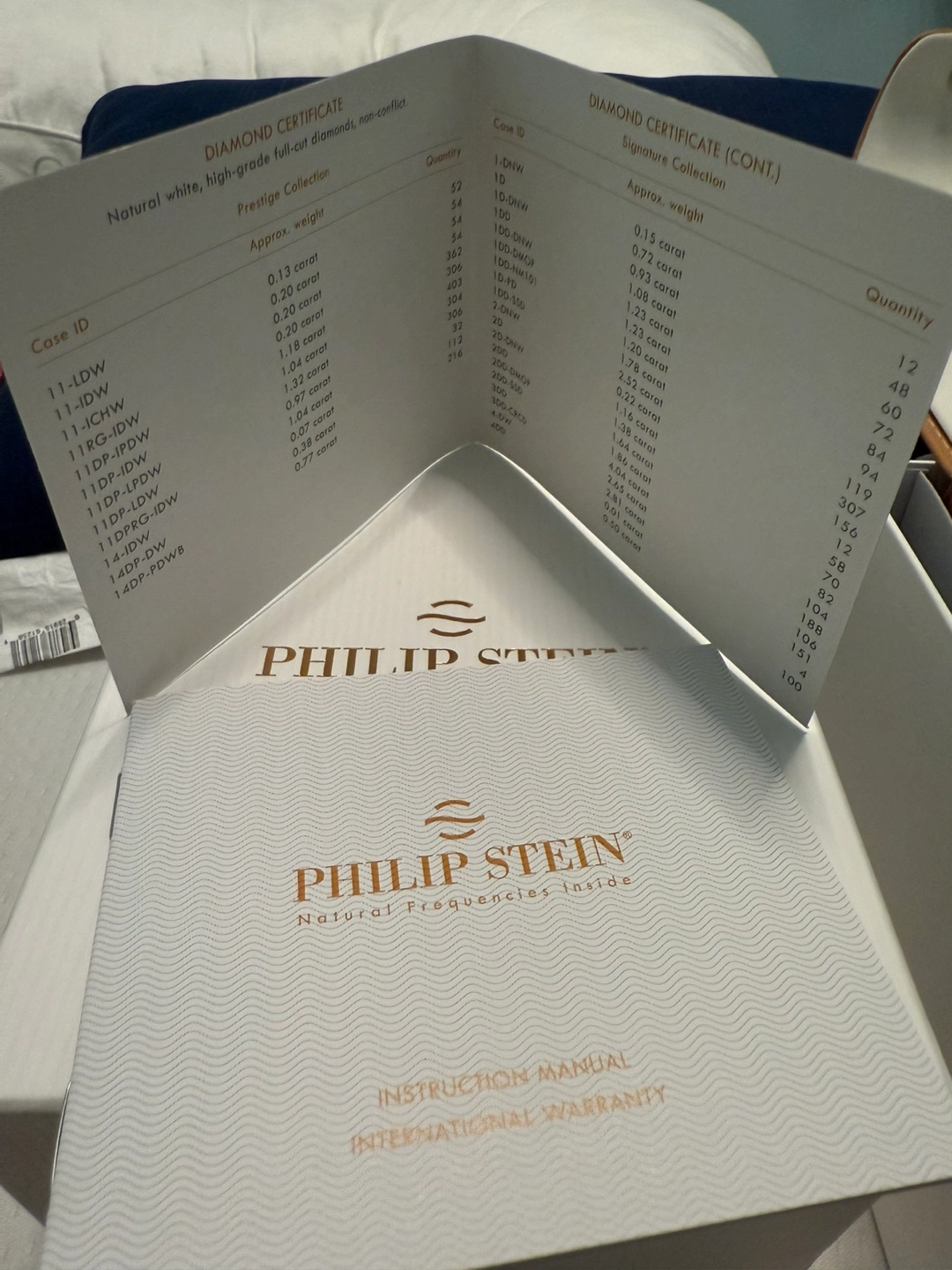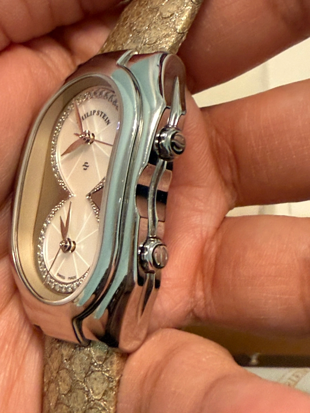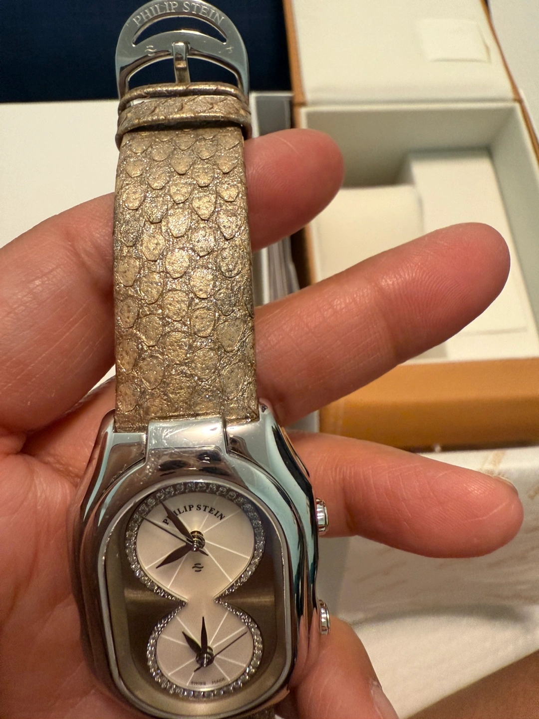 Elegant Philip Stein women's watch. Features a unique dual time design. Stainless steel case and beige leather band. Swiss made. Comes with original box.