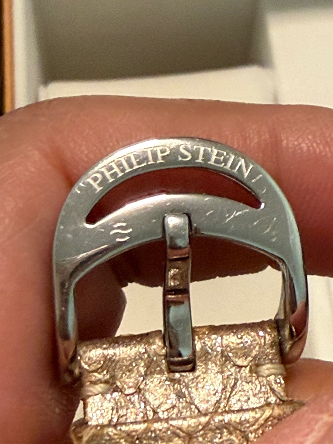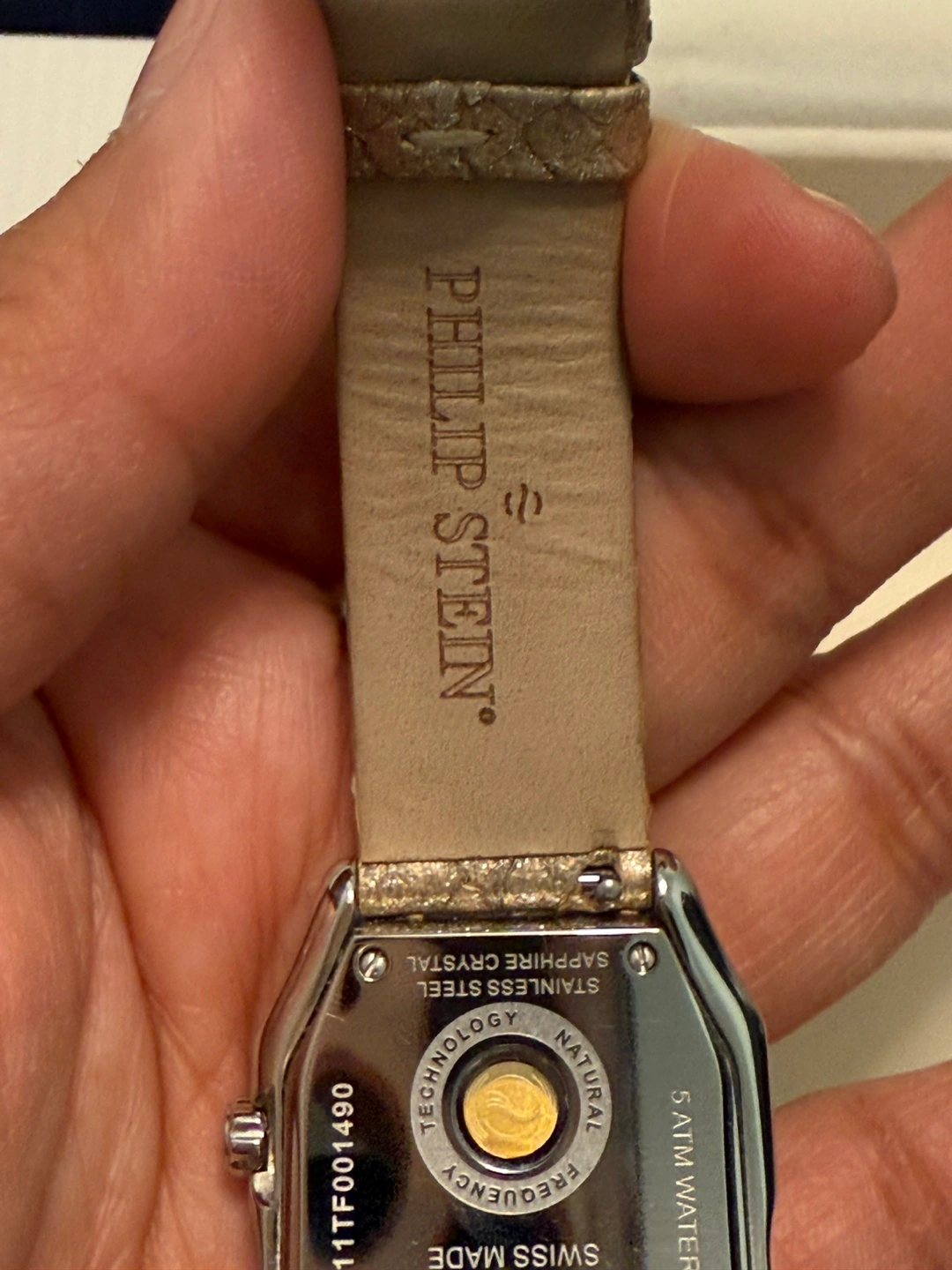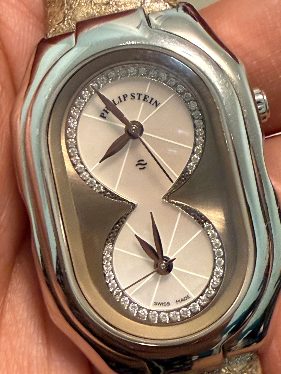 Elegant Philip Stein women's watch. Features a unique dual time design. Stainless steel case and beige leather band. Swiss made. Comes with original box.