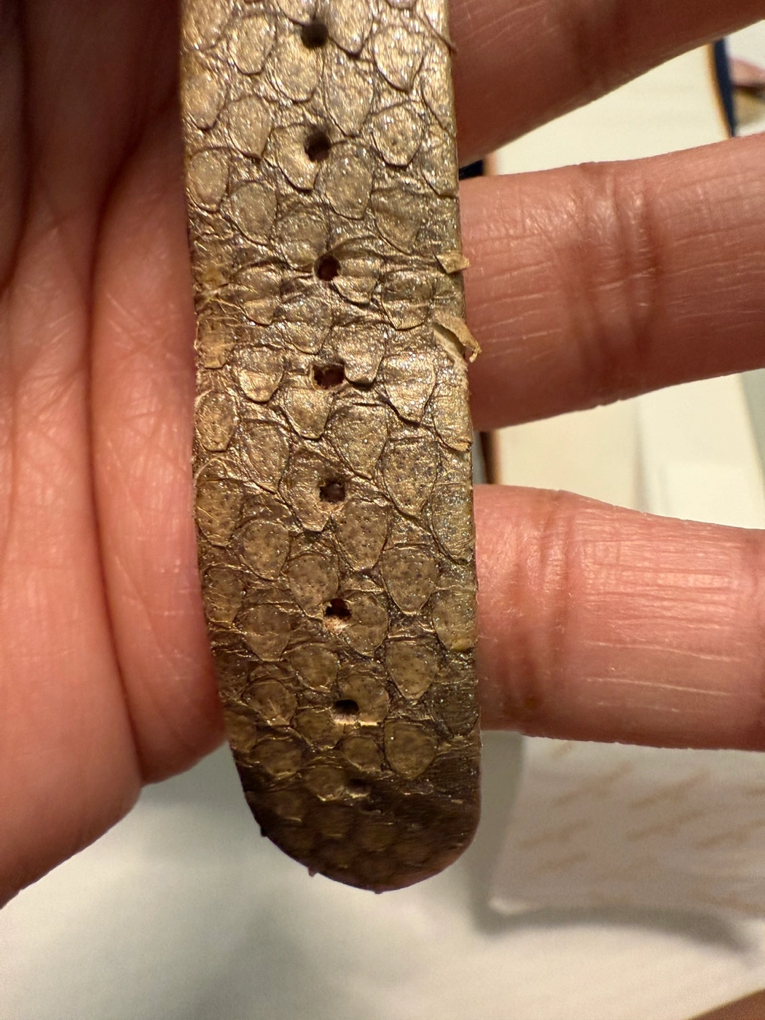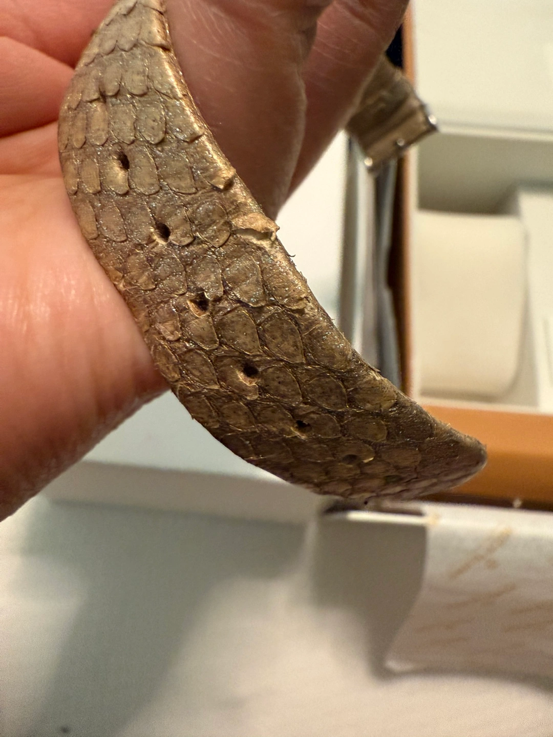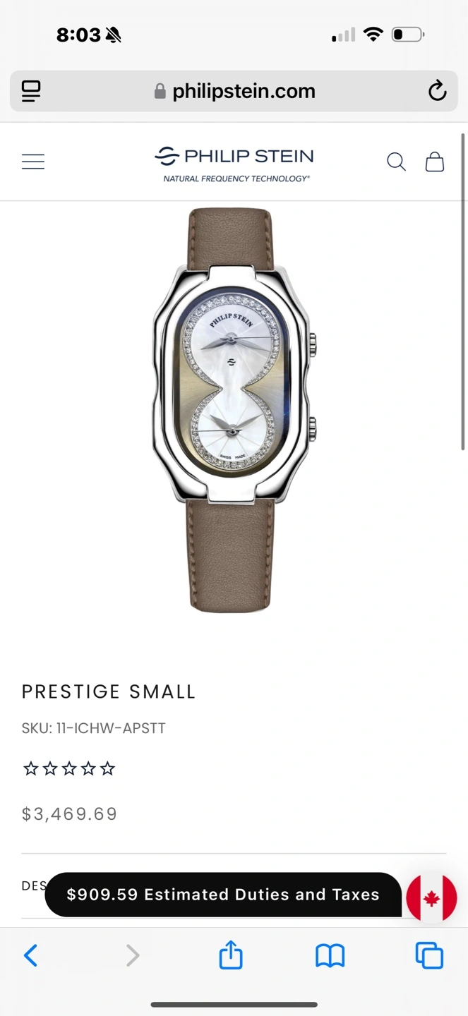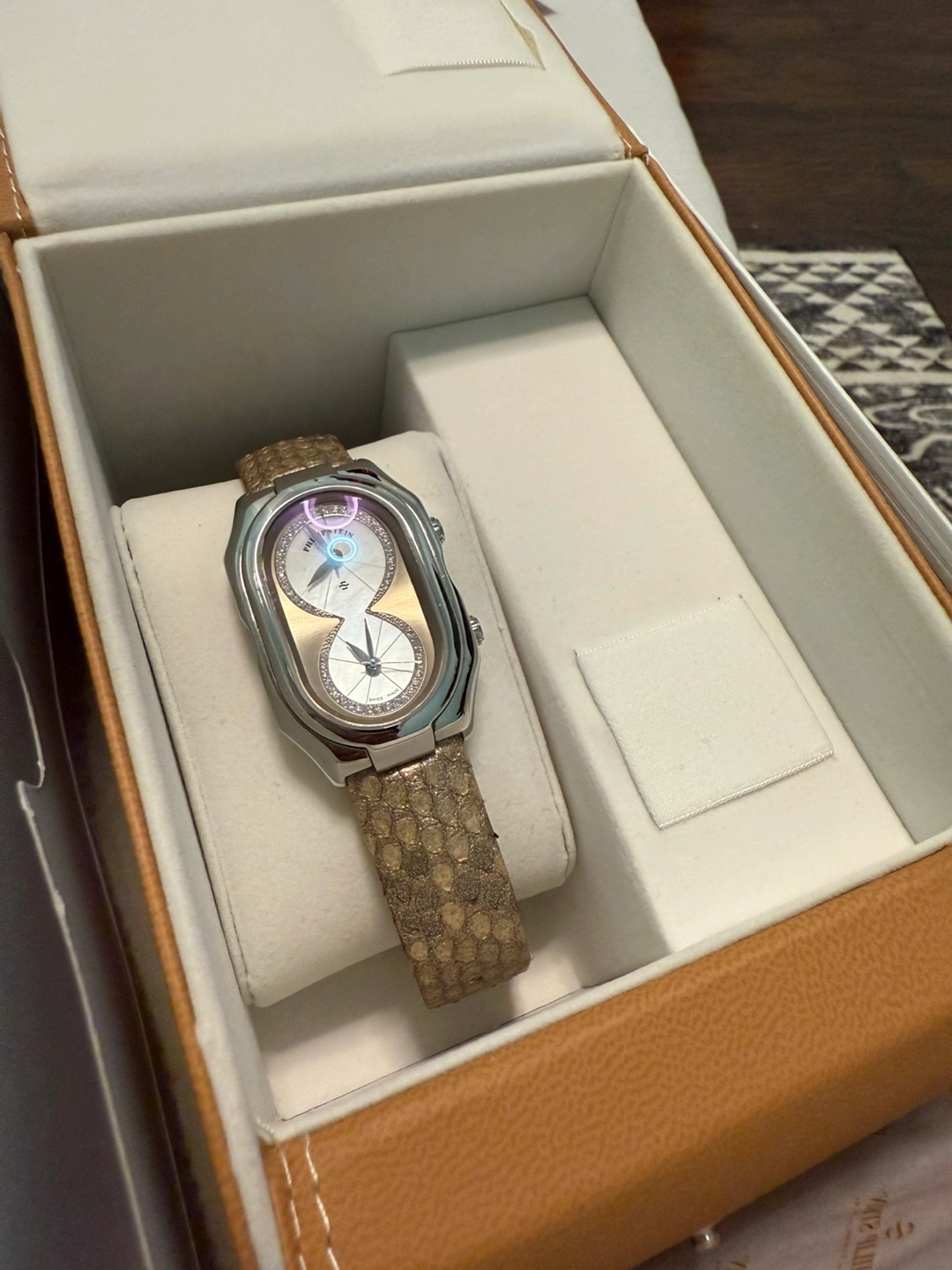 Elegant Philip Stein women's watch. Features a unique dual time design. Stainless steel case and beige leather band. Swiss made. Comes with original box.