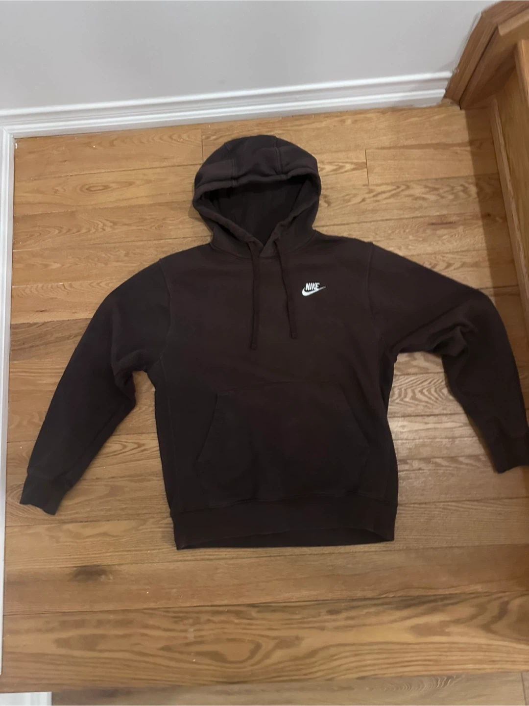 This is a Nike hoodie and matching sweatpants set in a deep brown colour. Both pieces feature the iconic Nike logo. They're made for comfort and casual wear.