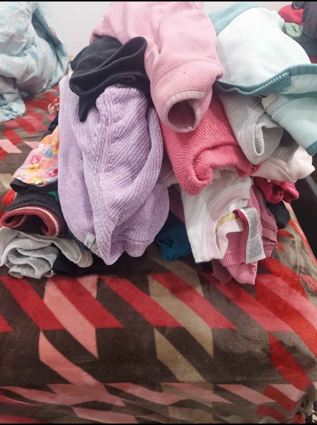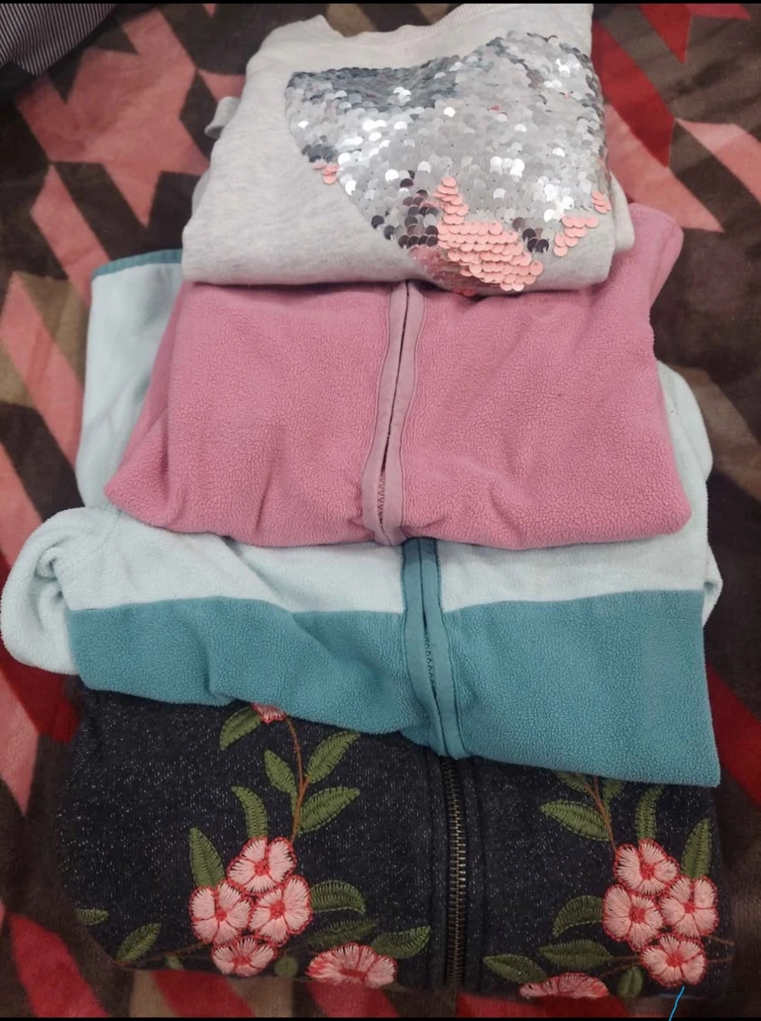 Bundle of cozy fleece jackets and graphic tops,Tshirt lowers for girls age 6 to 7 years. More then 40 cloths Big Bag Includes various colours like pink, purple, and teal. Some tops feature fun designs and sequins. Zippers and closures all appear to be in good working order.