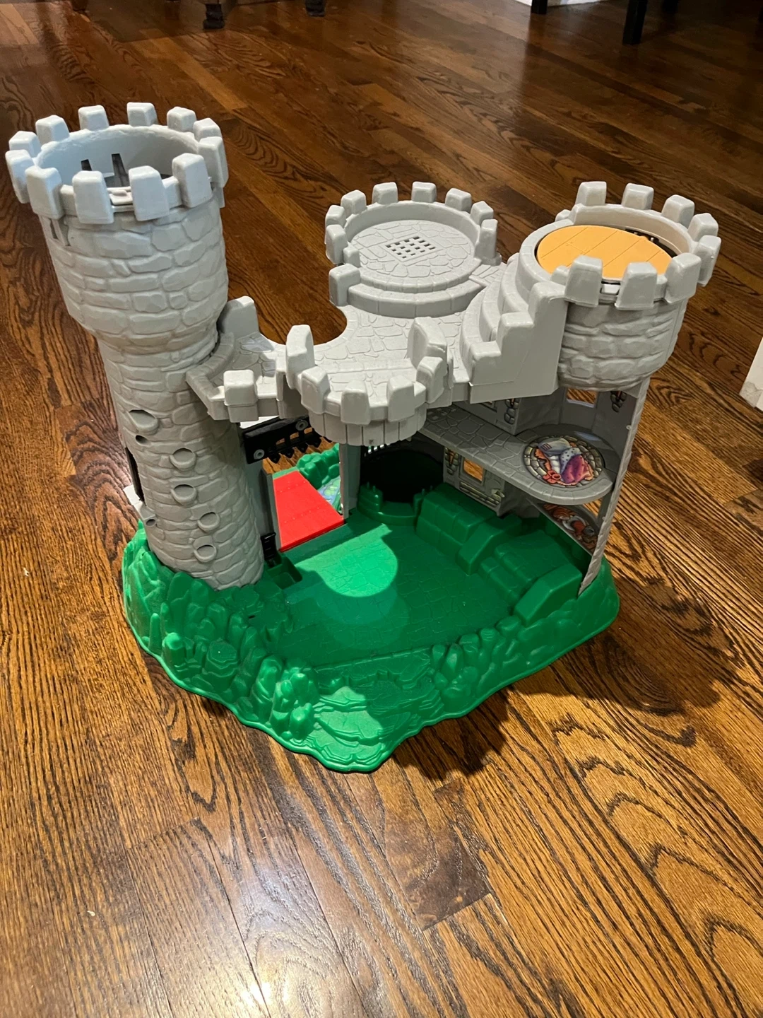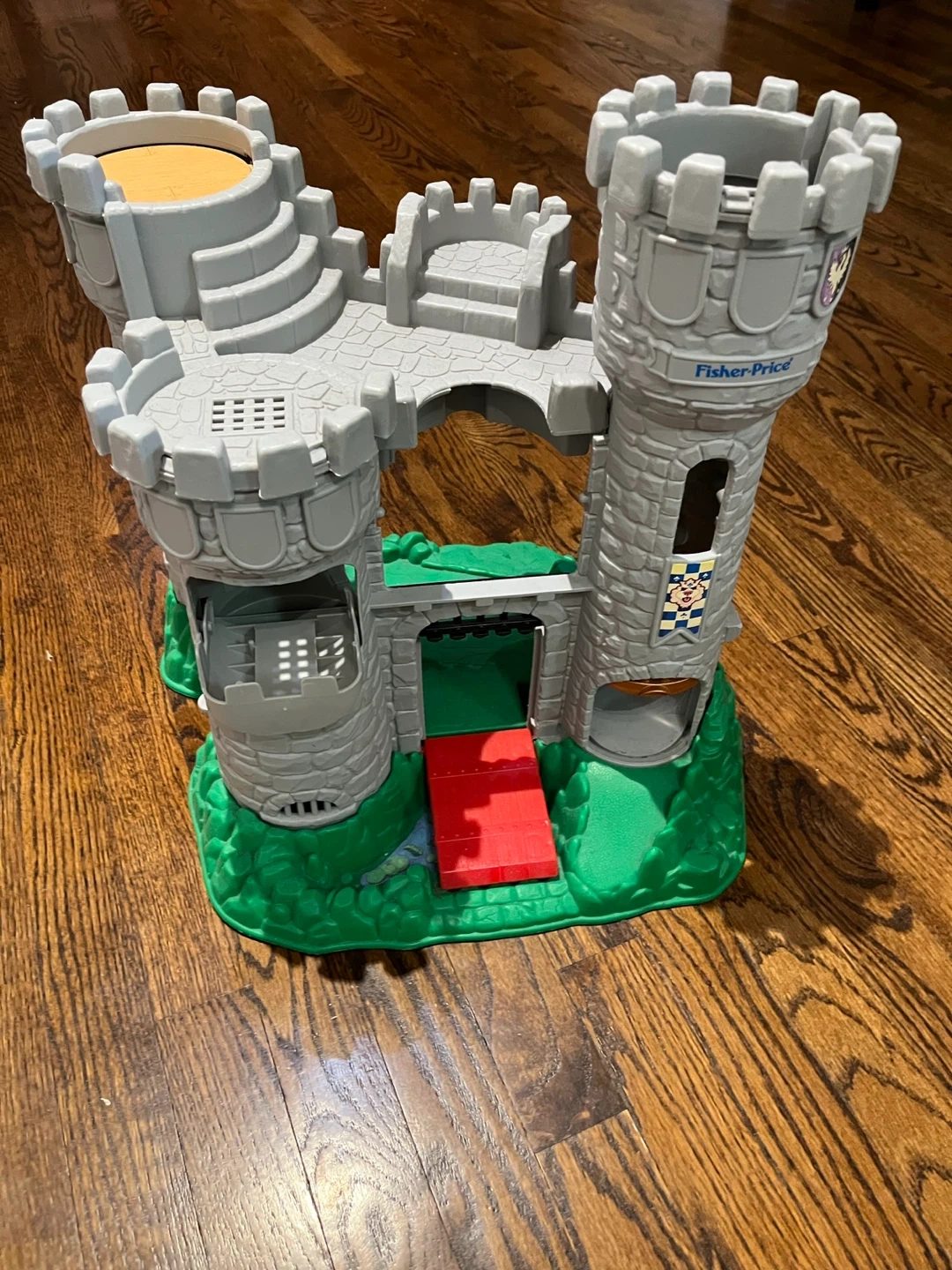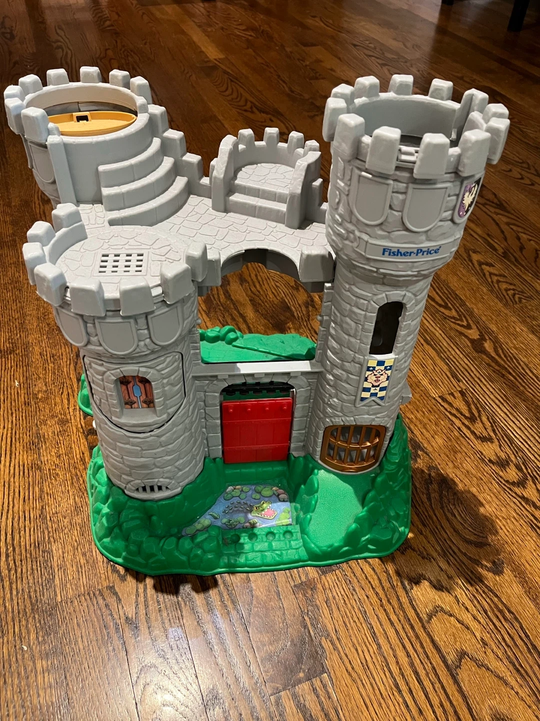 This is a Fisher-Price Little People castle playset. It's made of grey plastic with a green base and a red door. It includes multiple towers and ramps for imaginative play.