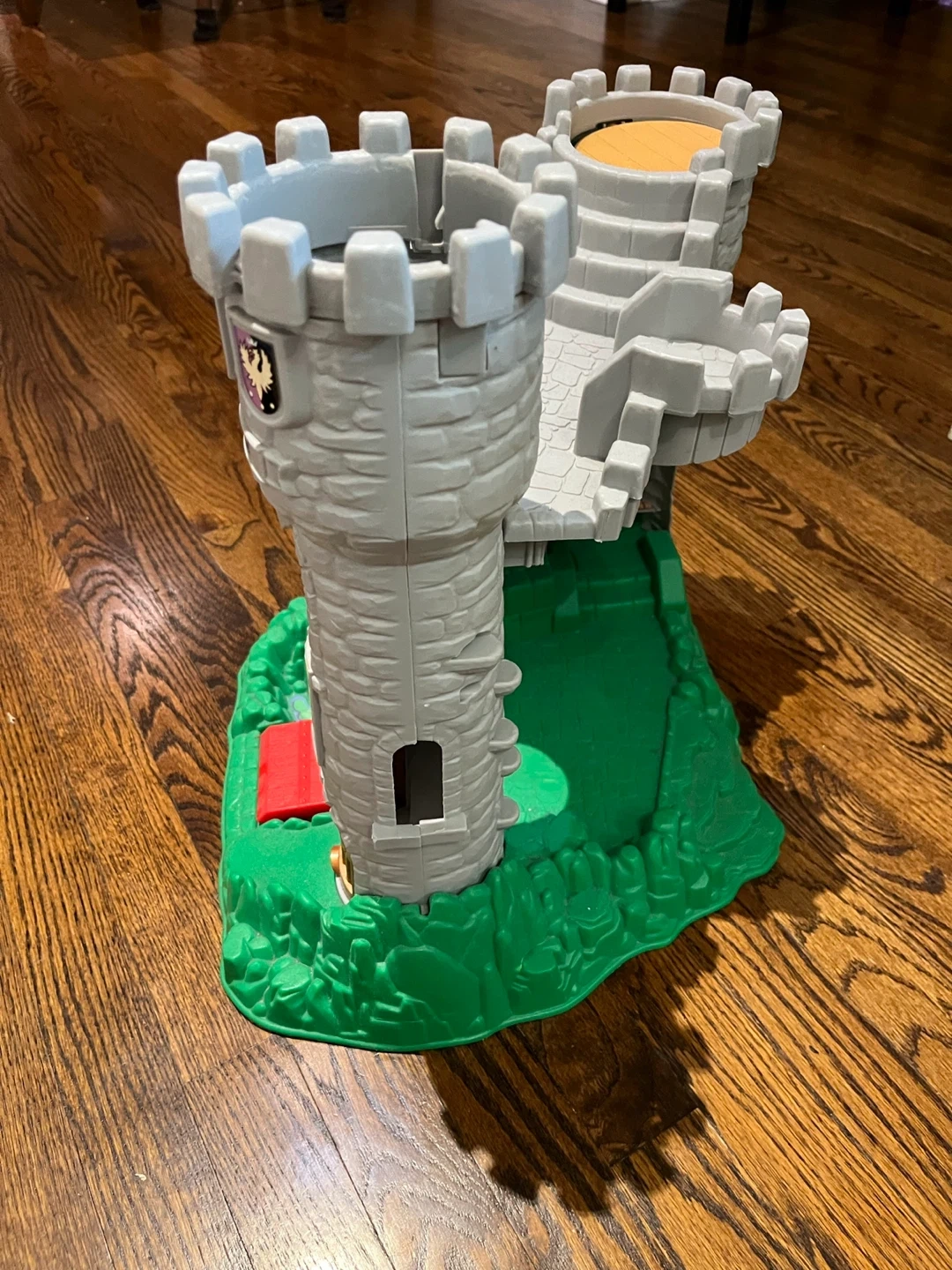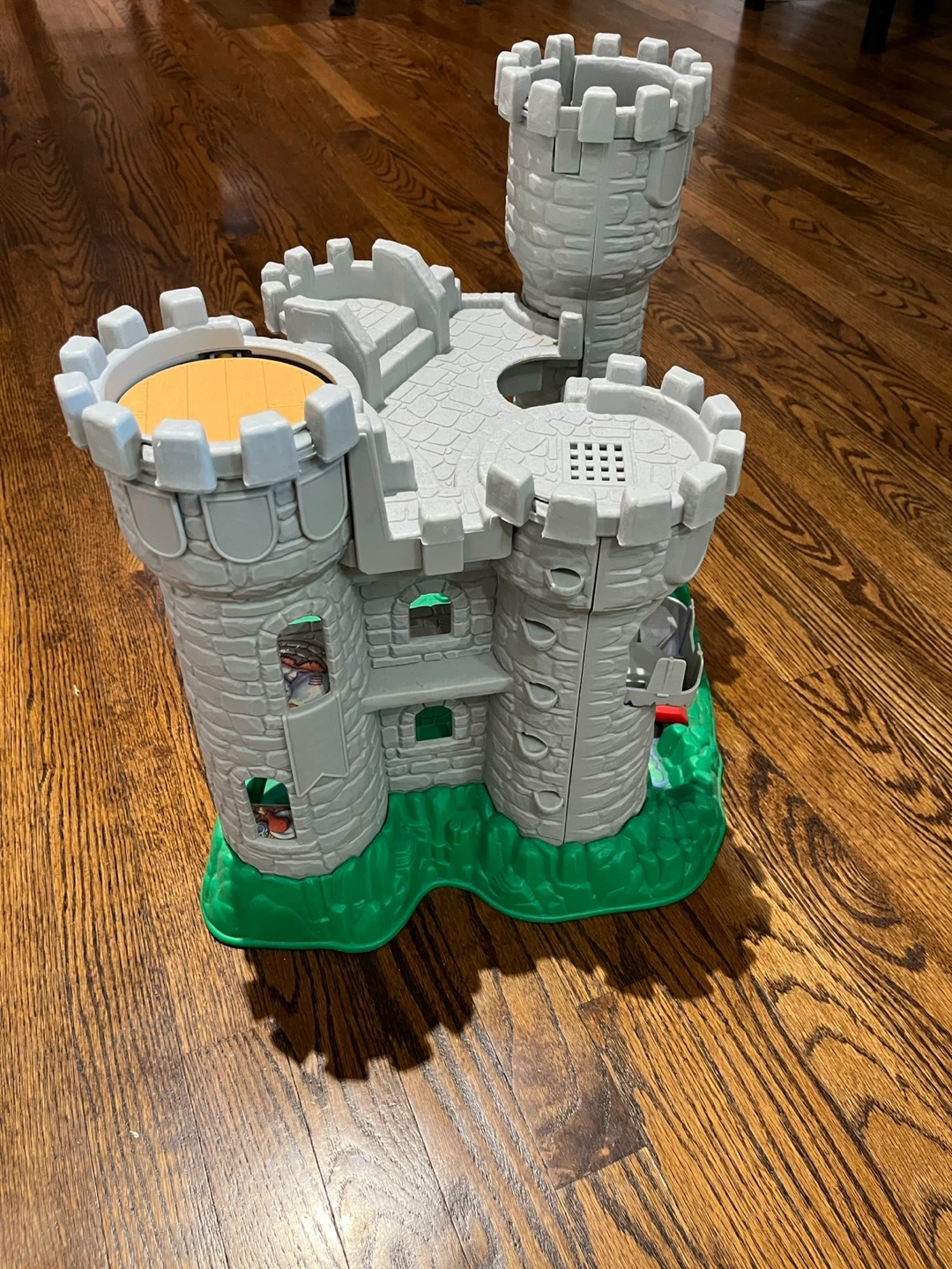 This is a Fisher-Price Little People castle playset. It's made of grey plastic with a green base and a red door. It includes multiple towers and ramps for imaginative play.