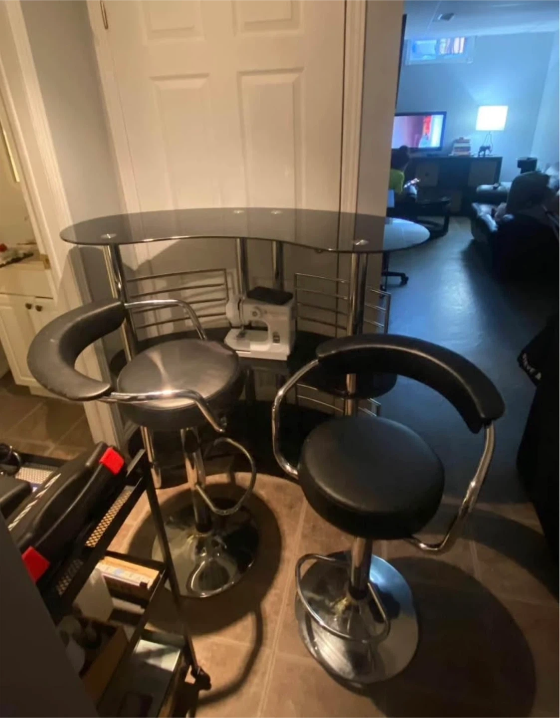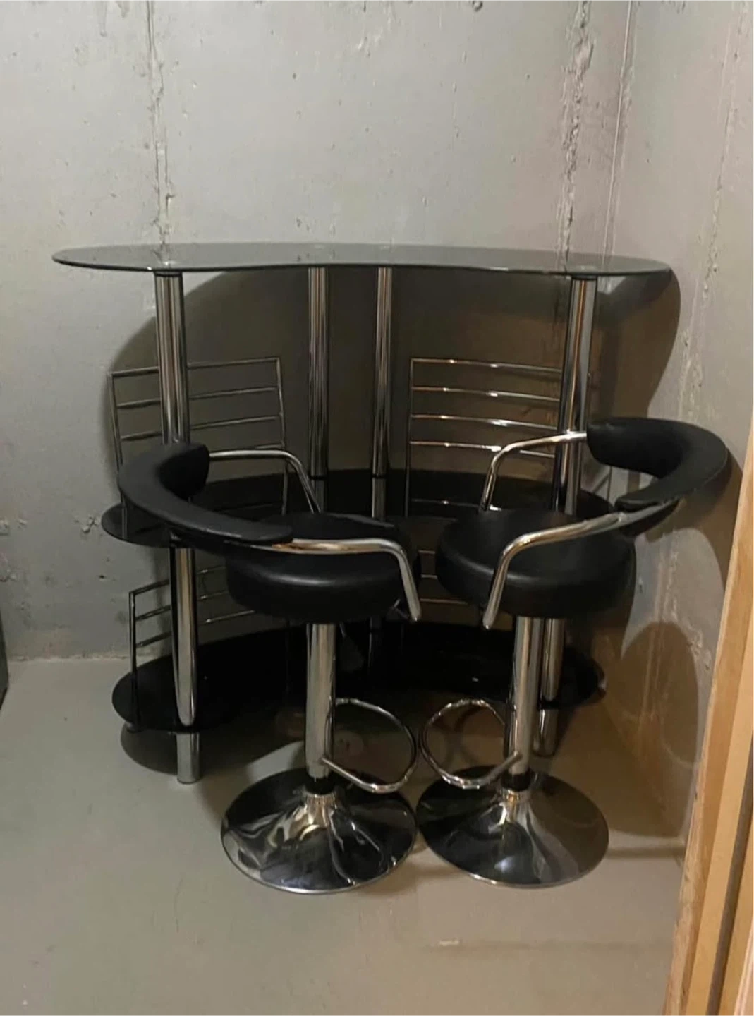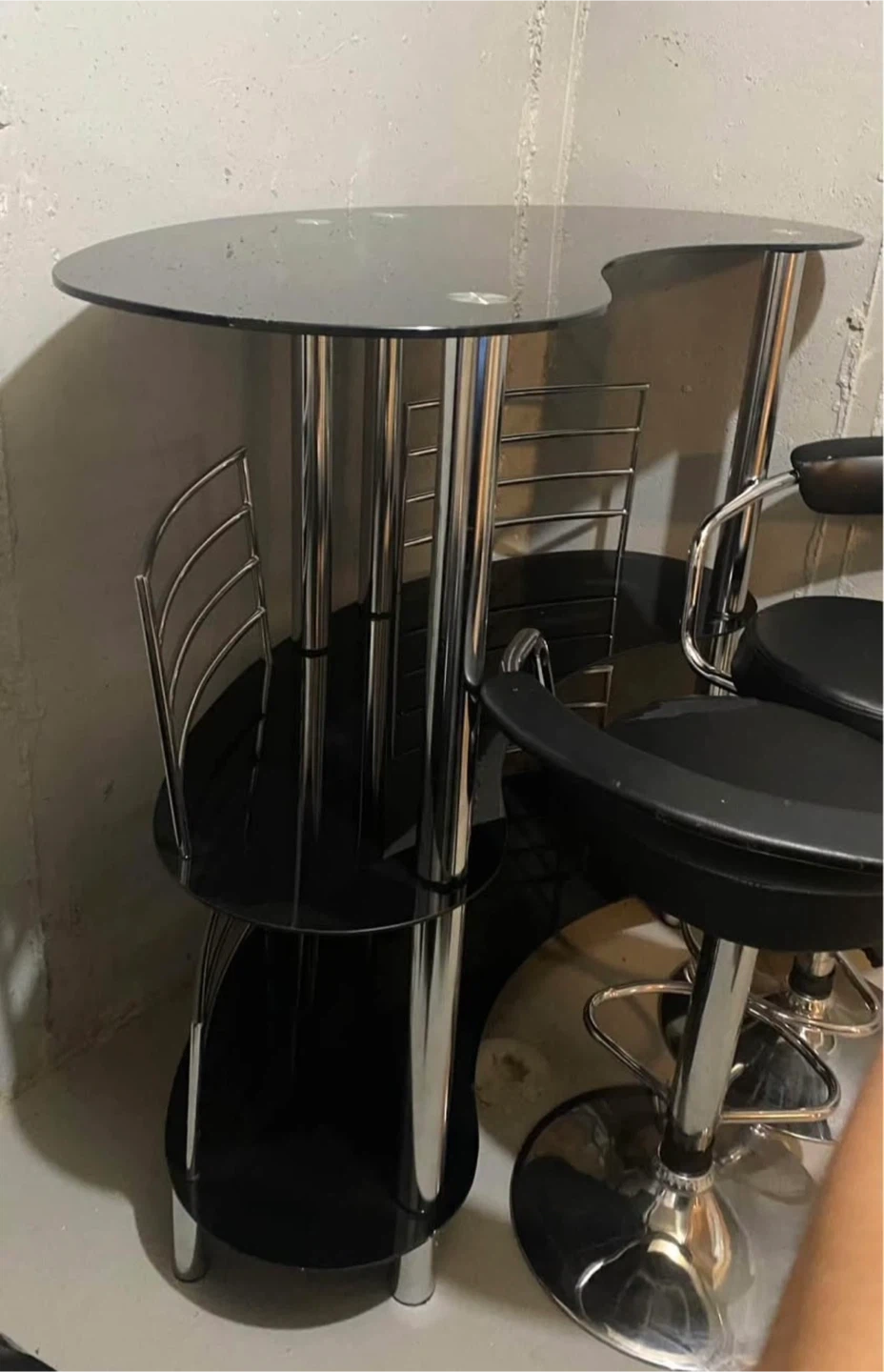 Selling a bar table with two swivel chairs. The table has a black glass top and chrome accents. The chairs are black with chrome bases. Great for a small space or adding a touch of style to your home!