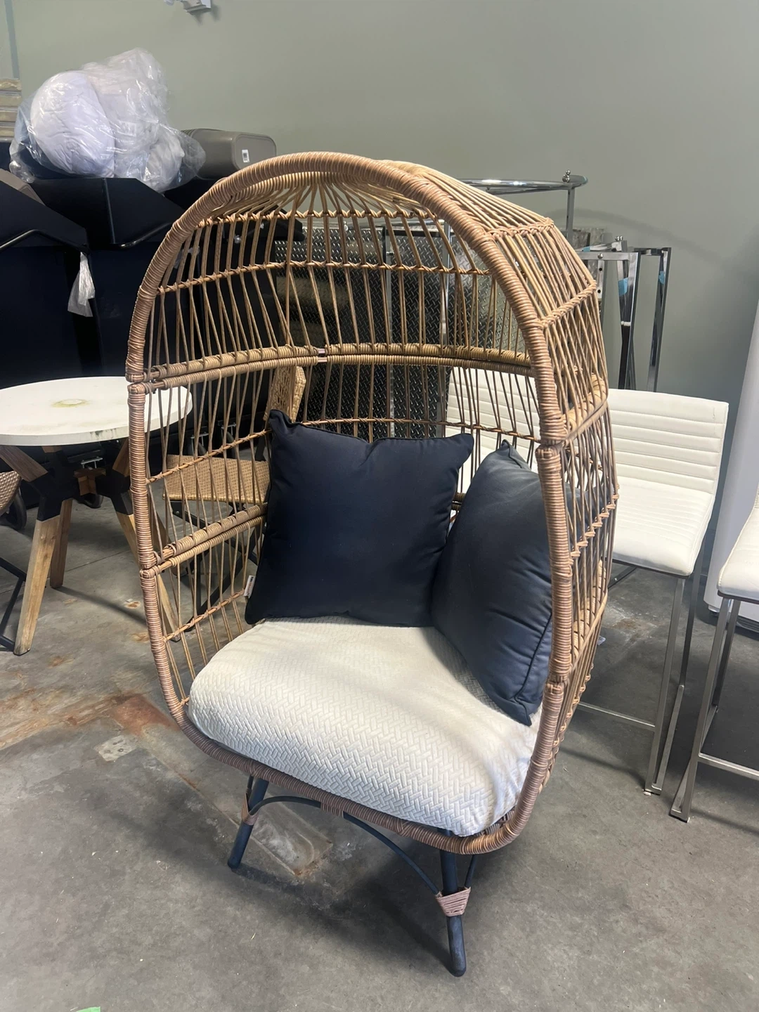 This stylish egg-shaped chair features a durable wicker construction and comes with plush black and white cushions. Its unique design makes it a perfect accent piece for any living room or patio. The chair offers a comfortable and cozy spot to relax.